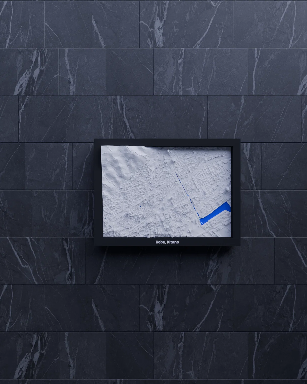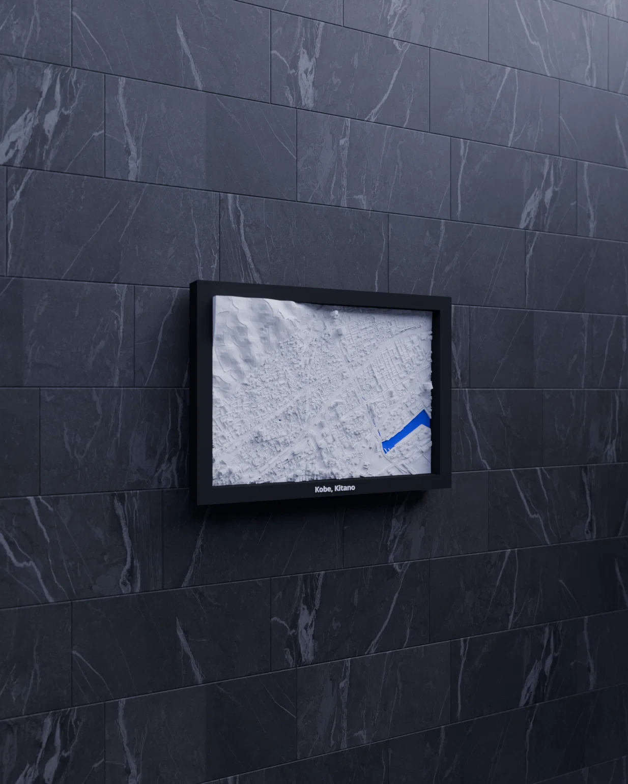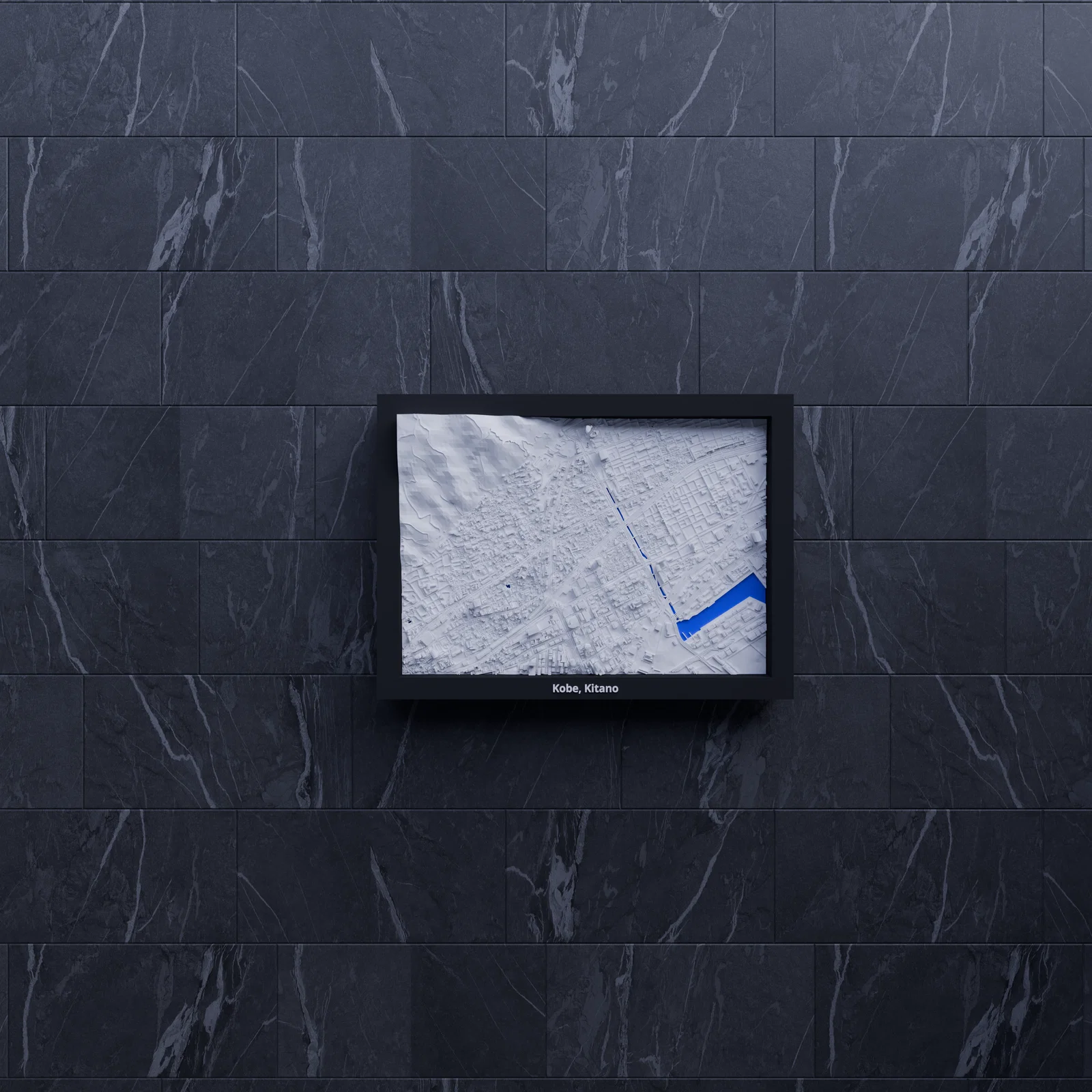 Mô hình thu nhỏ địa hình 3D tái hiện Kobe, Kitano (Nhật Bản) từ dữ liệu địa lý thật, thu nhỏ từ 2.859 x 1.995 km xuống 170.5 x 119.5 mm. Có nhiều lựa chọn khung và print profile (multicolor/single).