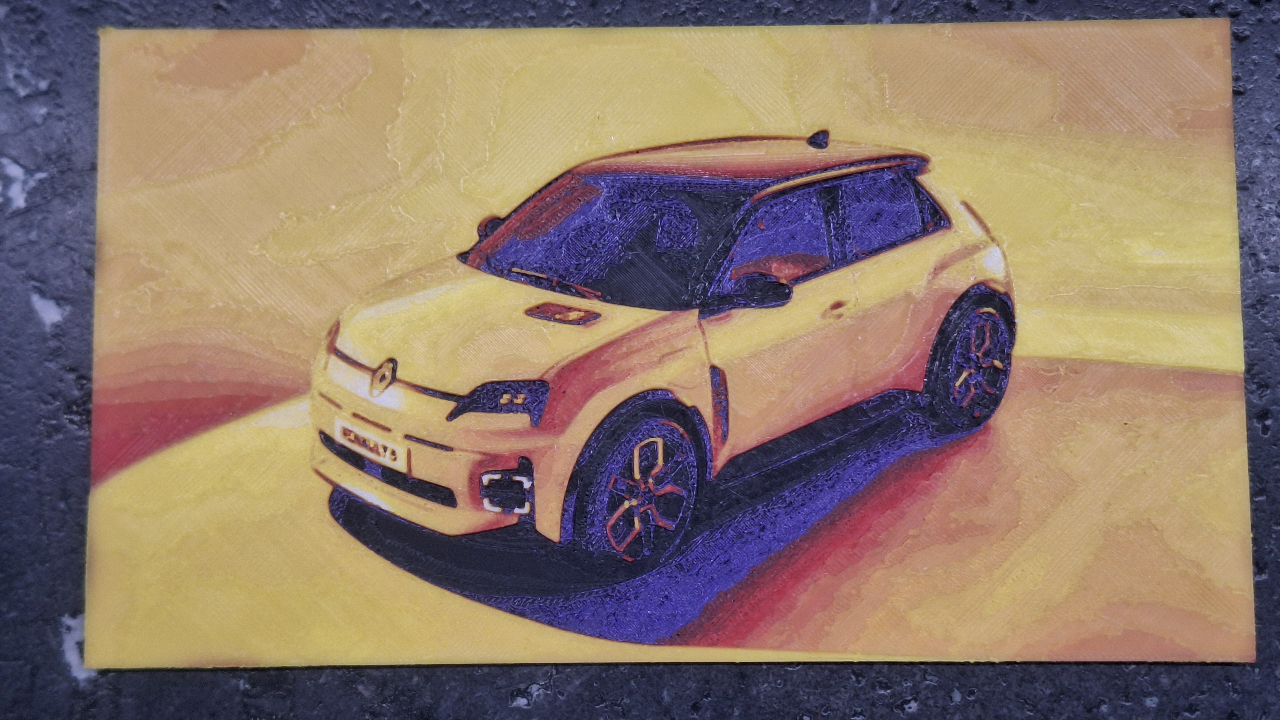 Mẫu Renault R5 E-Tech Hueforge. Thông số in cho ảnh: layer đầu 0,16mm, các layer sau 0,08mm; đổi màu theo mốc 0,88/1,28/1,60/2,48mm với Prusament Black, Purple, Lipstick Red, Pineapple Yellow; phần còn lại Pristine White.