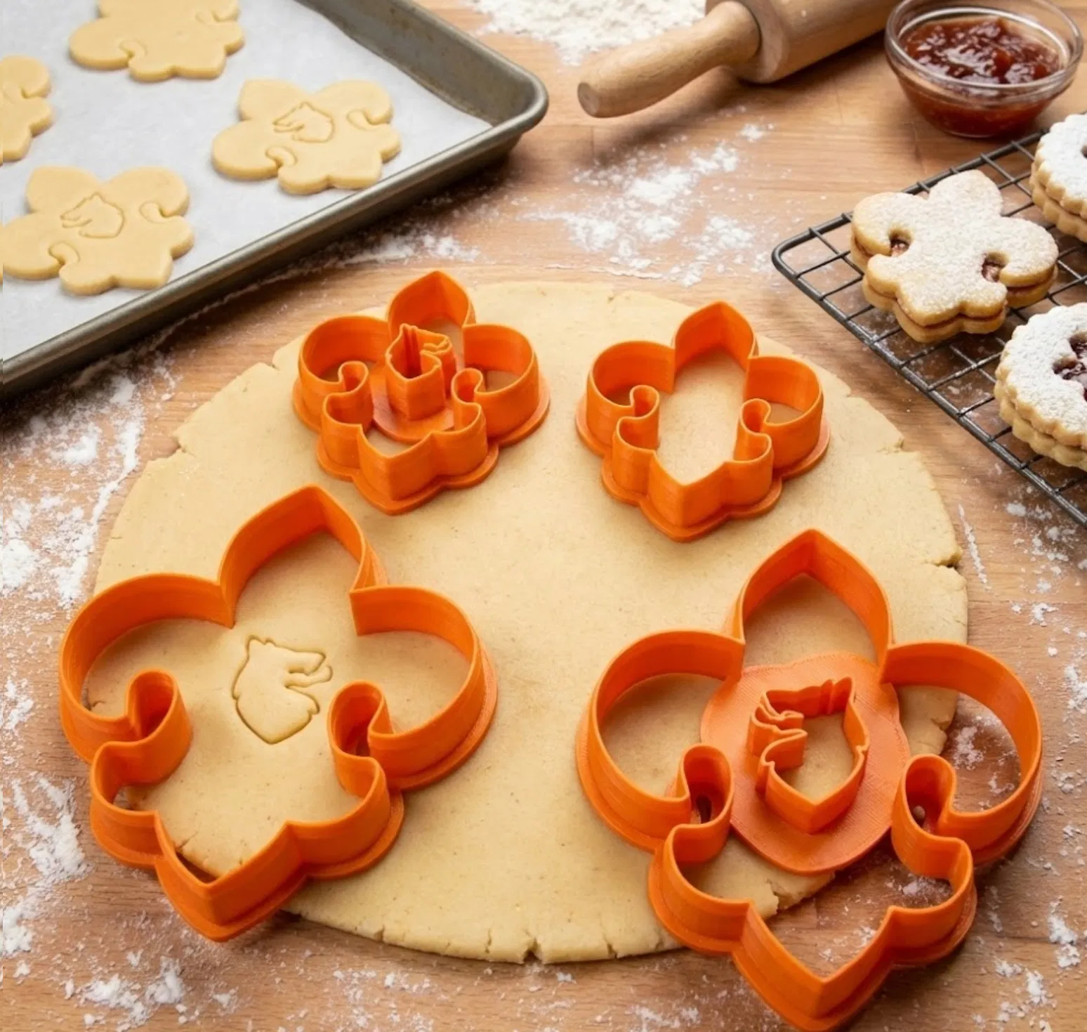 Bộ khuôn cắt bánh Scout fleur-de-lis chính xác, có 2 kích cỡ (50x58 và 73x86 mm). Gồm bản lili đặc và bản có phần cắt rỗng để làm bánh Linzer kẹp mứt. Tối ưu mép cắt sắc, đế chắc; khuyên dùng PETG/PLA food-safe.