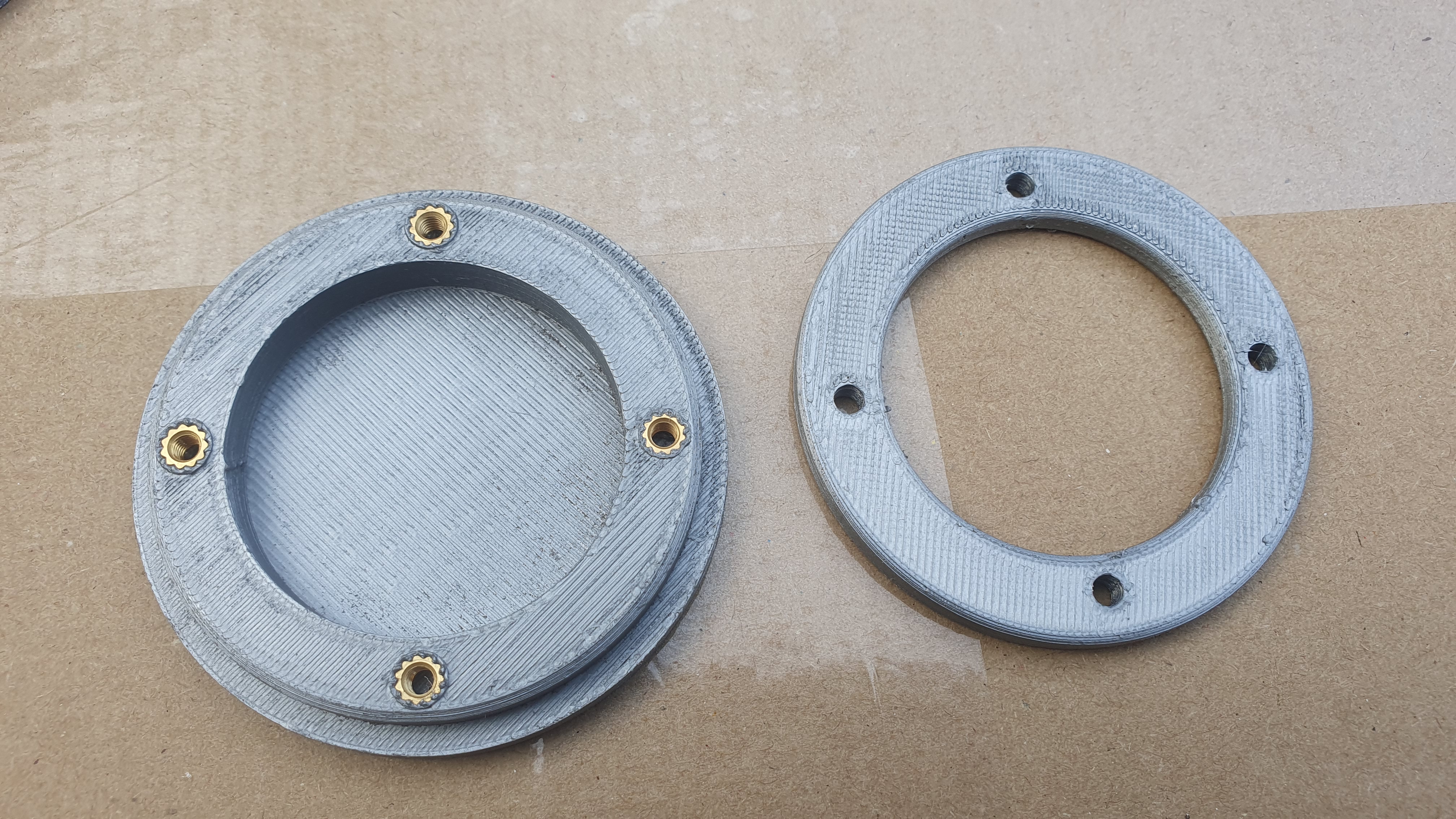 Nắp zin là dạng gài (clip-in). Mình có thử làm lại kiểu đó nhưng các ngàm gài cứ bị gãy. Bản này được cố định bằng một vòng (ring) bổ sung nằm phía trong mâm, ở sau cái gờ nhỏ mà ngàm thường bấu vào. Hai phần sẽ được bắt vít lại với nhau bằng 4 con M3x10 vào insert kiểu melt-in. Vì vậy bạn cần tháo bánh xe ra mới lắp được nắp.