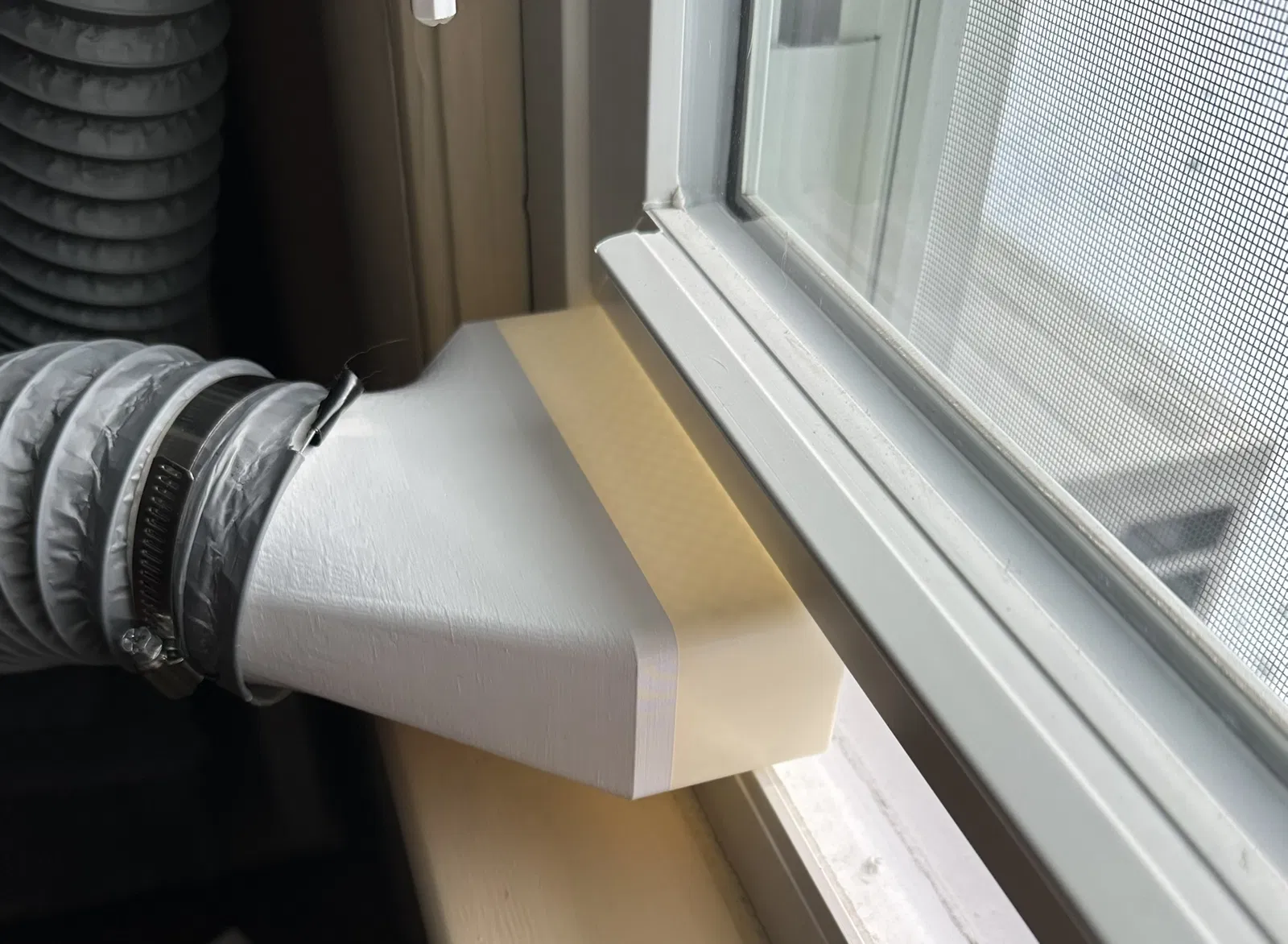 Mẫu cửa thoát gió gắn cửa sổ dạng mỏng cho ống duct 3 inch và 4 inch, giúp đóng cửa sổ lại nhiều hơn so với mẫu cũ. Khuyến nghị in với mặt chữ nhật úp xuống bàn in; bản 4 inch chưa được kiểm thử nên có thể cần supports.