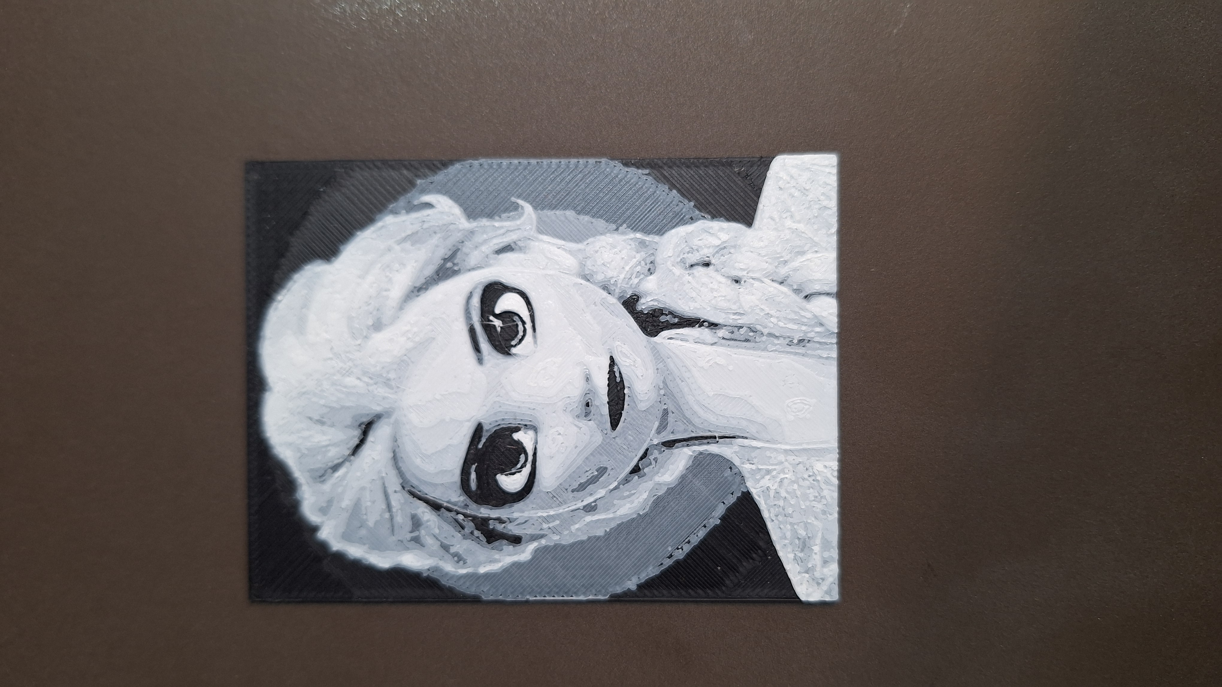 Mẫu Frozen Elsa Hueforge dạng thẻ Hueforge đen trắng kích thước 60x80mm về nhân vật Elsa. Thiết lập in gợi ý: lớp đầu 0,16mm, các lớp sau 0,08mm; 1,04mm đầu in màu đen, còn lại in màu trắng.