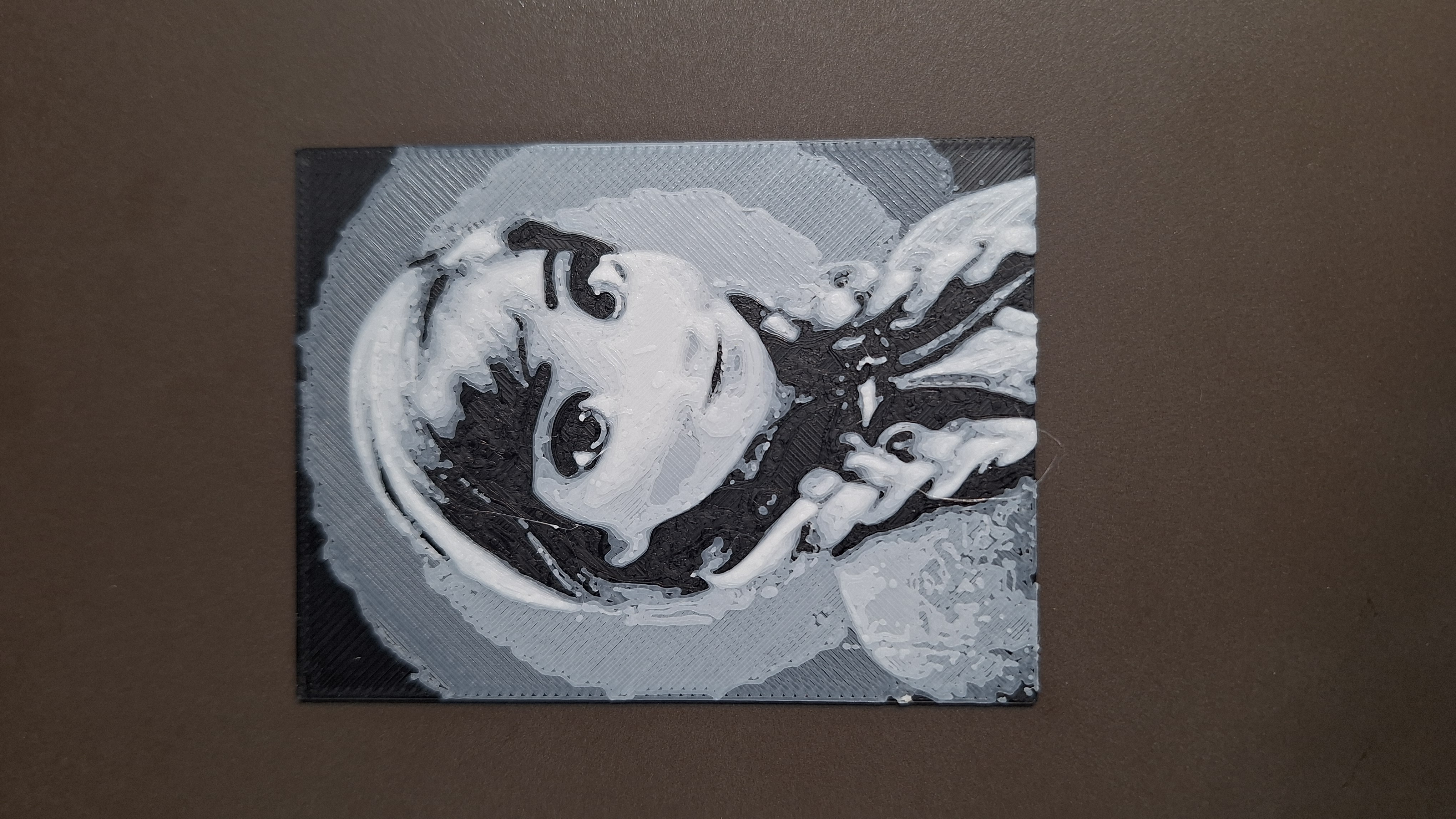Mẫu Hueforge dạng card đen trắng kích thước 60x80mm của Anna trong Frozen. Thiết lập in: lớp đầu 0,16mm, các lớp sau 0,08mm; 0,96mm đầu màu đen, phần còn lại màu trắng.