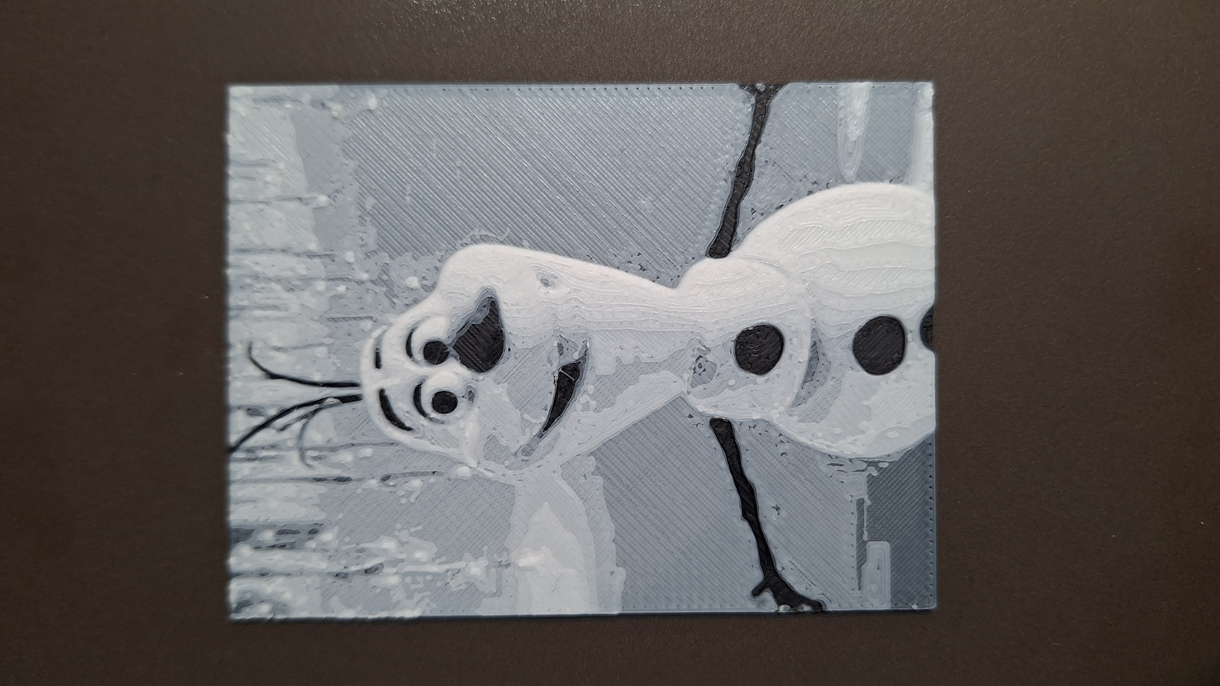 Mẫu Hueforge thẻ đen trắng kích thước 60x80mm với nhân vật Olaf (Frozen). Thiết lập in: lớp đầu 0,16mm; các lớp sau 0,08mm; 0,88mm đầu in màu đen, phần còn lại màu trắng.