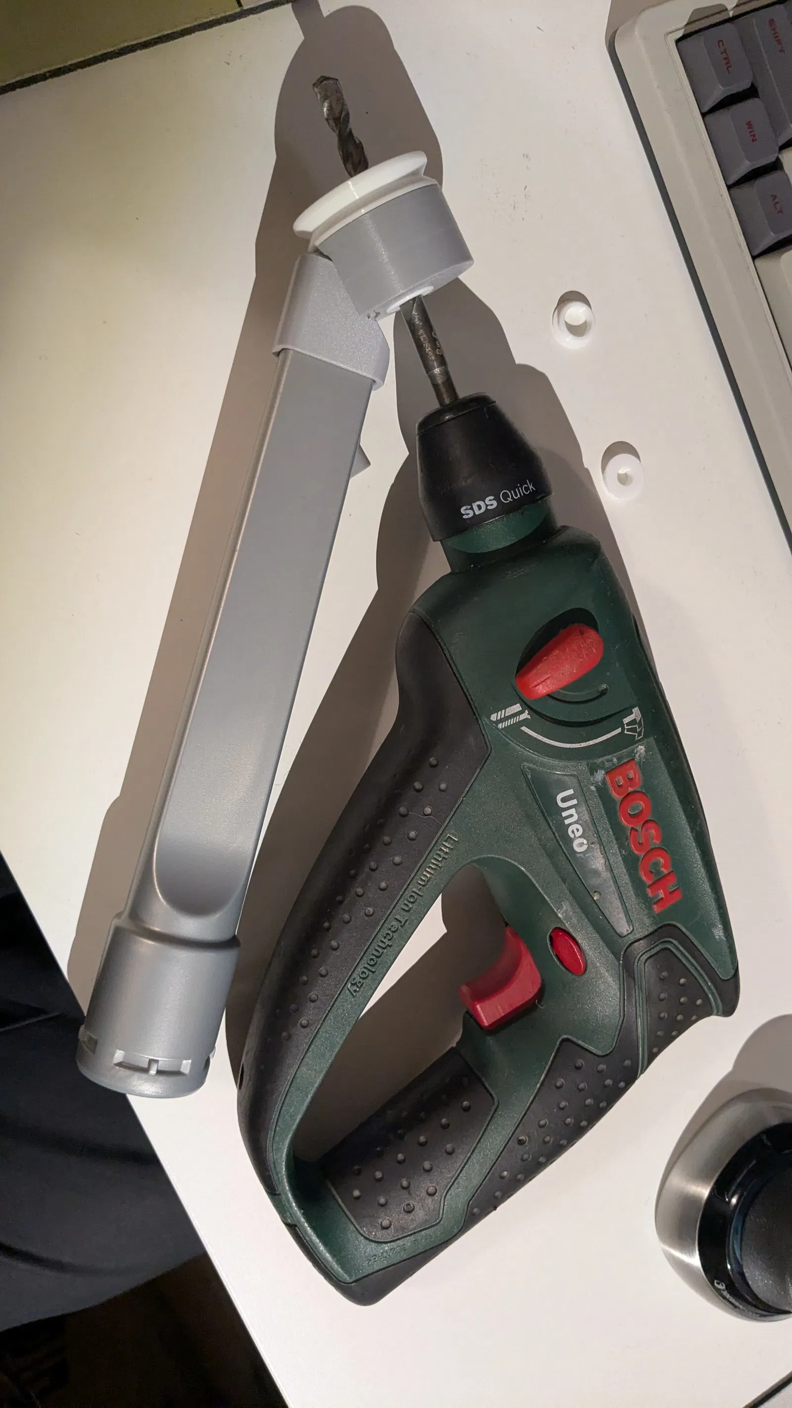 Mình rất ghét cảnh bụi bay tùm lum sau khi khoan lỗ lên tường hay trần nhà. Vì chỉ kê ống máy hút bụi sát bên mũi khoan thì cũng không hút hết được, nên mình làm ra cái adapter này.