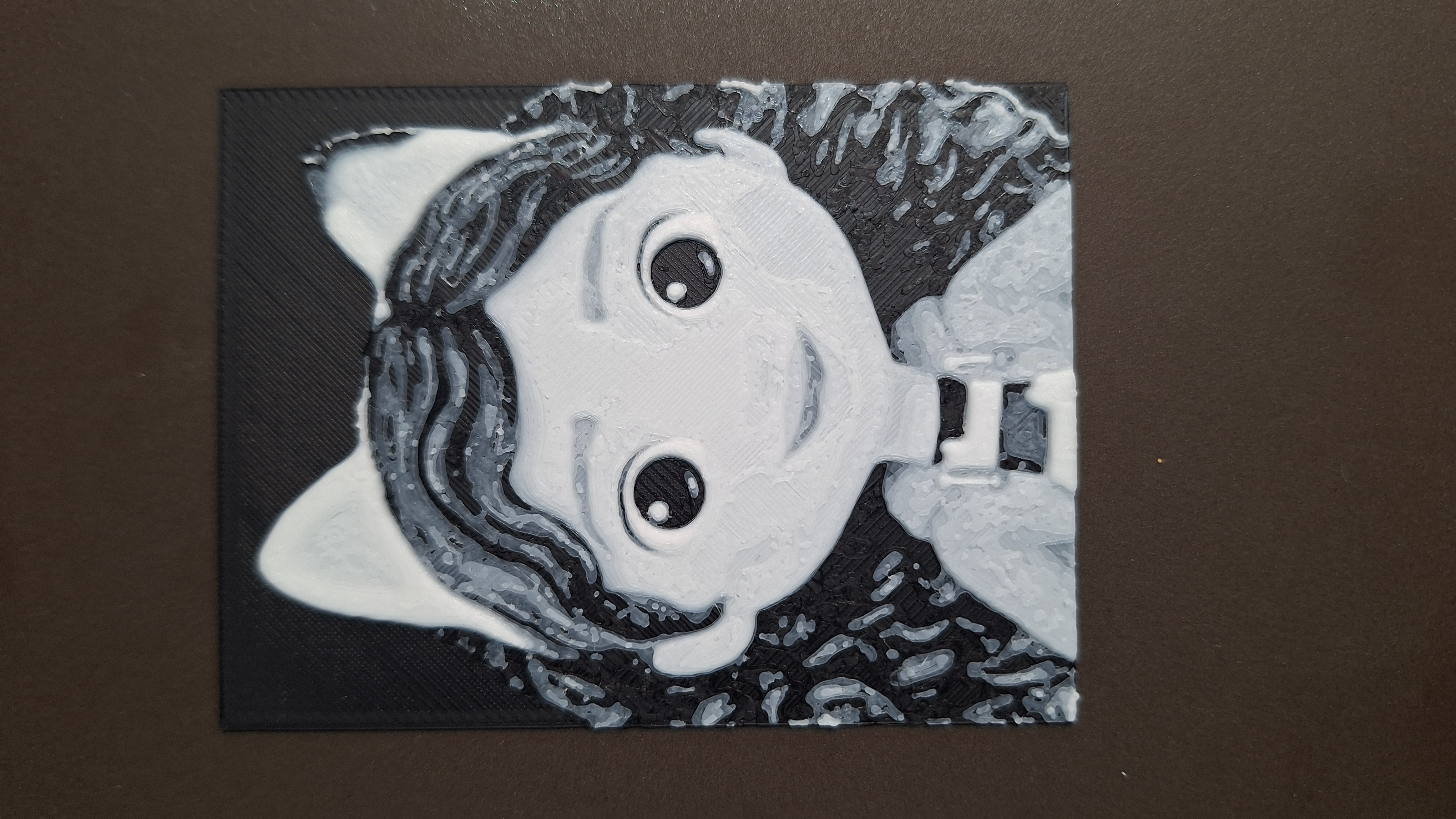 Mẫu hueforge dạng thẻ đen trắng kích thước 60x80mm của Gabby. Thiết lập in: first layer 0,16mm; các lớp còn lại 0,08mm; 0,72mm đầu in màu đen, sau đó chuyển sang màu trắng.
