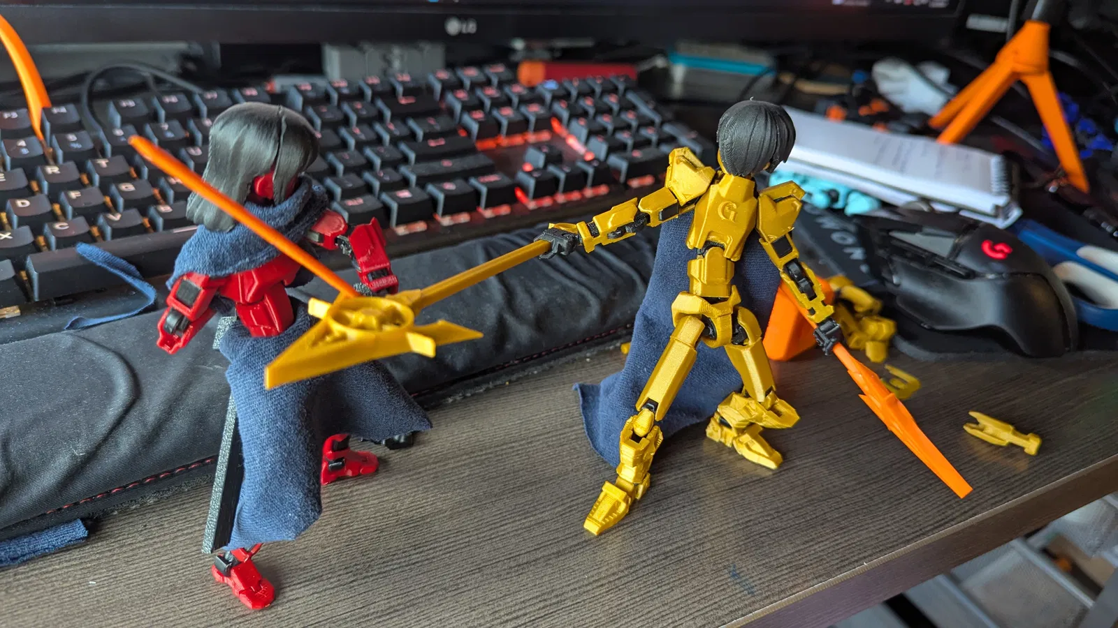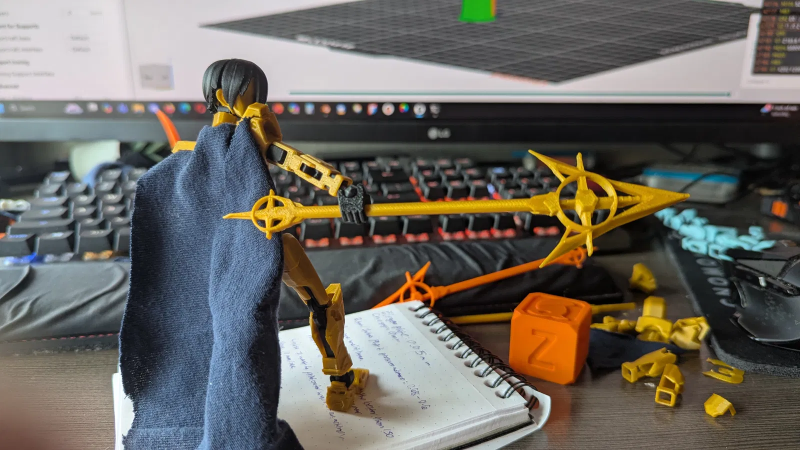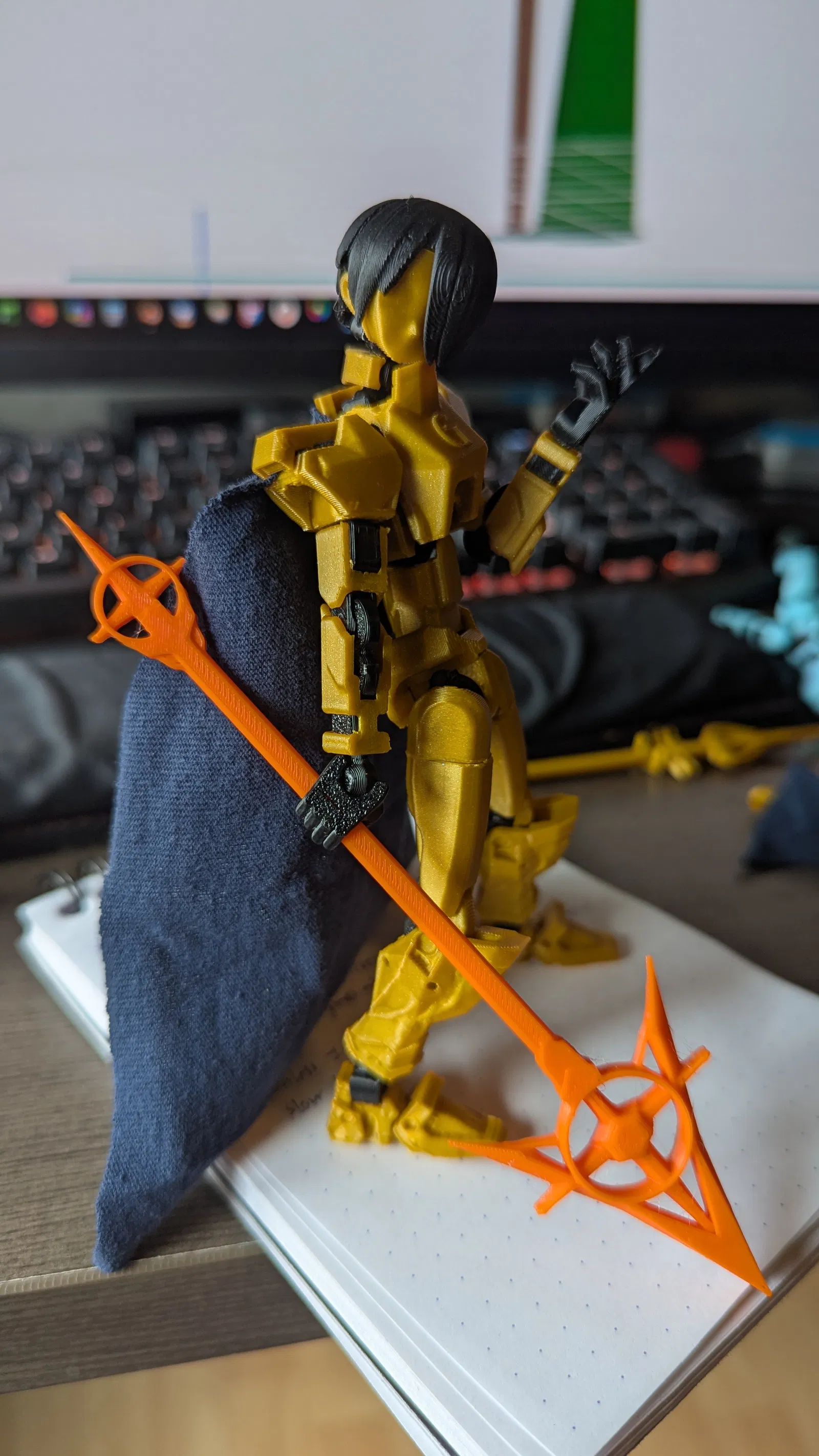 Mình kiếm hoài không thấy cây giáo nào kiểu “điên” và quá khổ cho đã, nên tự làm luôn cái này. Cây giáo được in thành 2 phần để bạn có thể vặn/luồn ren vào tay của Dummy 13. Hai phần ghép với nhau theo kiểu friction fit rất chặt, nên nhớ gắn cây cán vào tay trước rồi hẵng ráp hai phần lại với nhau.