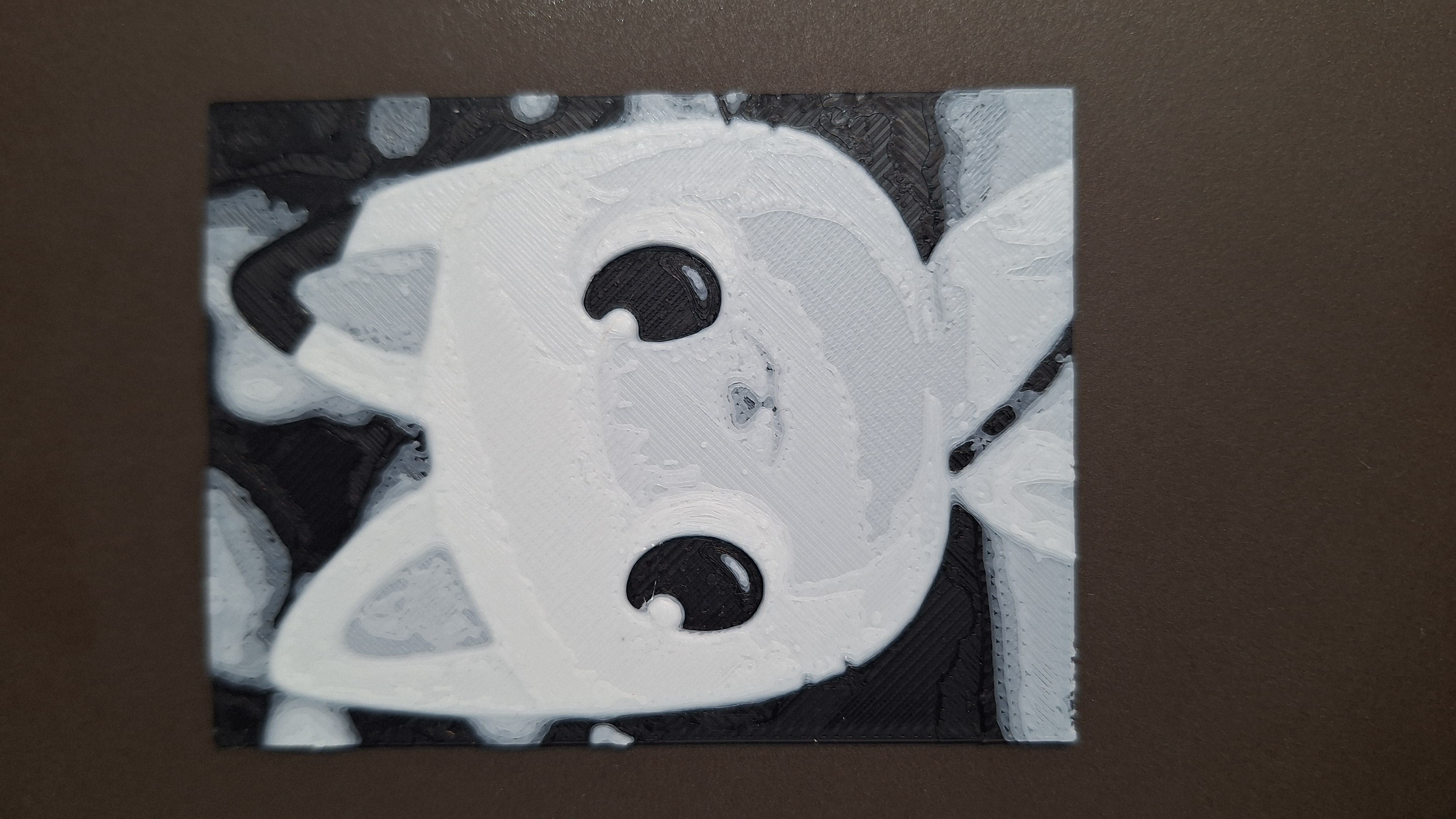 Mẫu hueforge dạng thẻ đen trắng kích thước 60x80mm chủ đề Panda Paw. Thiết lập in: lớp đầu 0,16mm, các lớp sau 0,08mm; 0,96mm đầu in màu đen, phần còn lại in màu trắng.
