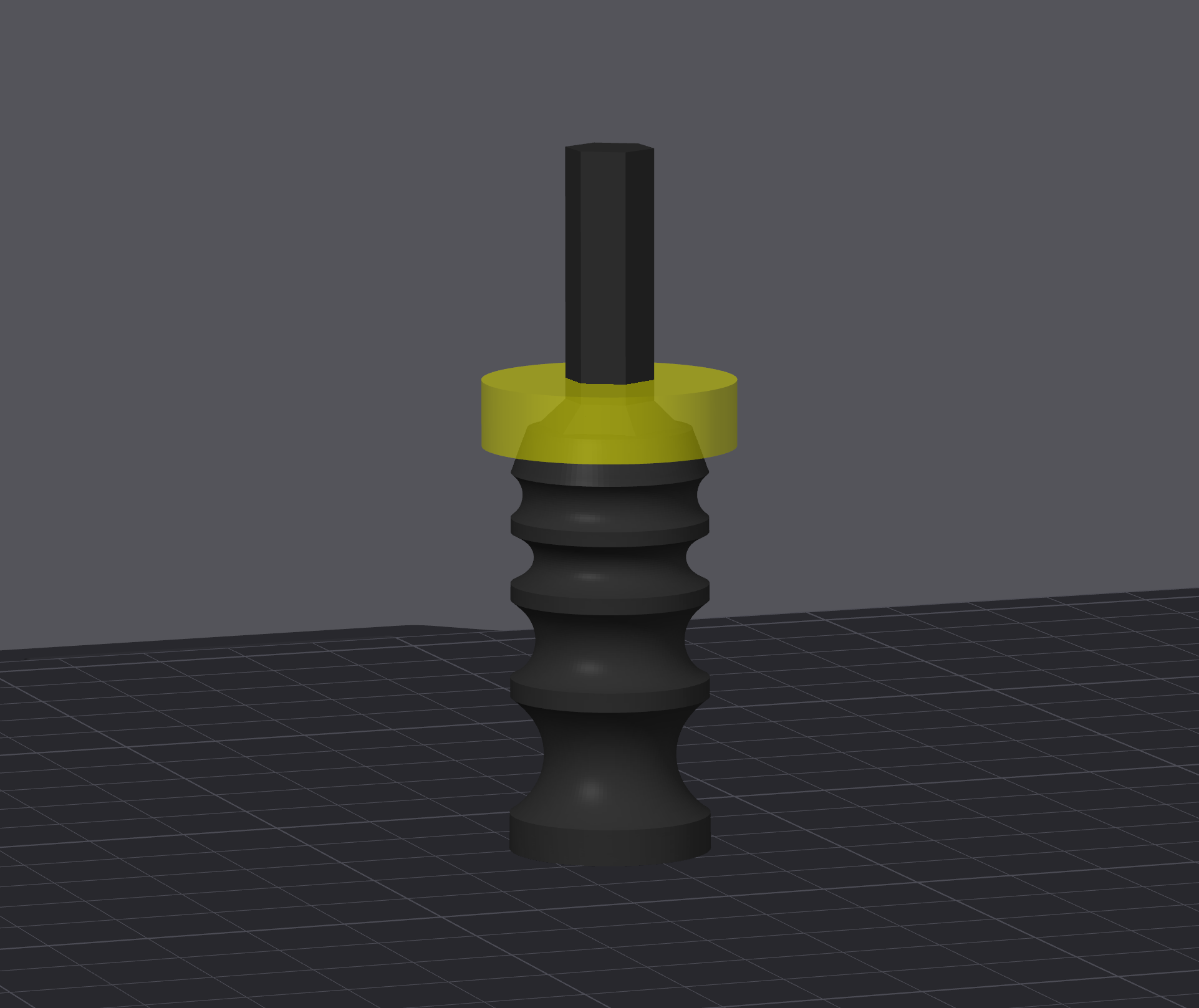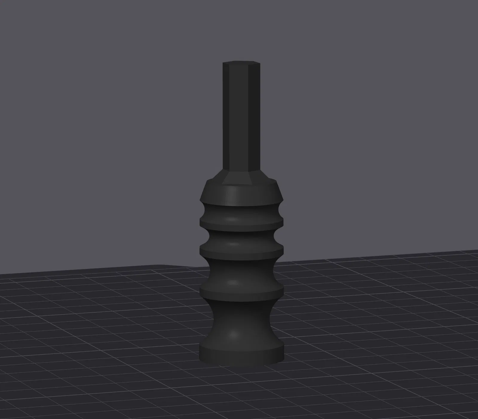Dụng cụ burnishing cho da, đuôi trục lục giác để kẹp trực tiếp vào chuck máy khoan. Scale mặc định phù hợp chuck nhận hex ≥9mm, có thể resize. Kèm file STL và 3MF (modifier 100% infill).