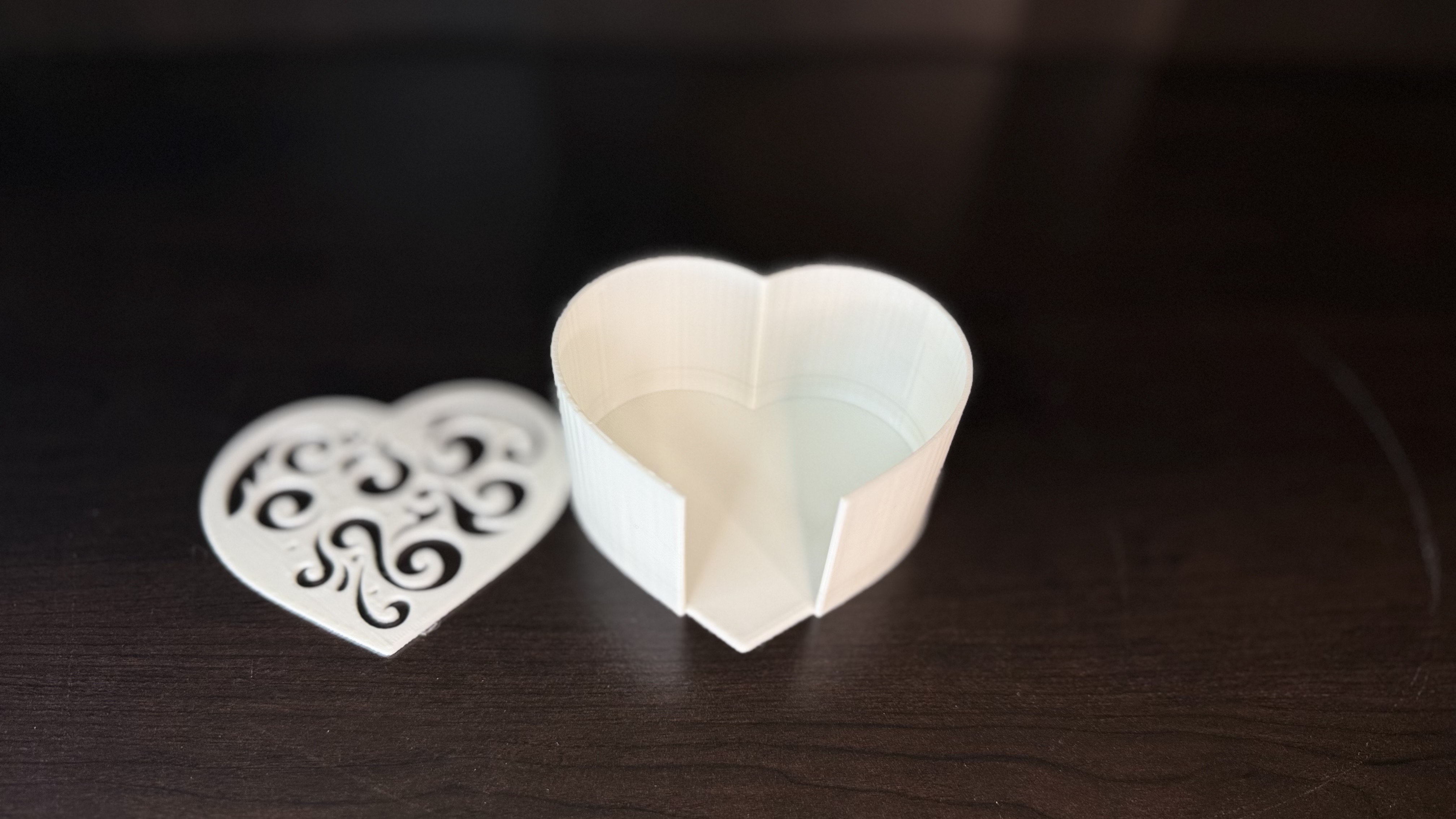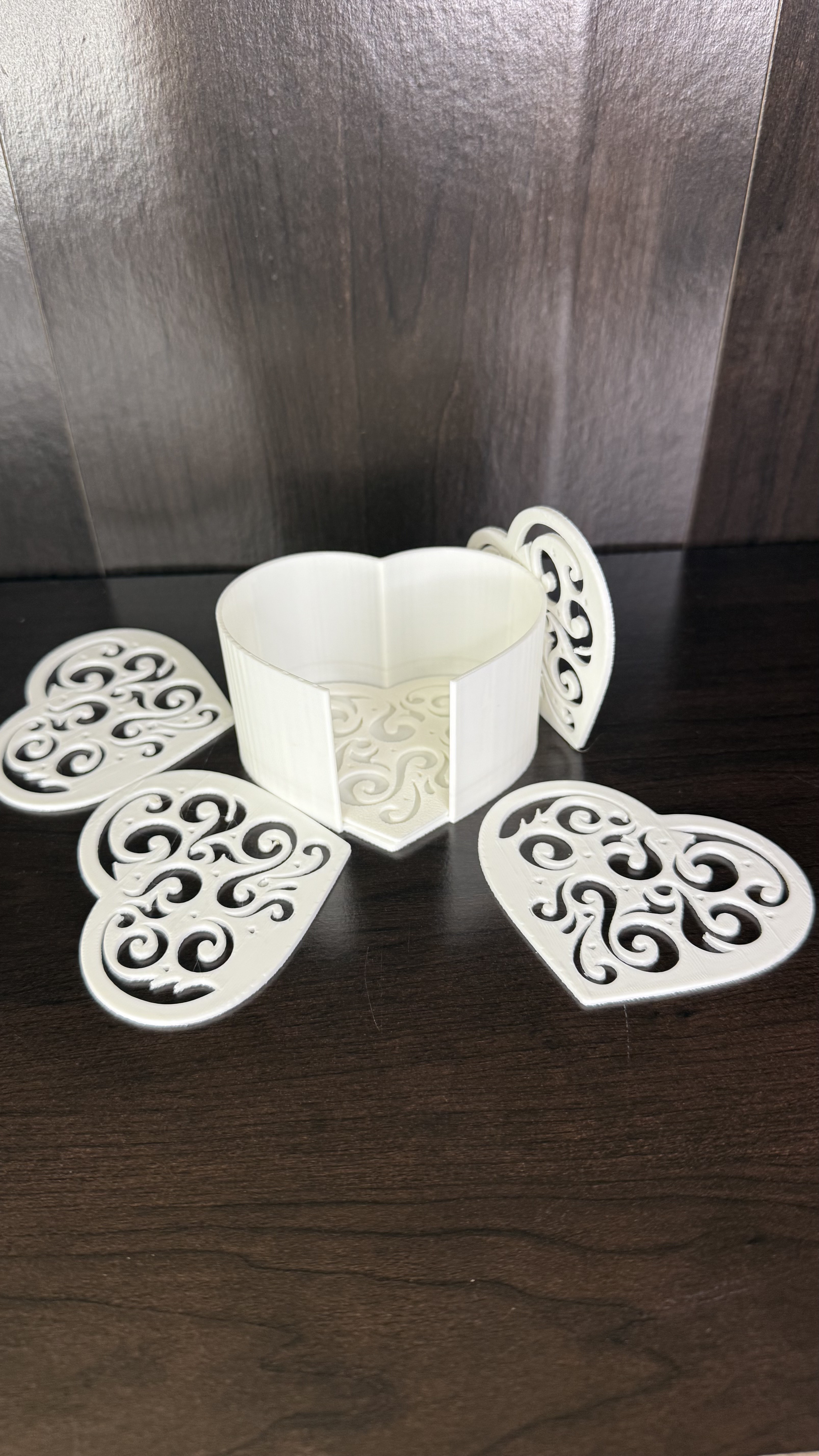 Miếng lót ly hình trái tim có họa tiết tinh xảo kèm giá đựng, phù hợp đa số kích cỡ cốc/ly. In được nhiều kích thước, print in place, không cần supports, lên màu nào cũng đẹp.
