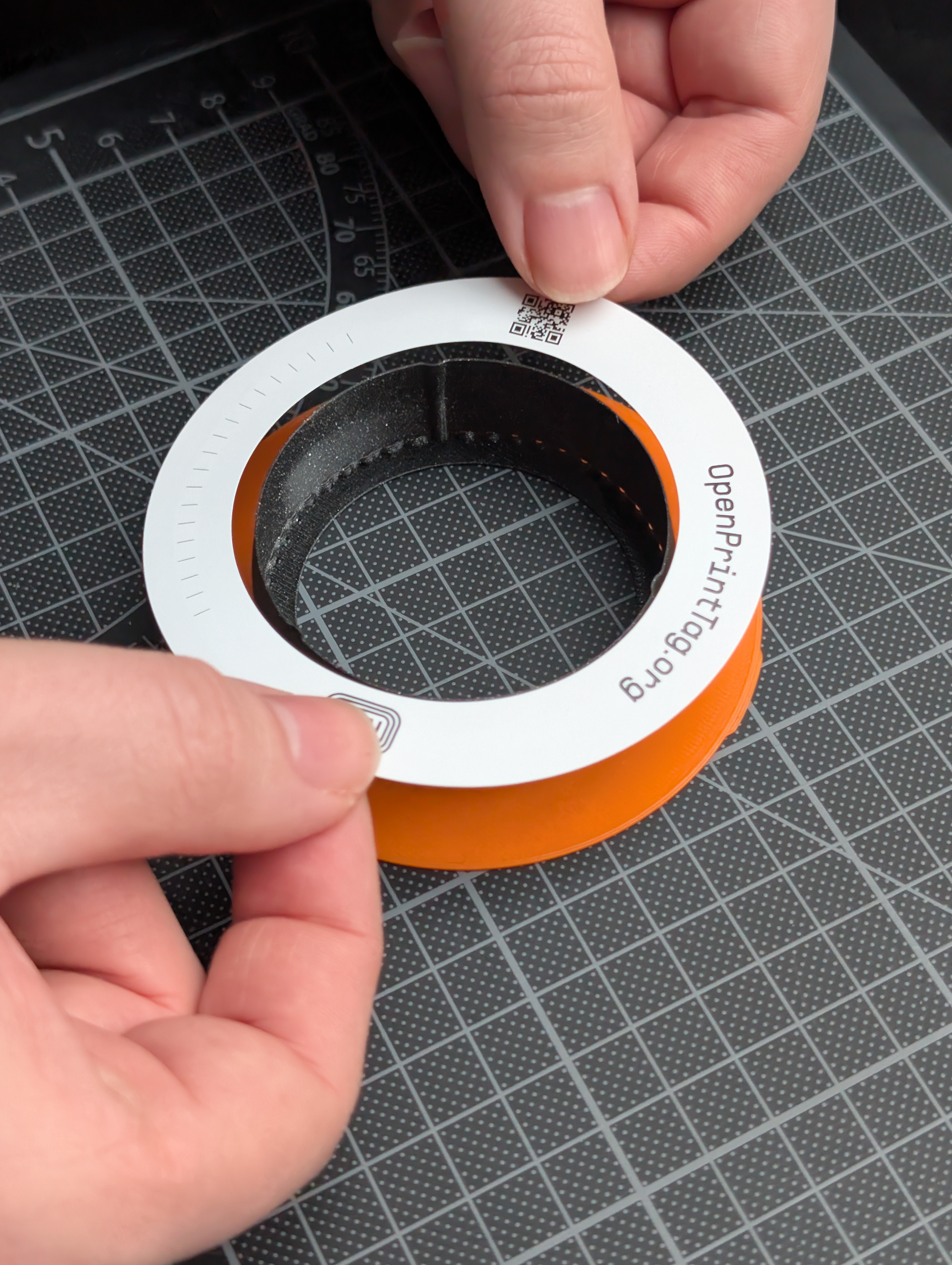 Đây là một hệ thống gắn lắp 2 phần đơn giản, nhẹ, được thiết kế để gắn Prusa OpenPrintTags lên bất kỳ cuộn filament nào – và tái sử dụng lại khi cuộn hết. Một phần được dán keo trực tiếp lên cuộn, phần còn lại dùng để giữ OpenPrintTag. Chỉ cần vặn nhẹ một cái là hai phần khóa chặt với nhau. Khi cuộn filament đã hết, chỉ việc vặn để tháo phần giữ tag ra và gắn sang cuộn tiếp theo đã được dán sẵn phần đế.