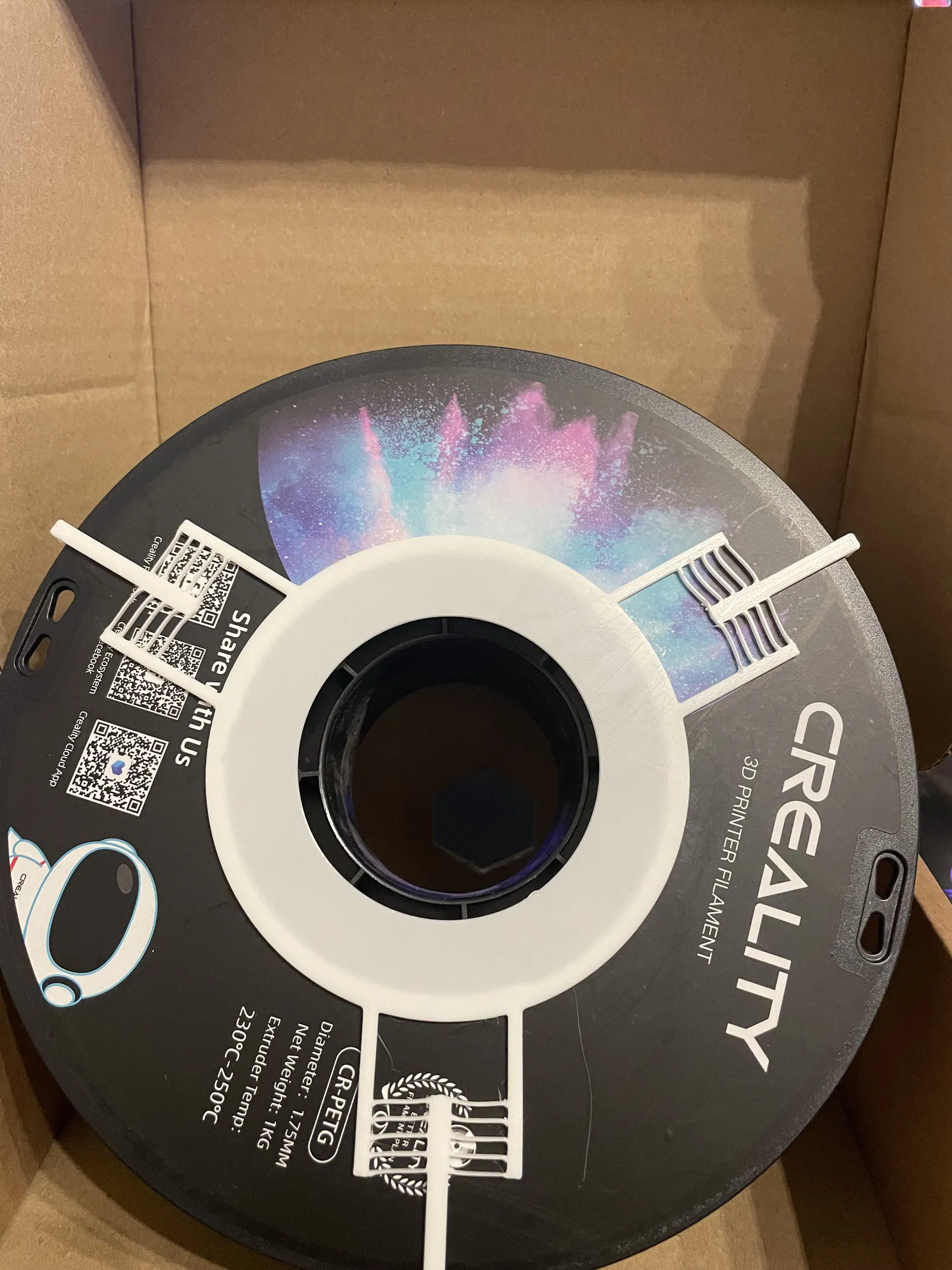 Nhờ vậy có thể kẹp cuộn filament từ nhiều nhà sản xuất khác nhau (ví dụ: Prusa, Sunlu, eSun, v.v.) một cách universal và không cần dán keo.