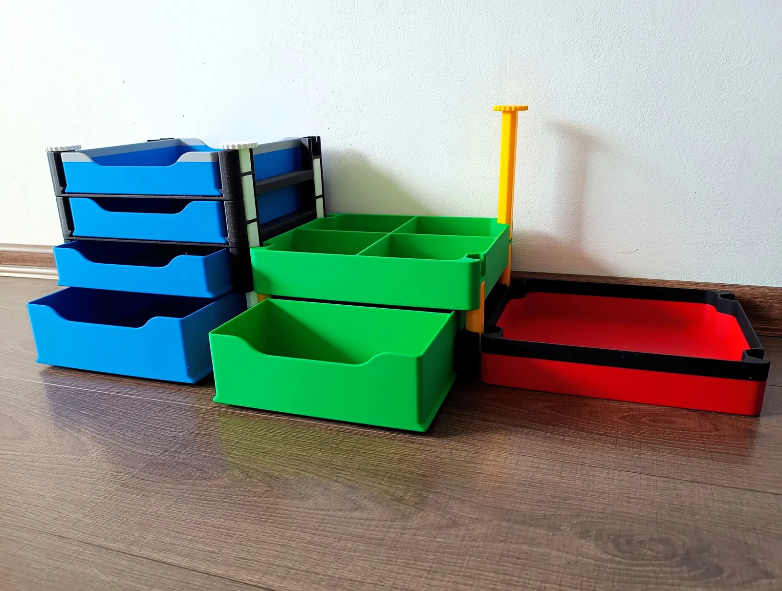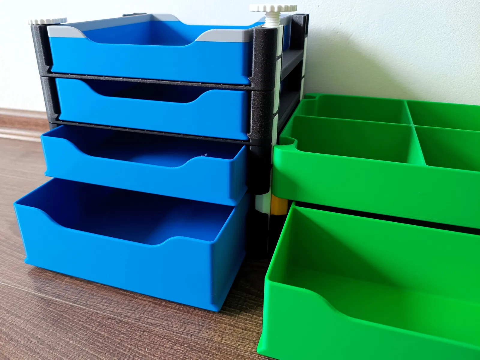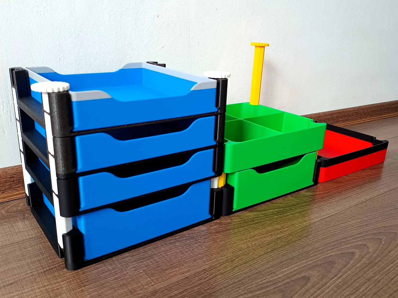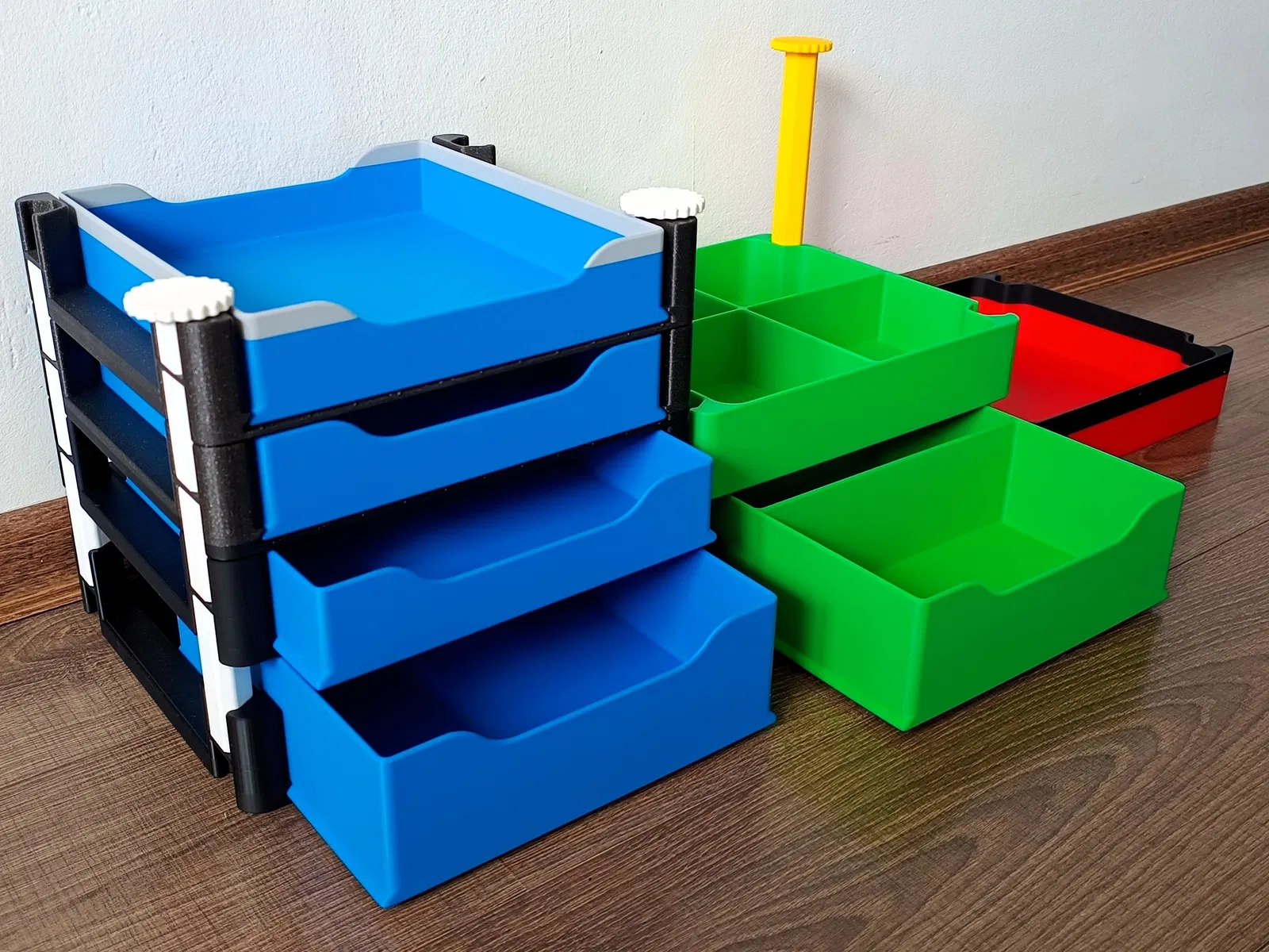 Hệ hộp lưu trữ xếp chồng đa năng với đáy đặc/đục lỗ và ngăn kéo, phù hợp nhà ở, văn phòng hoặc xưởng. Bản mới giữ thiết kế cũ nhưng đổi kích thước, rộng 250 mm; có vách ngăn chia 2/4.