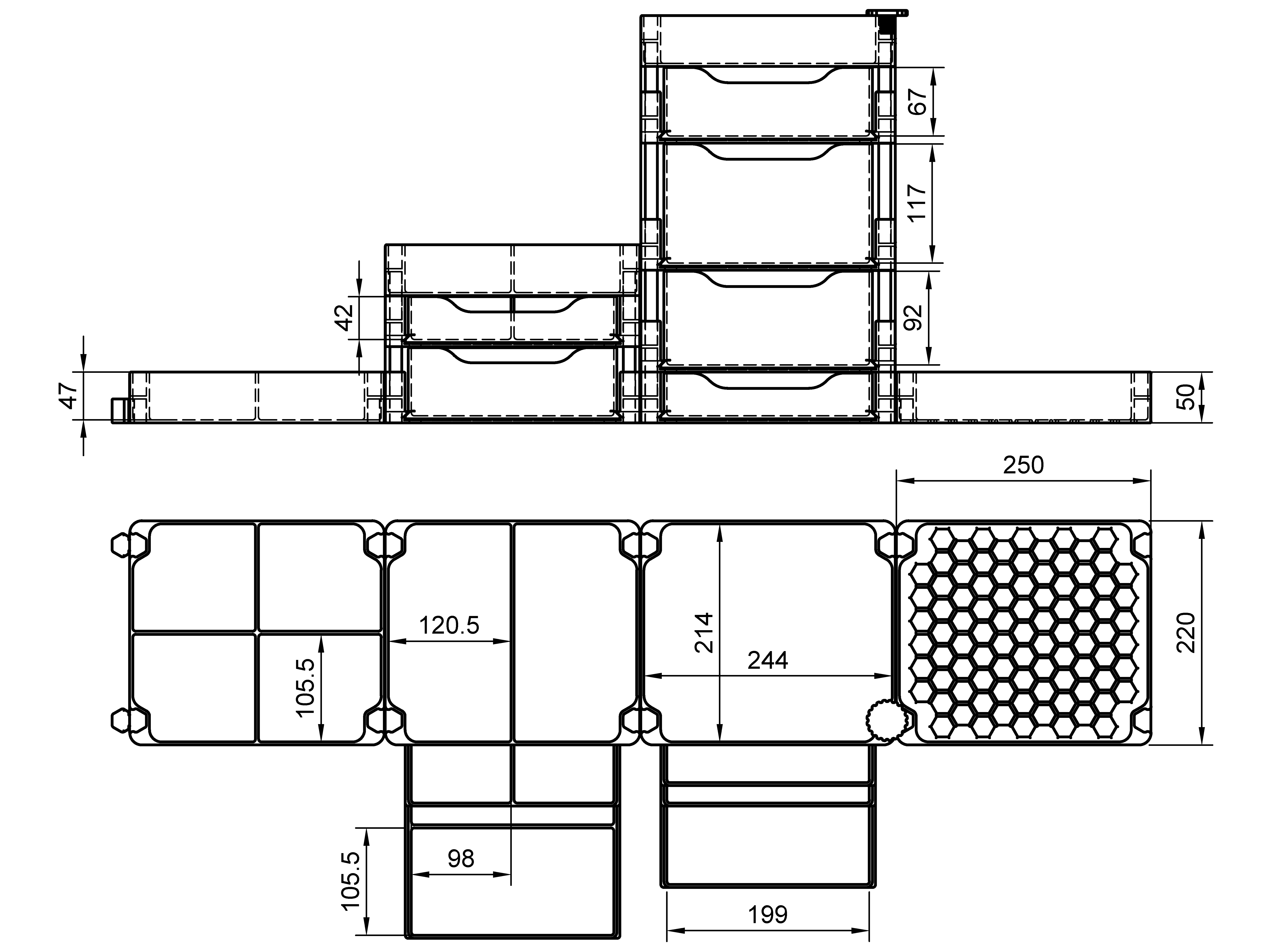 📦Kích thước cơ bản: W250 × D220 × H50 mm, Drawers: 50 mm, 75 mm, 100 mm, 125 mm