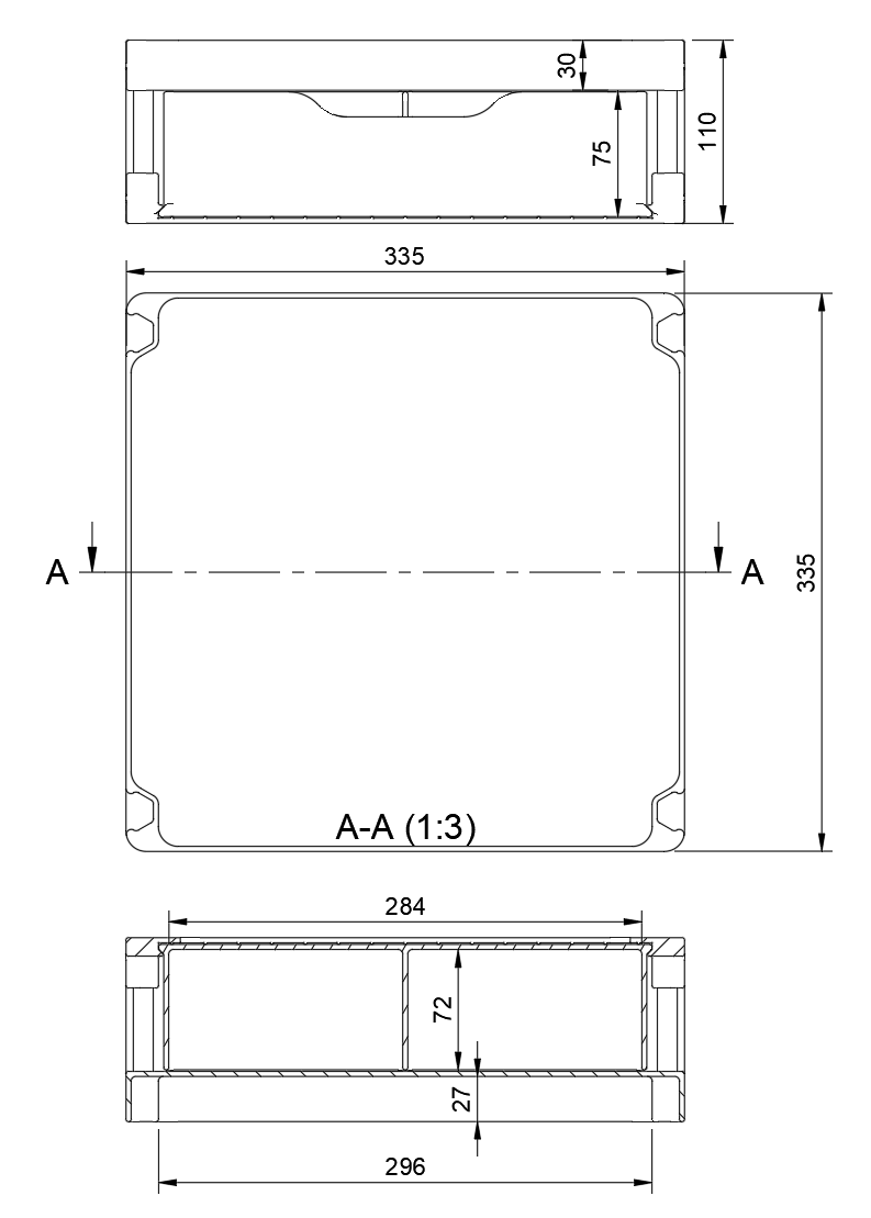 Tất cả kích thước đều có trong bản vẽ kỹ thuật – module base có kích thước 335 × 335 mm và cao 110 mm. Nếu bạn lắp/ghép các phần theo cách khác nhau thì tổng chiều cao có thể thay đổi.