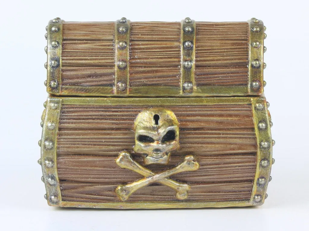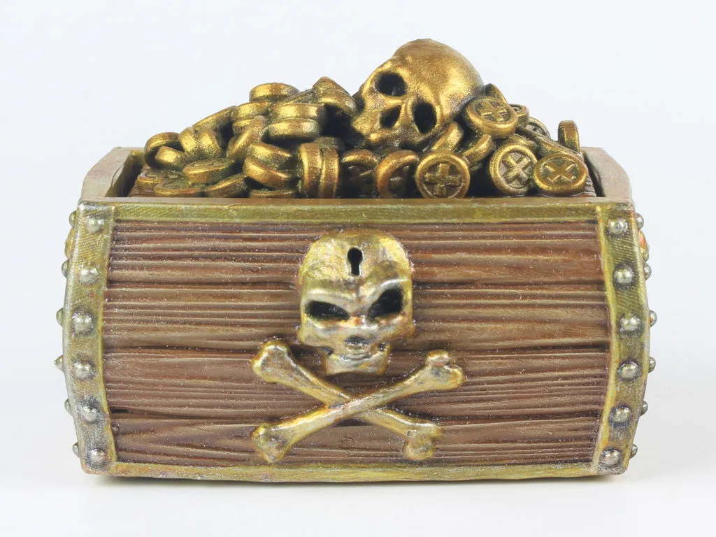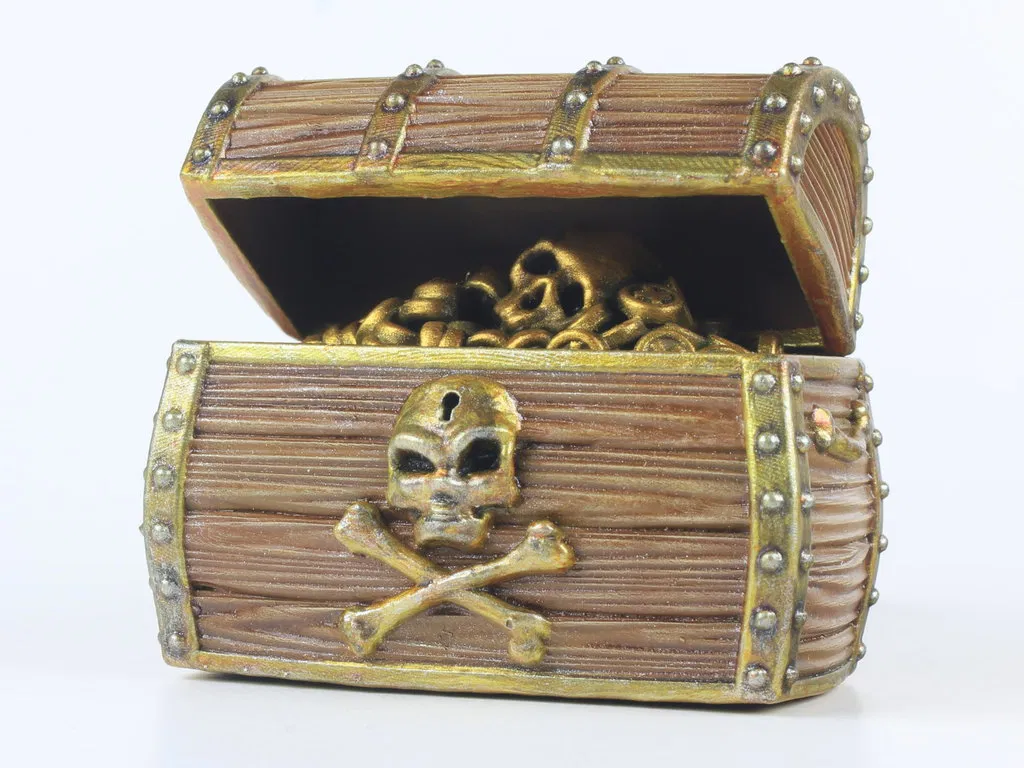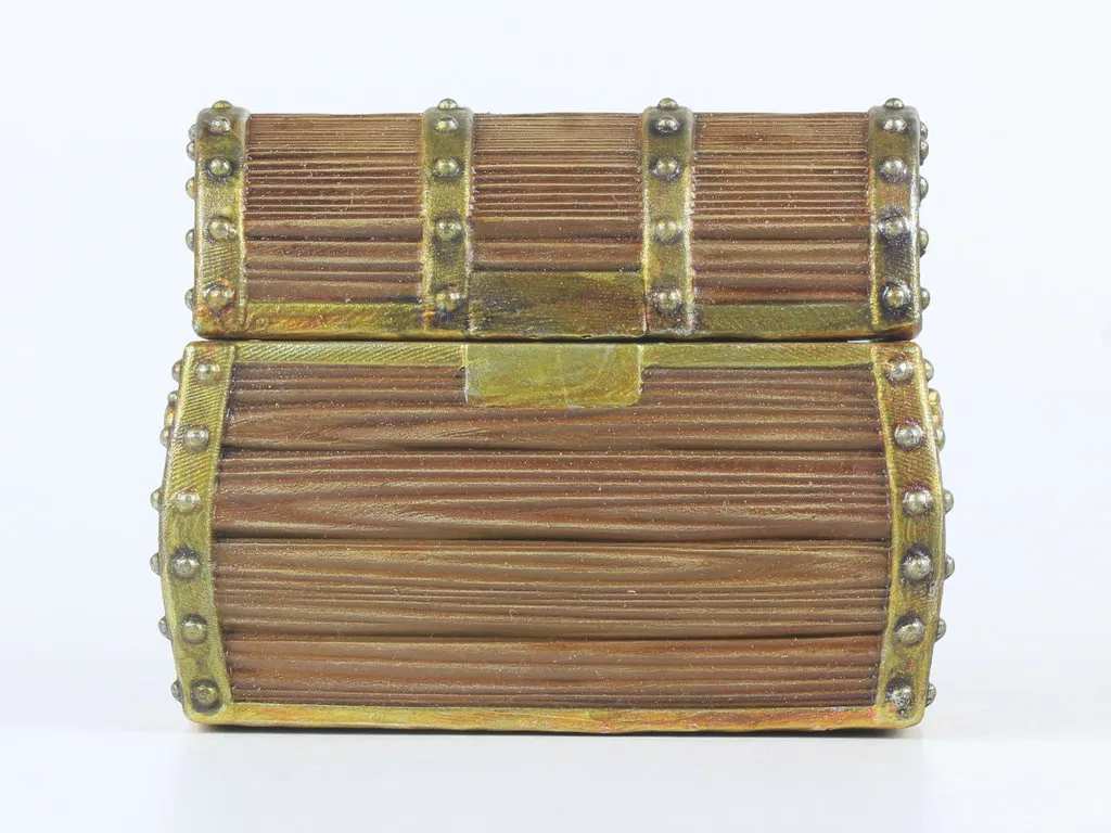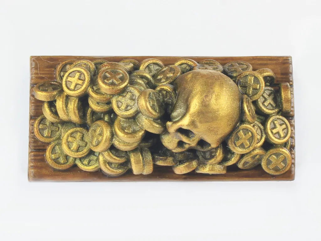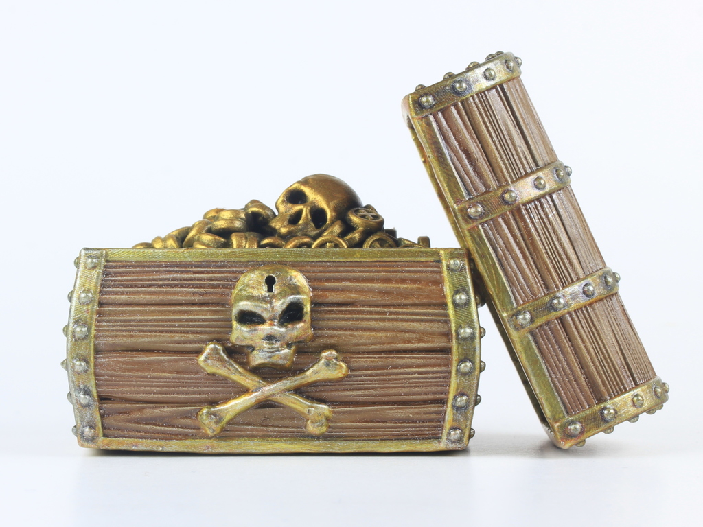 Đây là một rương kho báu cướp biển bằng gỗ dạng modular. Bộ này gồm: 1 rương kho báu rỗng, 1 nắp, 1 module/plate kho báu cướp biển và một vài miếng spacer để chỉnh mức độ “đầy” của rương. (Gợi ý: mấy miếng spacer này có thể thay dễ dàng bằng vật liệu như bìa carton.)