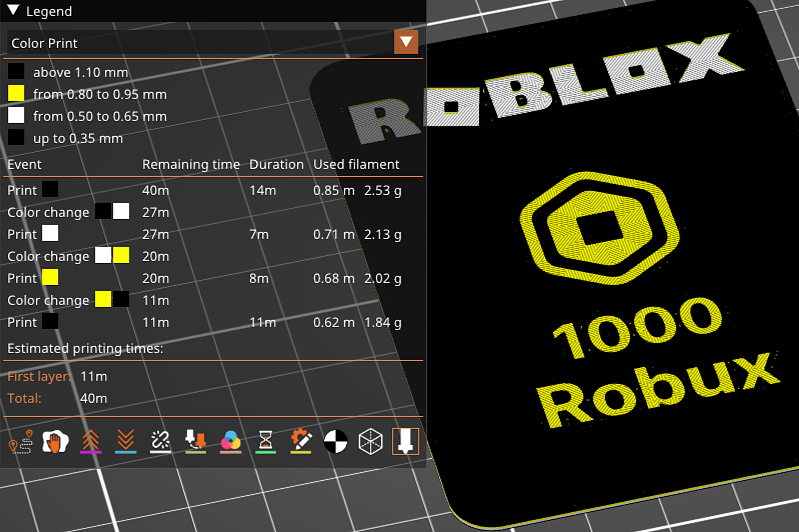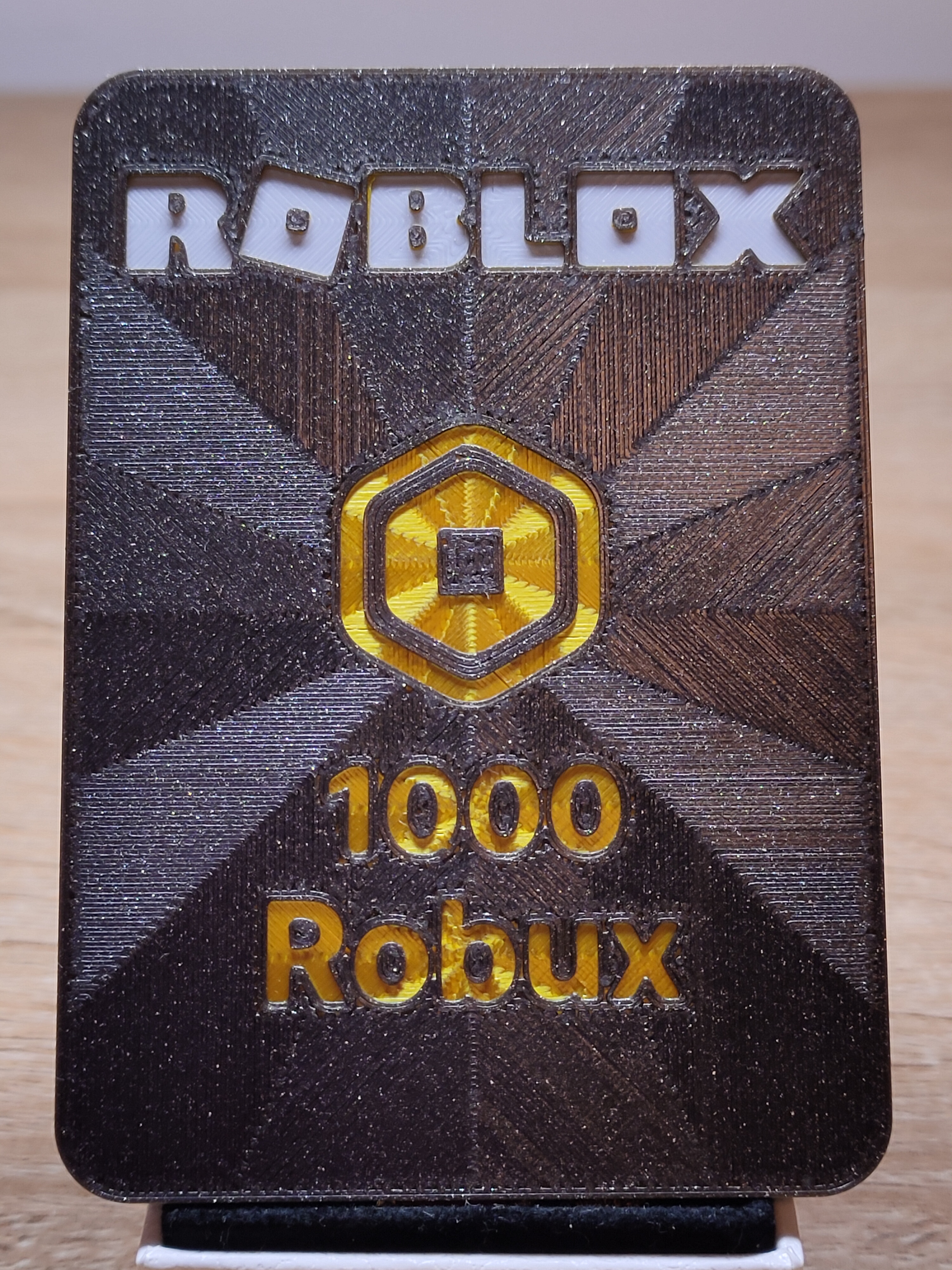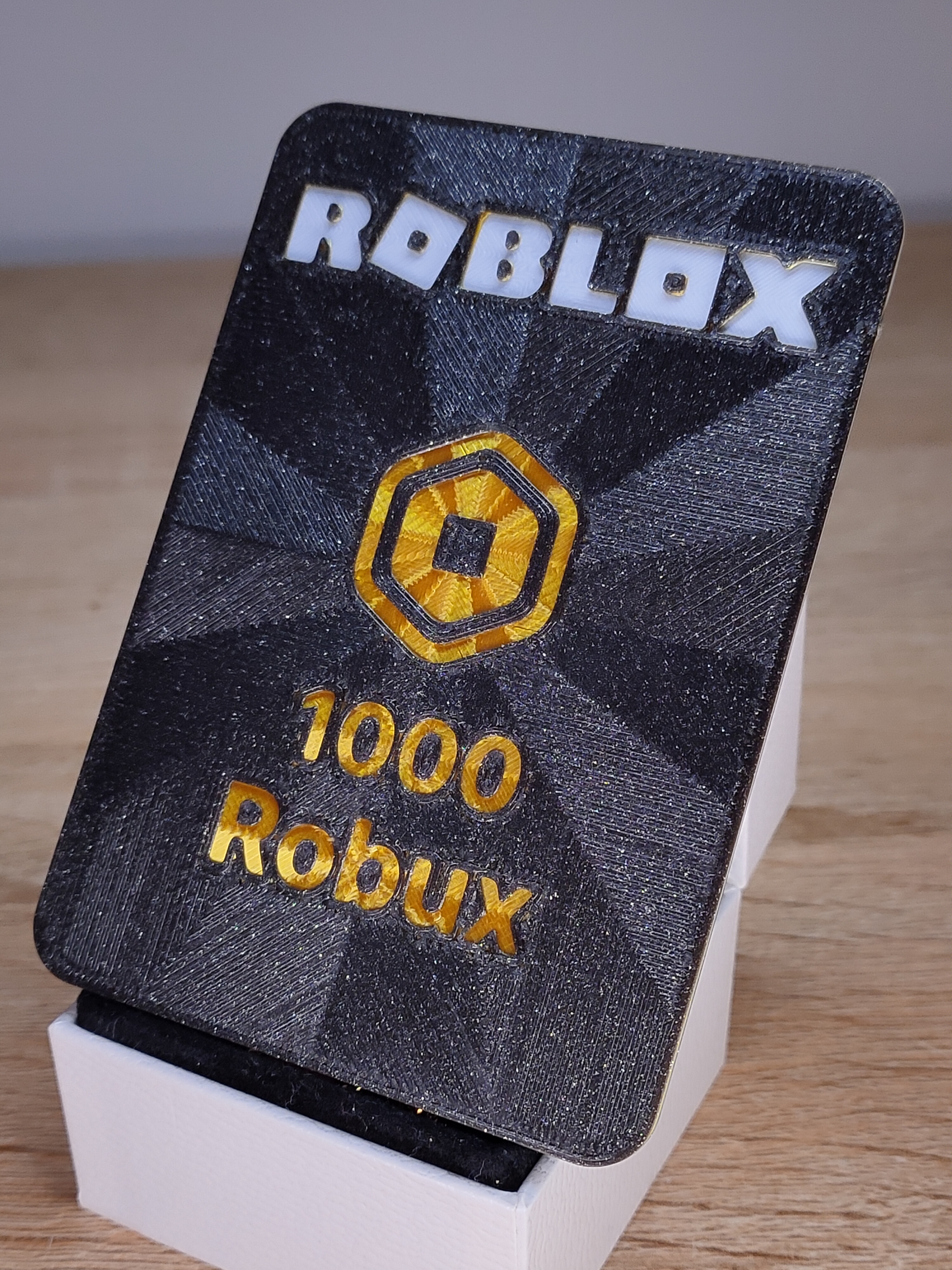 Mẫu in 3D thẻ Robux Gift Cards theo chủ đề Roblox. Kích thước 64×90×1.25mm, in với nozzle 0.40mm và layer height 0.15mm để đổi màu chuẩn (đen/trắng/gold/đen). Gợi ý top layer Octagram Spiral.