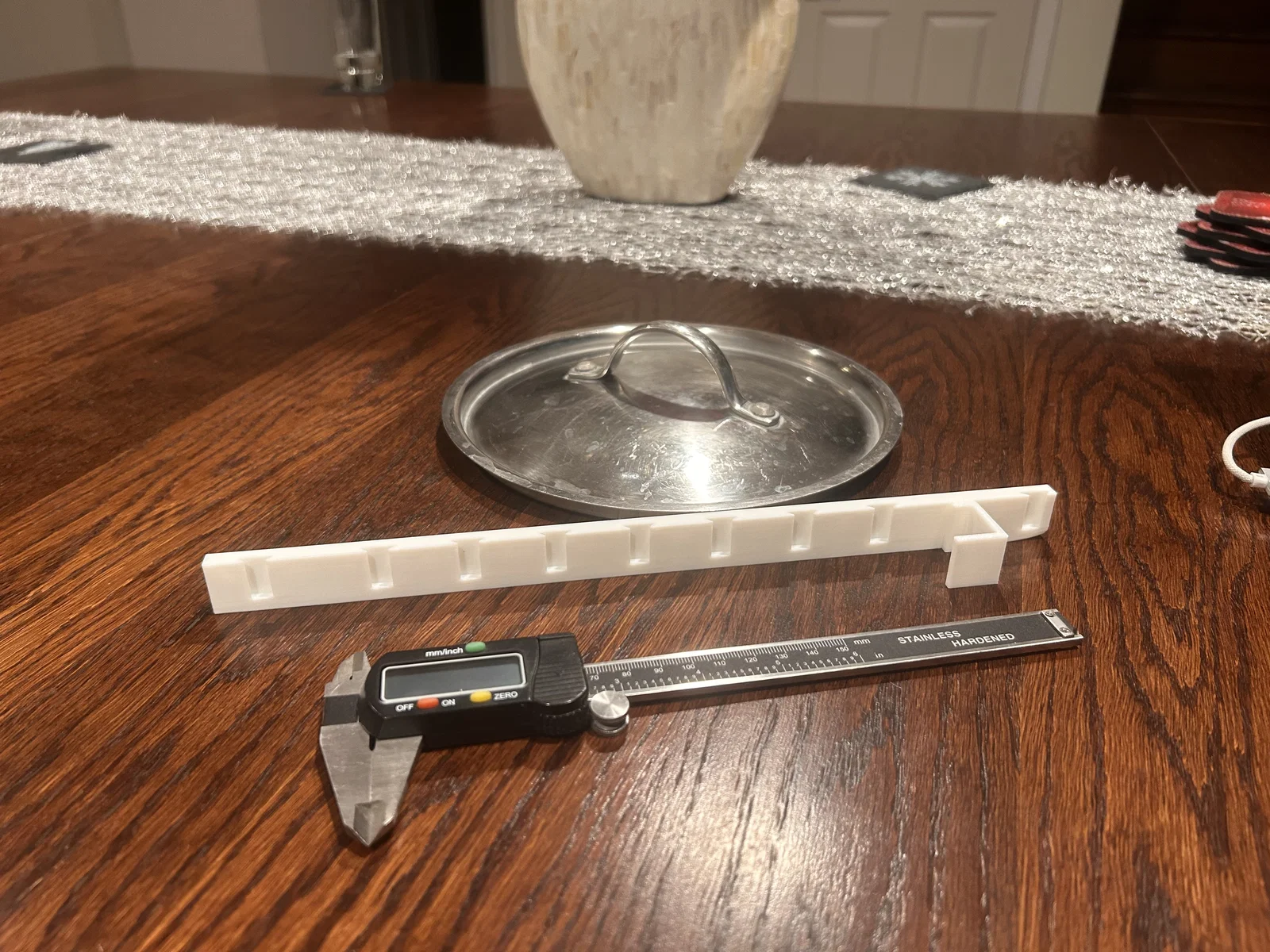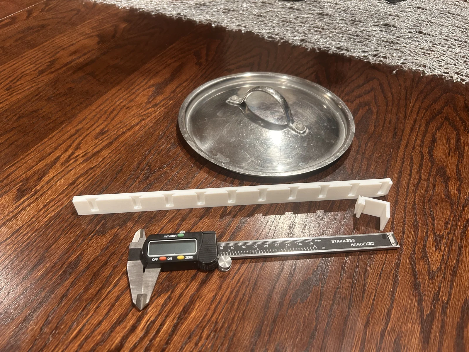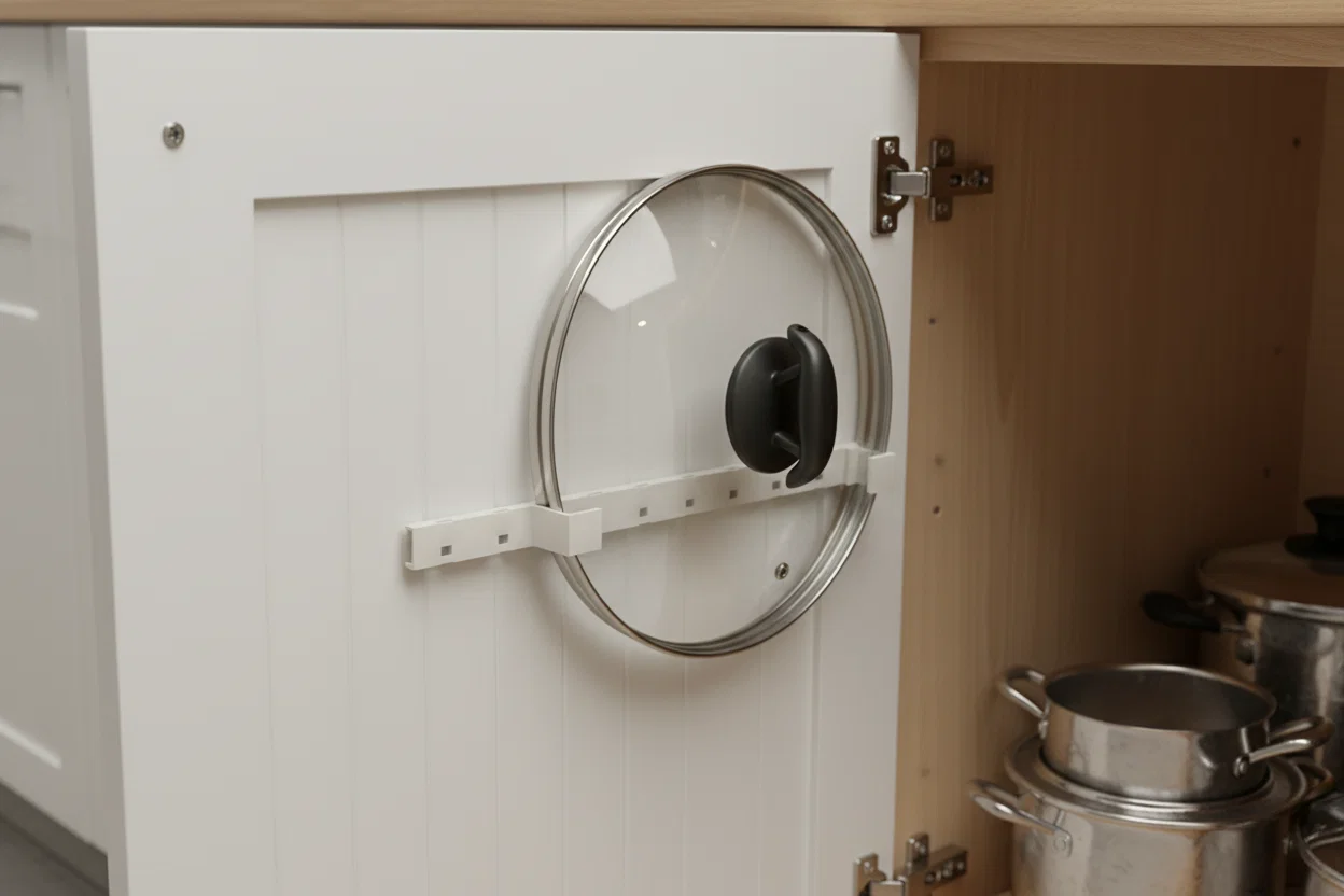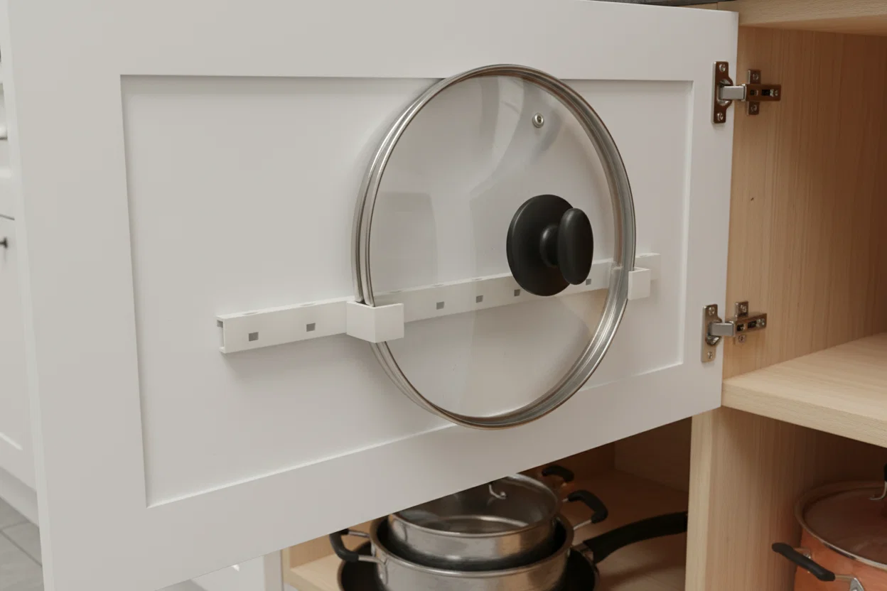 Đây là một giá đỡ nắp (lid holder) gắn vào mặt trong cánh cửa tủ bếp bằng miếng dán Velcro command strips.