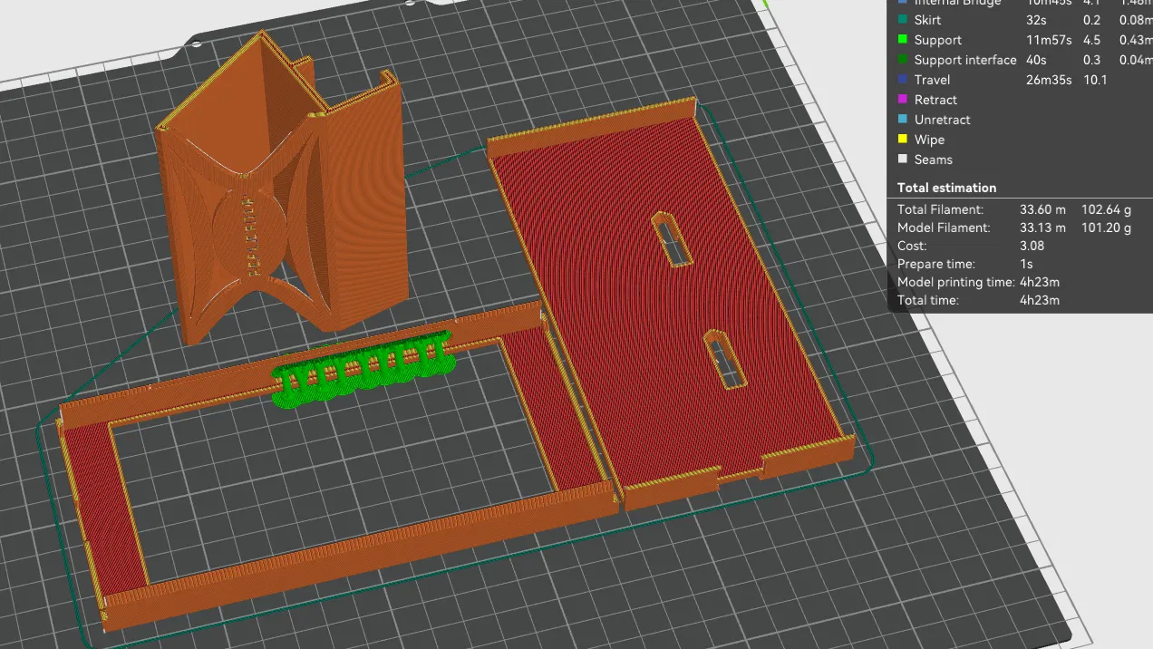 File 3mf cho thấy tất cả chi tiết ở đúng orientation. Lưu ý phần dovetail của bracket phải hướng LÊN trên, và cần một ít support cho khe nút bấm bên hông điện thoại. Bracket thường in vẫn ổn không cần support với đa số máy in.