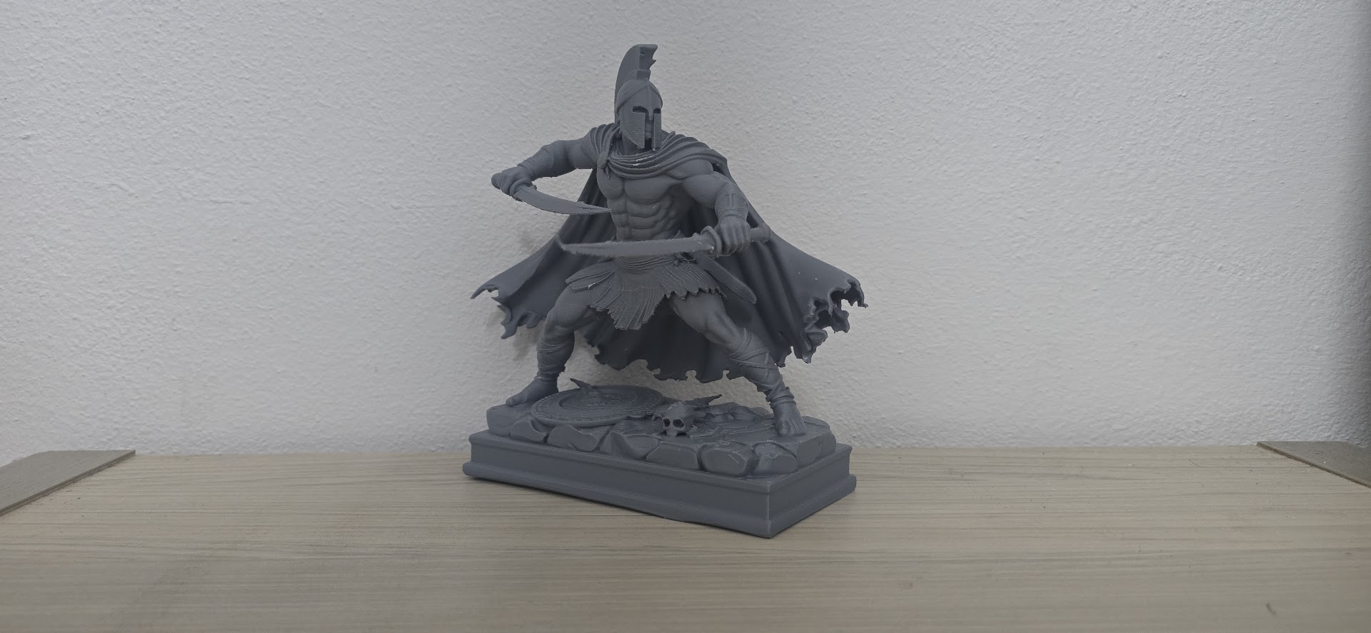 Mẫu tượng Chiến binh Spartan cầm hai thanh kiếm, phong cách cổ đại Hy Lạp với mũ giáp và giáp trụ mạnh mẽ. Phù hợp để in 3D làm đồ trang trí, mô hình trưng bày hoặc sưu tầm.