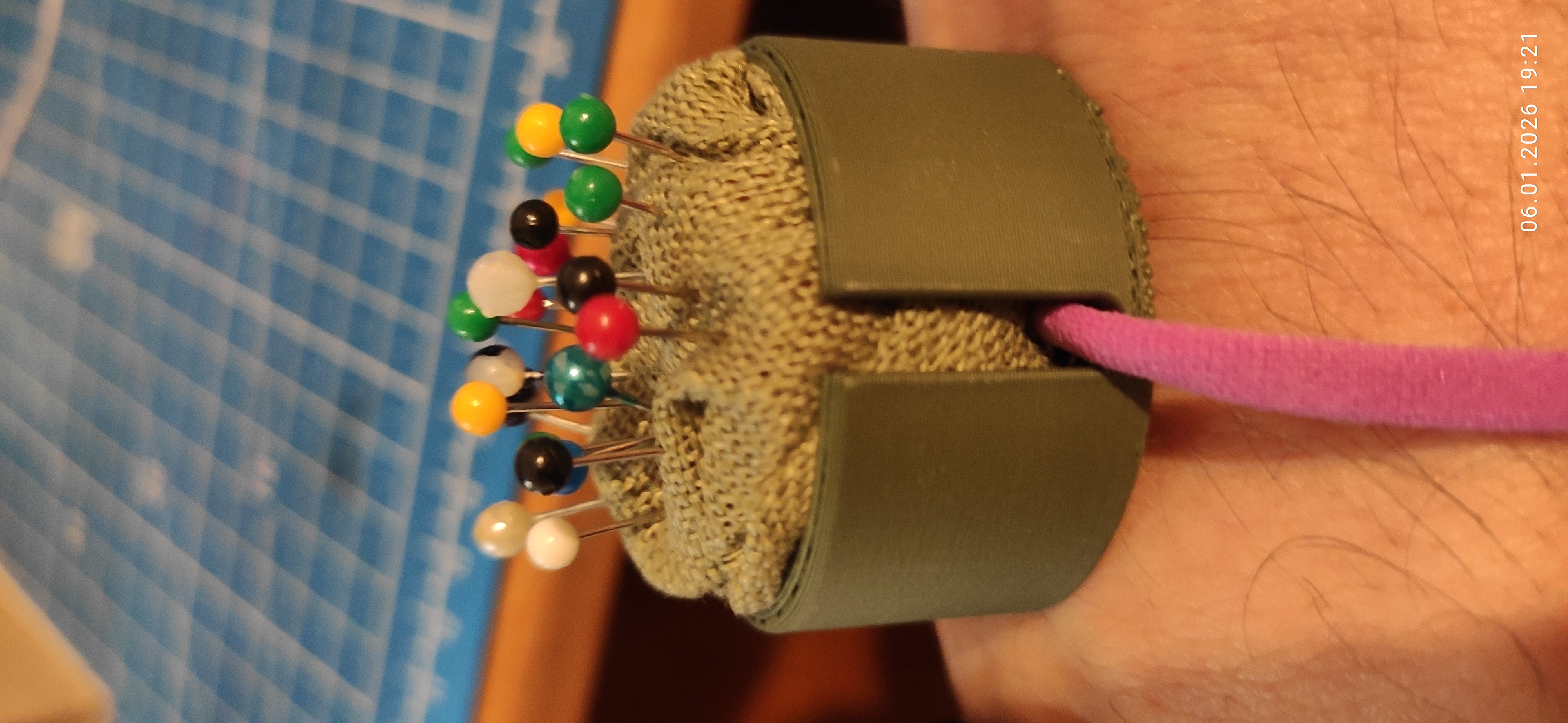 Phụ kiện may vá Nadelschwamm Sewingsponge giúp giữ kim ghim gọn gàng. Cắt sponge đúng size, bọc vải cũ, lồng dây cột tóc giãn vào holder rồi đặt sponge lên. In PLA, khuyến nghị infill 100%.