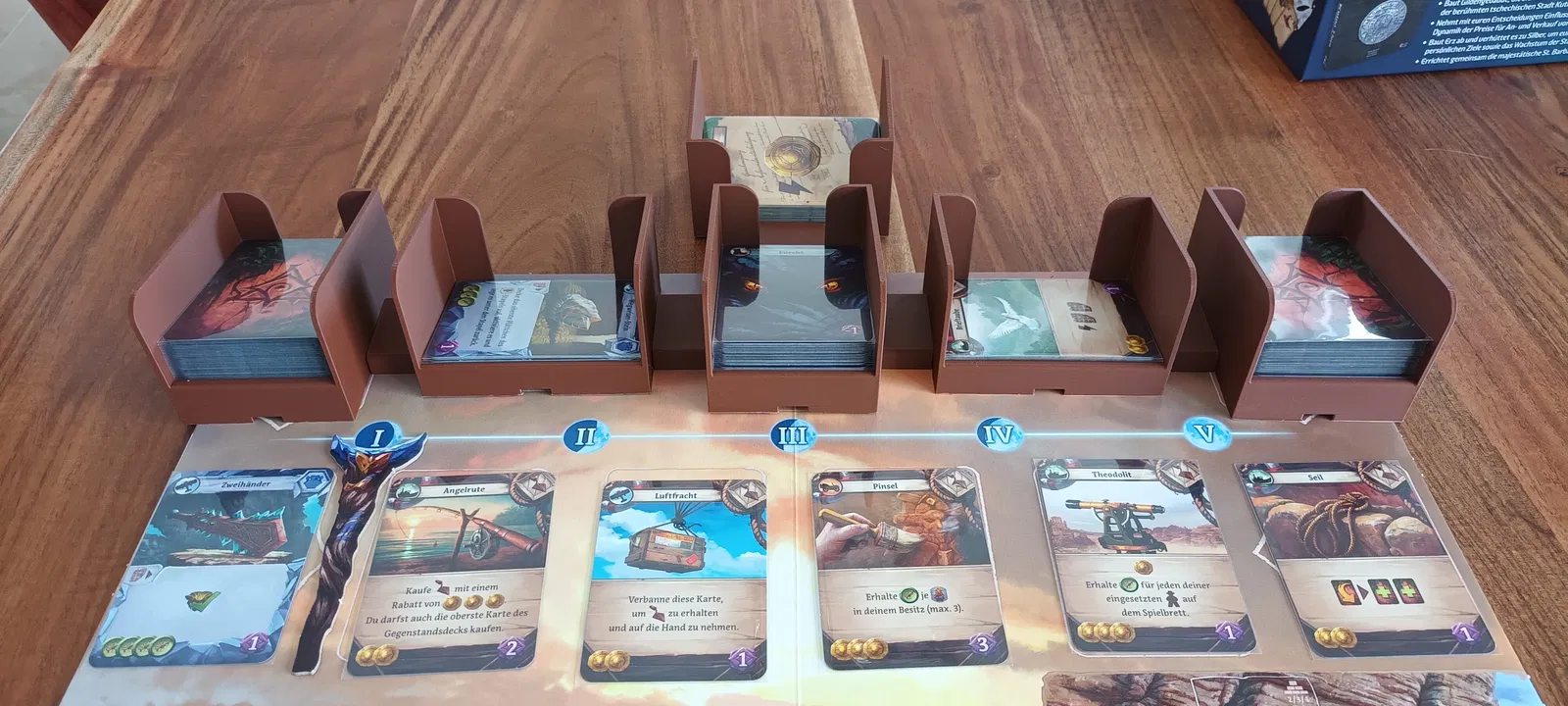 Khay/khay đựng bộ bài dạng modular cho board game, dùng được với bài tiêu chuẩn không bọc và bọc inner sleeve (~90×65mm). Có khay quick access 15°, khay 10° chống tuột và có thể nối/stack để cất gọn.
