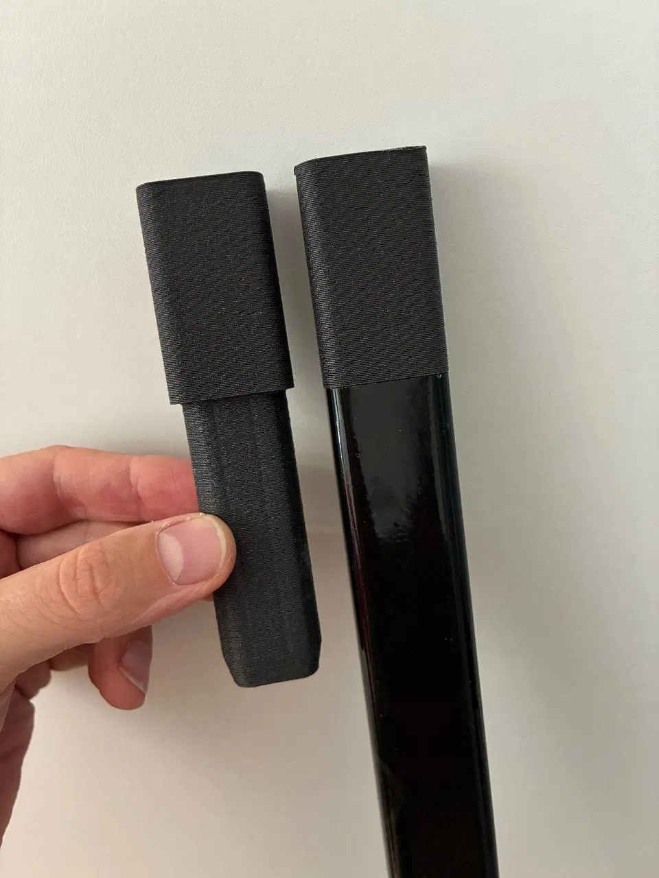 Mình đã ép/ấn được món này vào gậy Warrior và Bauer. Dùng heat gun để làm nóng và nới/giãn phần shaft của gậy. Có thể dùng thêm keo nhiệt (heat glue) nếu muốn. Mình có thiết kế vài rãnh để keo có chỗ bám và đọng lại.