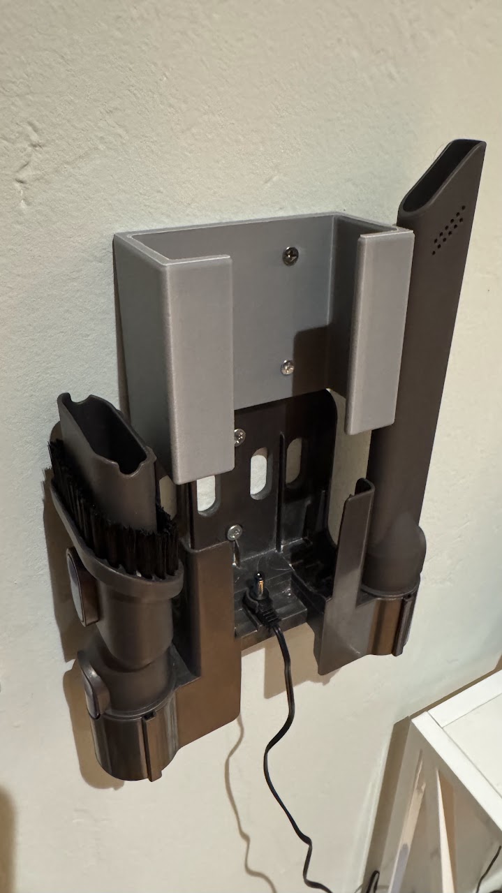 Cái wall mount đi kèm máy hút bụi này có thể treo máy lên được, nhưng do trọng lượng máy tạo lực đòn bẩy khá lớn nên phần dưới bị nghiêng áp về phía tường, nhìn là thấy kiểu gì về lâu dài cũng dễ làm nứt/gãy cái ngàm nhựa của mount.