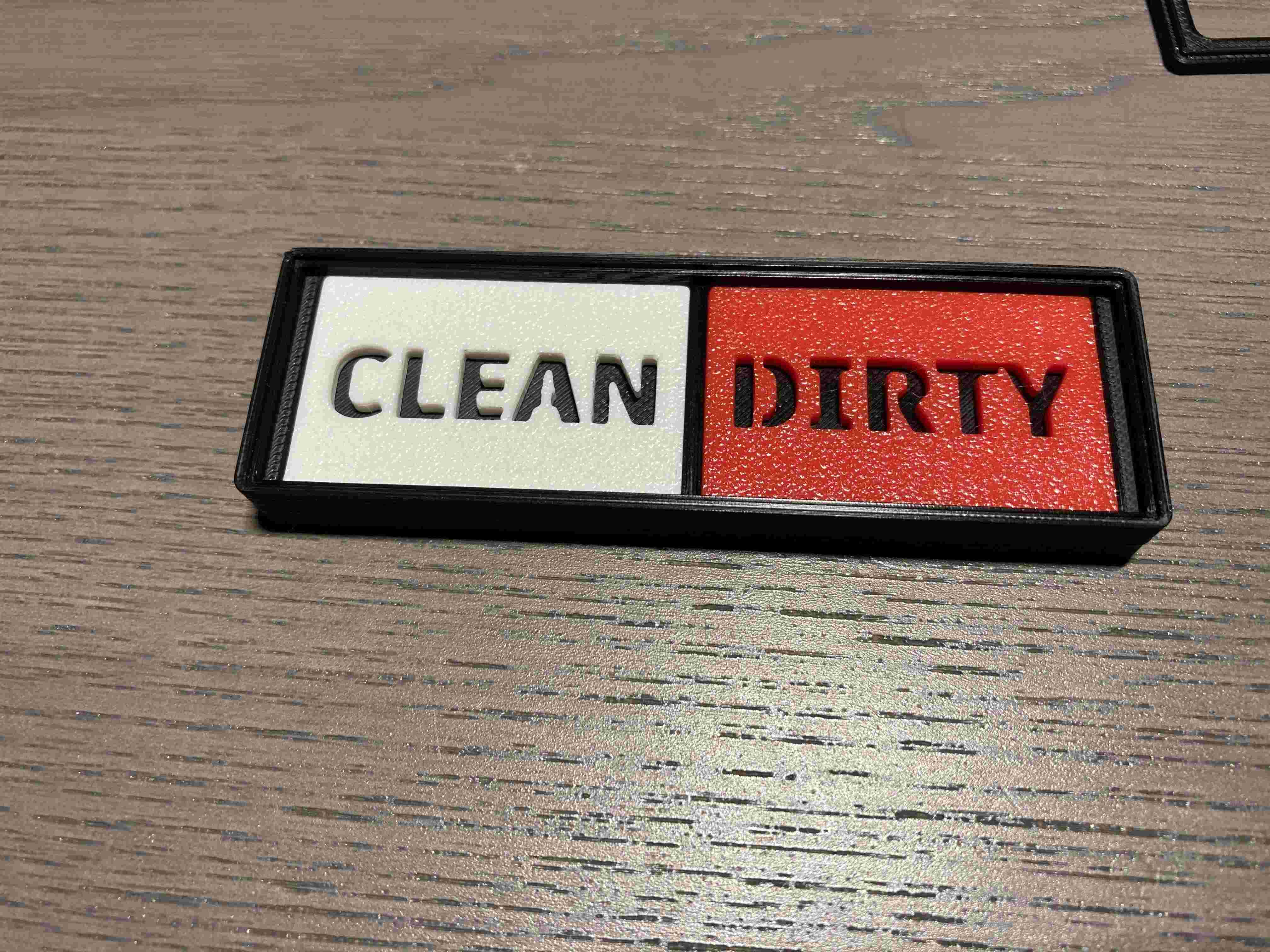 Bảng hiệu trượt cho máy rửa chén để báo chén dĩa đang sạch hay bẩn. Cơ chế trượt “bấm” vào vị trí nhờ nam châm, in 100% để fit khít; có bản dùng nam châm 6mm hoặc 8mm (dày 3mm).