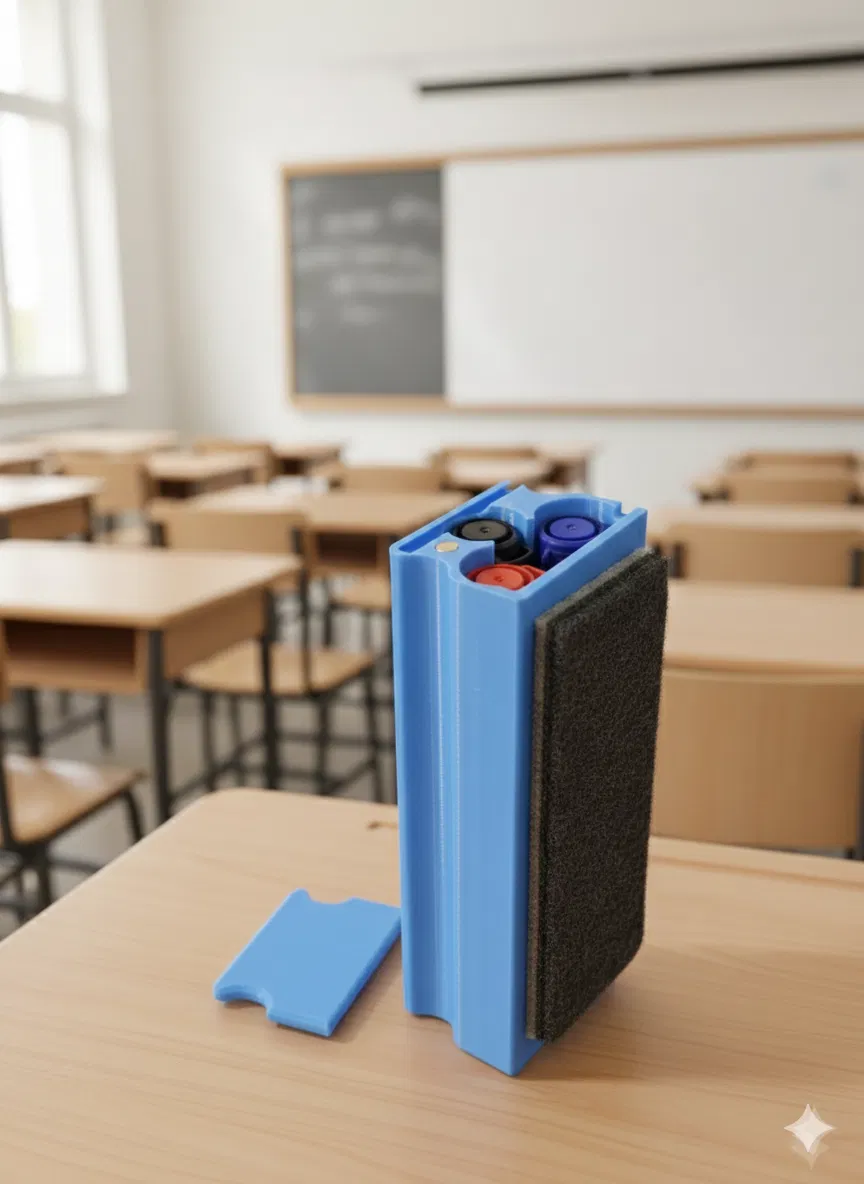Holder/hộp đựng bút lông bảng (dry-erase markers) gọn gàng, phù hợp cho lớp học và giảng dạy. Chỉ cần dán thêm miếng nỉ (felt) và chuẩn bị 2 viên nam châm 5mm x 1.8mm.