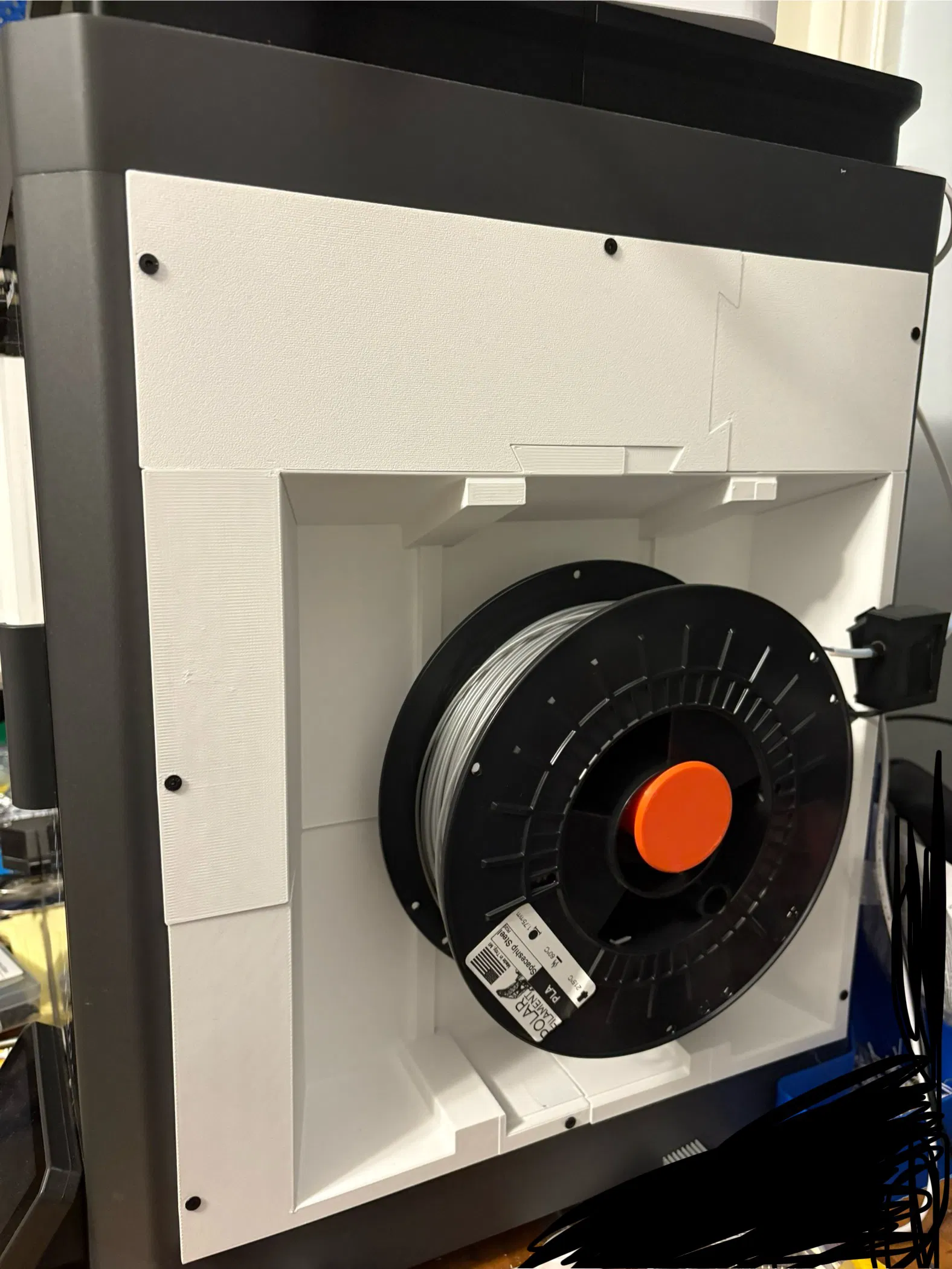 Bản thay thế side panel zin của CC1 giúp setup Elegoo Centauri Carbon gọn hơn cho chỗ hẹp. In với supports/infill tiêu chuẩn dùng chưa tới 1 cuộn filament. Có bản uncut và precut, tương thích spool holder Prusa Core One.