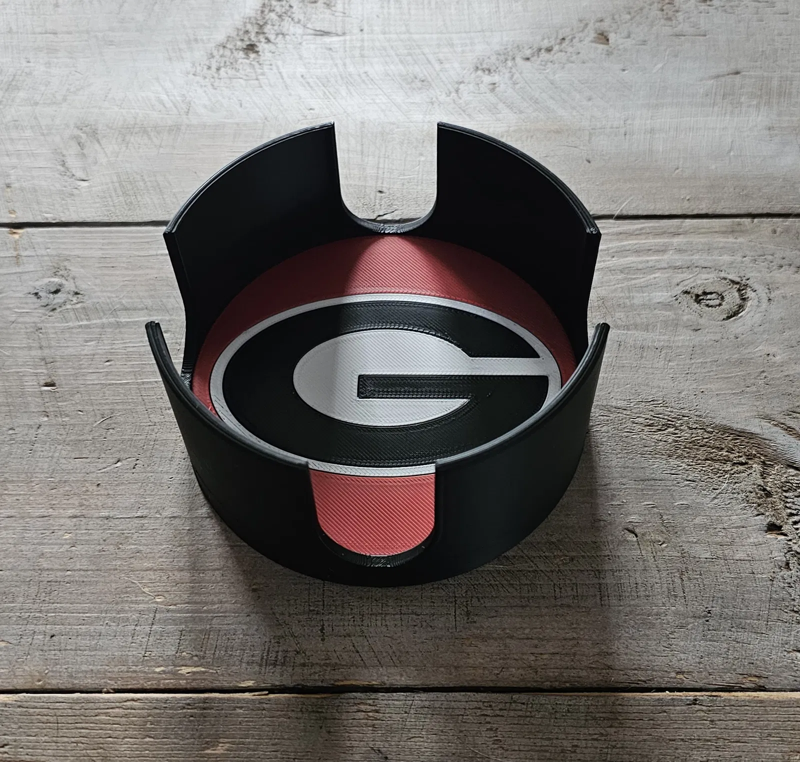 Giá đựng lót ly (coaster) UGA, lấy ý tưởng từ mẫu trên Printables. Phù hợp để sắp xếp gọn gàng các coaster UGA, trưng bày trên bàn làm việc hoặc bàn tiếp khách. Go Dawgs!!