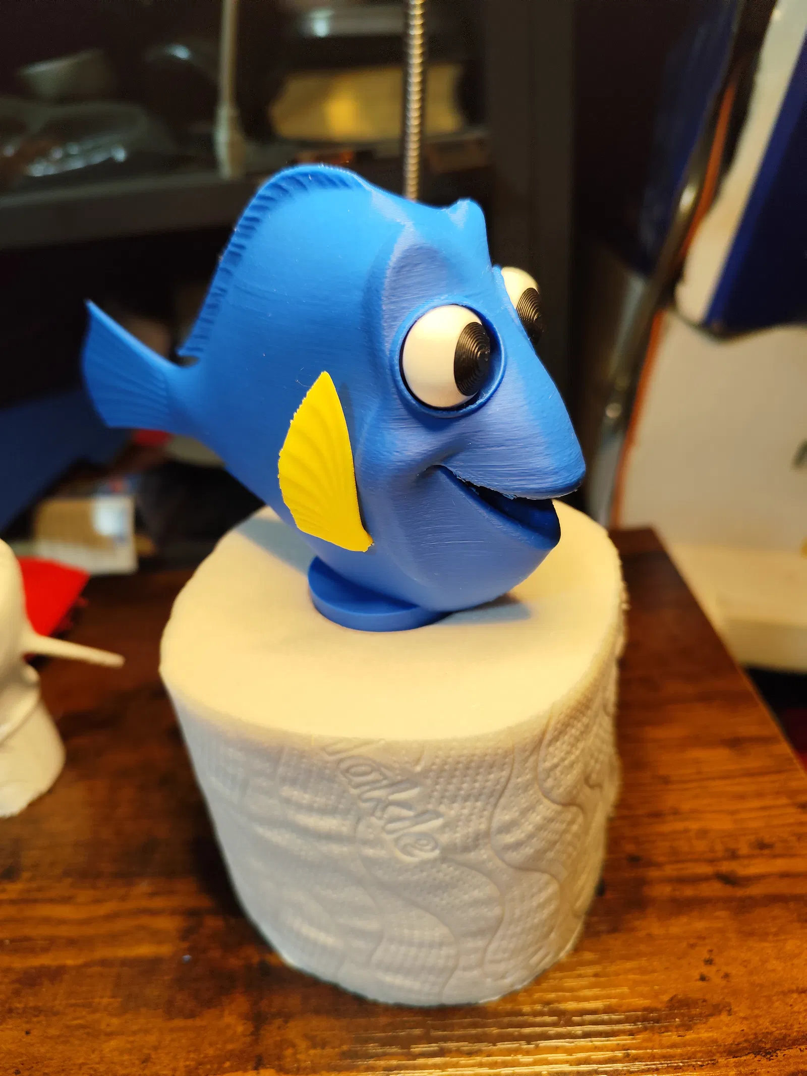 Model Dory trong Finding Nemo, có peg cho vây để chỉnh góc, thêm mắt không peg để chọn hướng nhìn. Khi in mắt cần đổi filament vài lớp cuối từ trắng sang đen. Có kèm đế để model đứng vững.