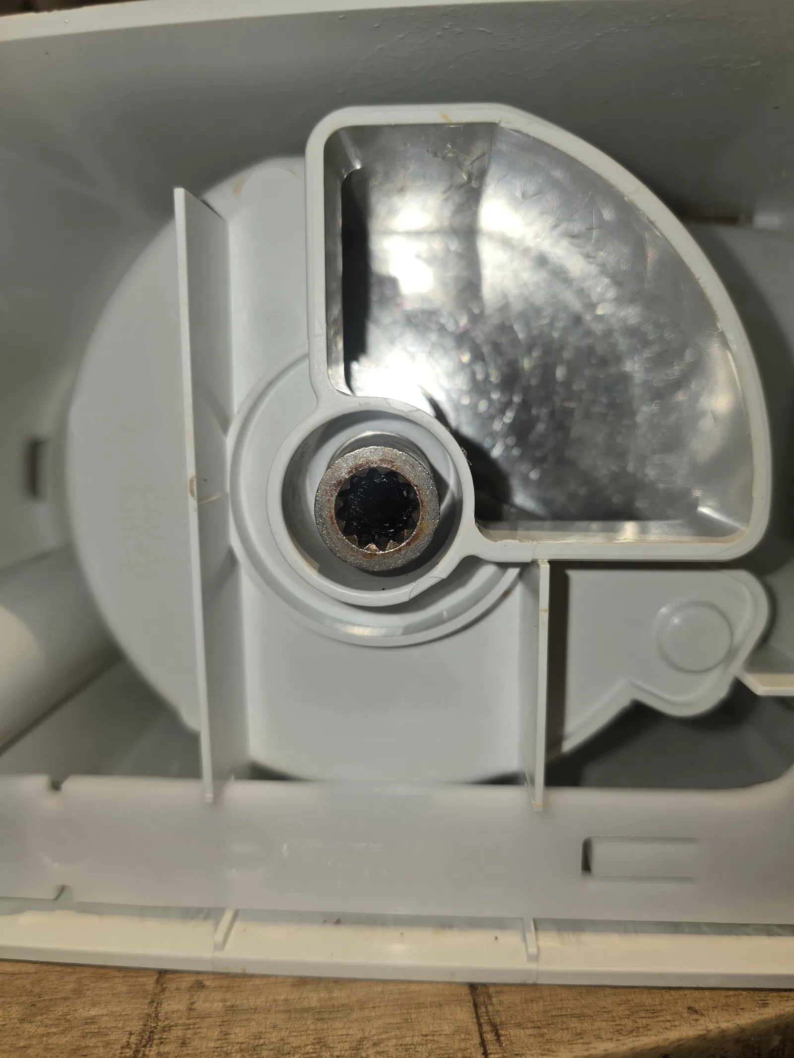 Máy làm đá (icemaker) KitchenAid của mình giờ không còn xoay nữa khi gạt cần lấy đá. Các răng trên icemaker dùng để quay bộ khuấy (rotating mixer) không còn bám được vào con ốc lục giác (hex nut) nối với ngăn đá. Món này giúp “siết khít” lại phần răng của hộp đá vào hex nut của ngăn đá. (xem hình để rõ hơn).
