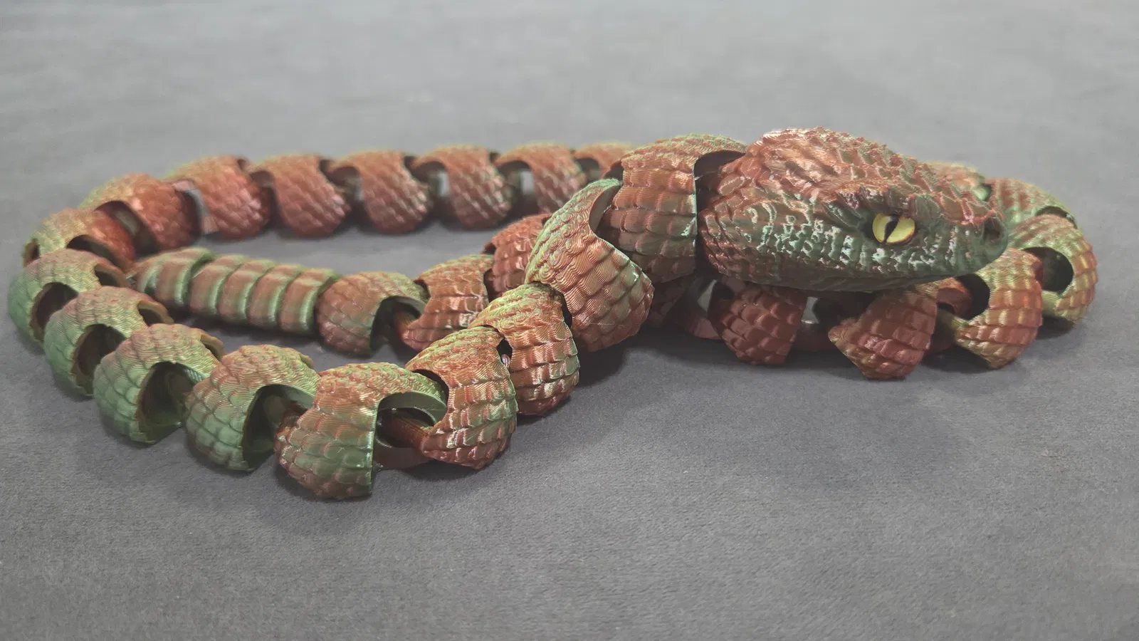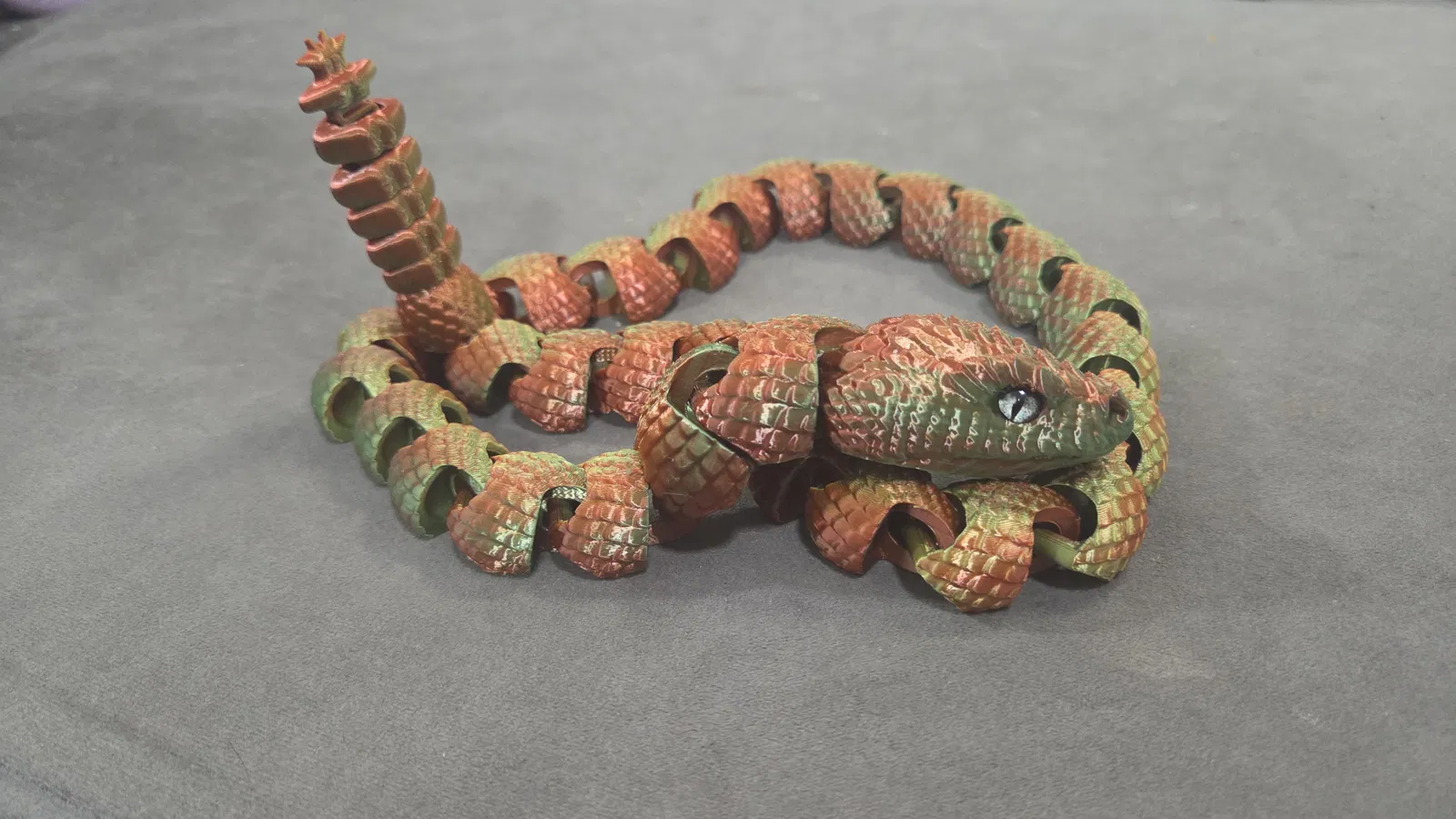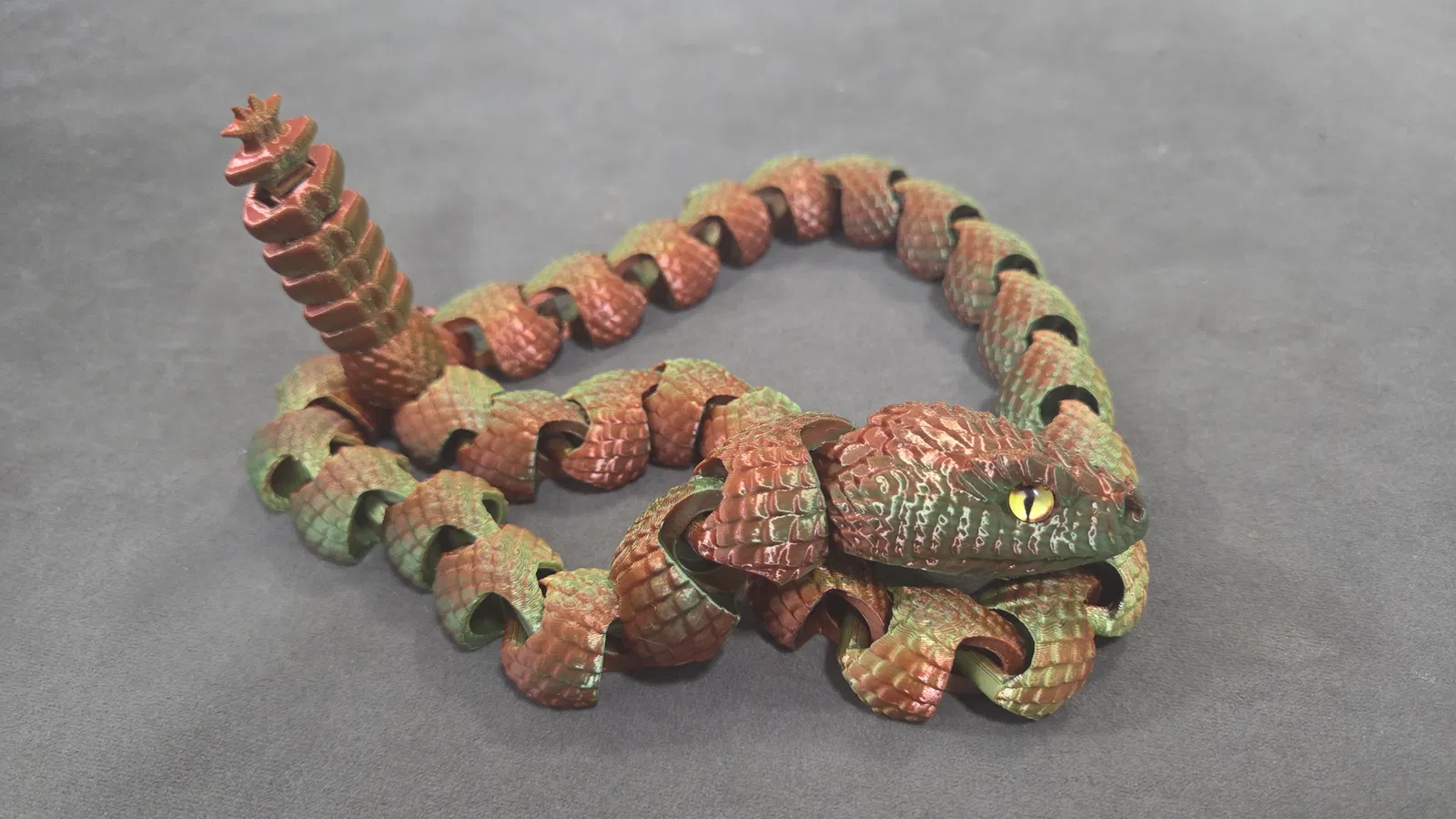 Mẫu Rattlesnake v2.2 (từ Davis_County_Library) đã chỉnh để gắn mắt thủy tinh 6mm. Có file 3MF, lỗ mắt sẽ thấy sau khi slicing. Kèm supports tích hợp và supports “paint” thêm tùy chọn.