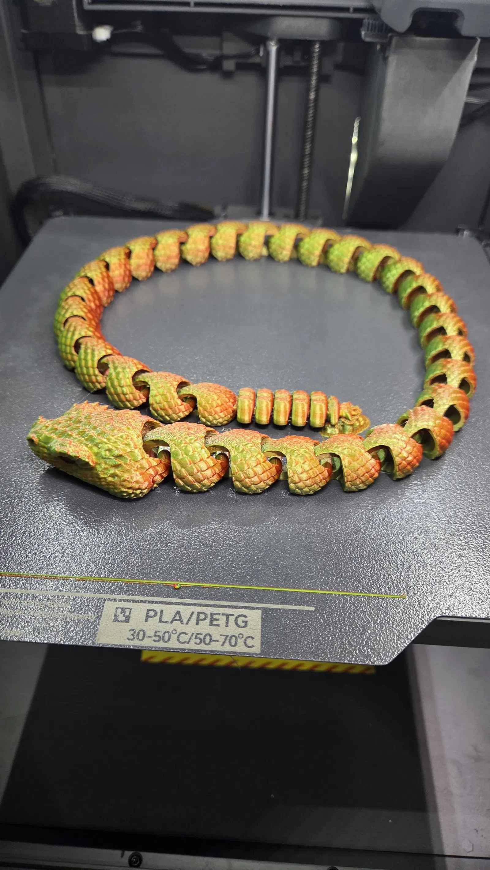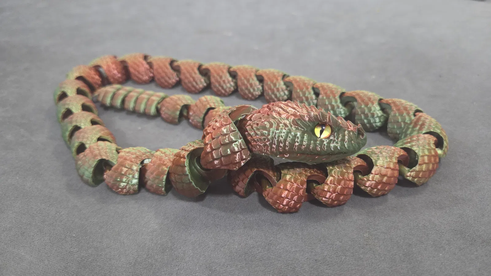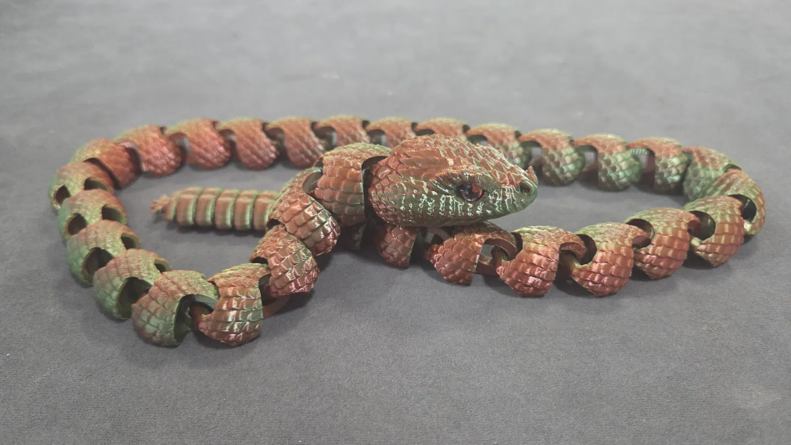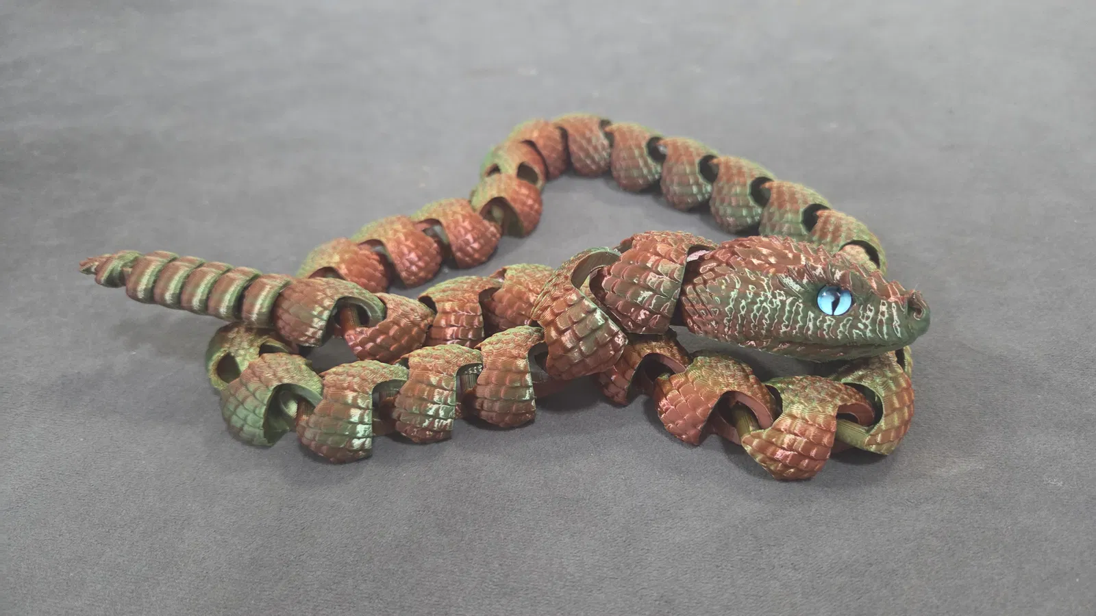 Mẫu Rattlesnake v2.2 (từ Davis_County_Library) đã chỉnh để gắn mắt thủy tinh 6mm. Có file 3MF, lỗ mắt sẽ thấy sau khi slicing. Kèm supports tích hợp và supports “paint” thêm tùy chọn.