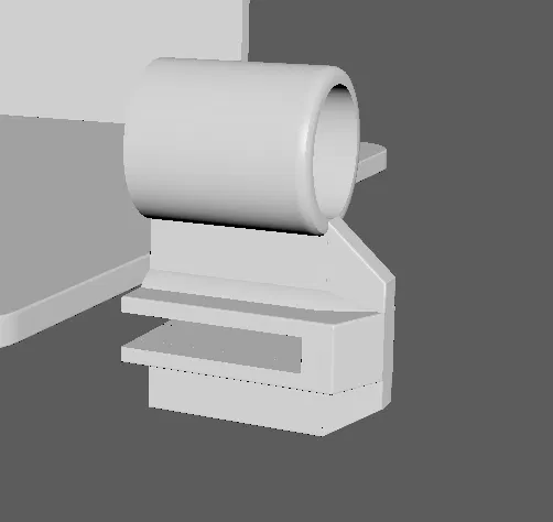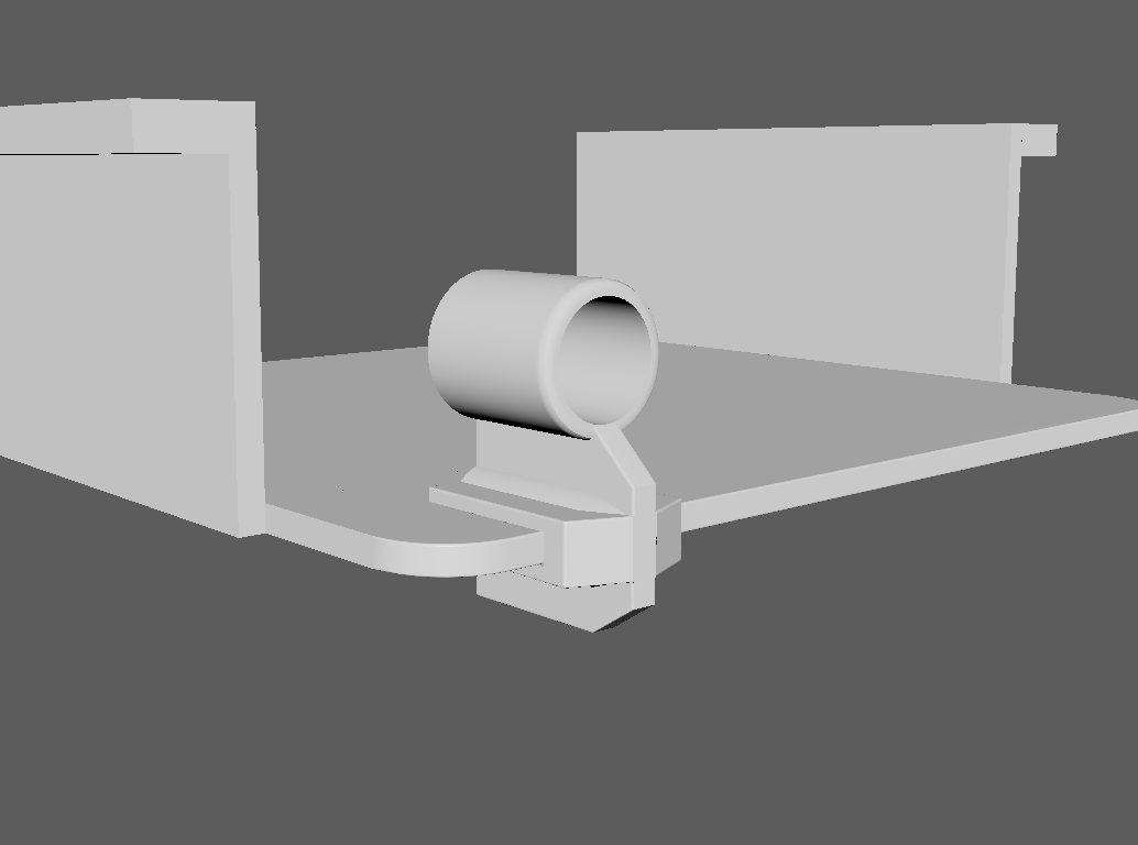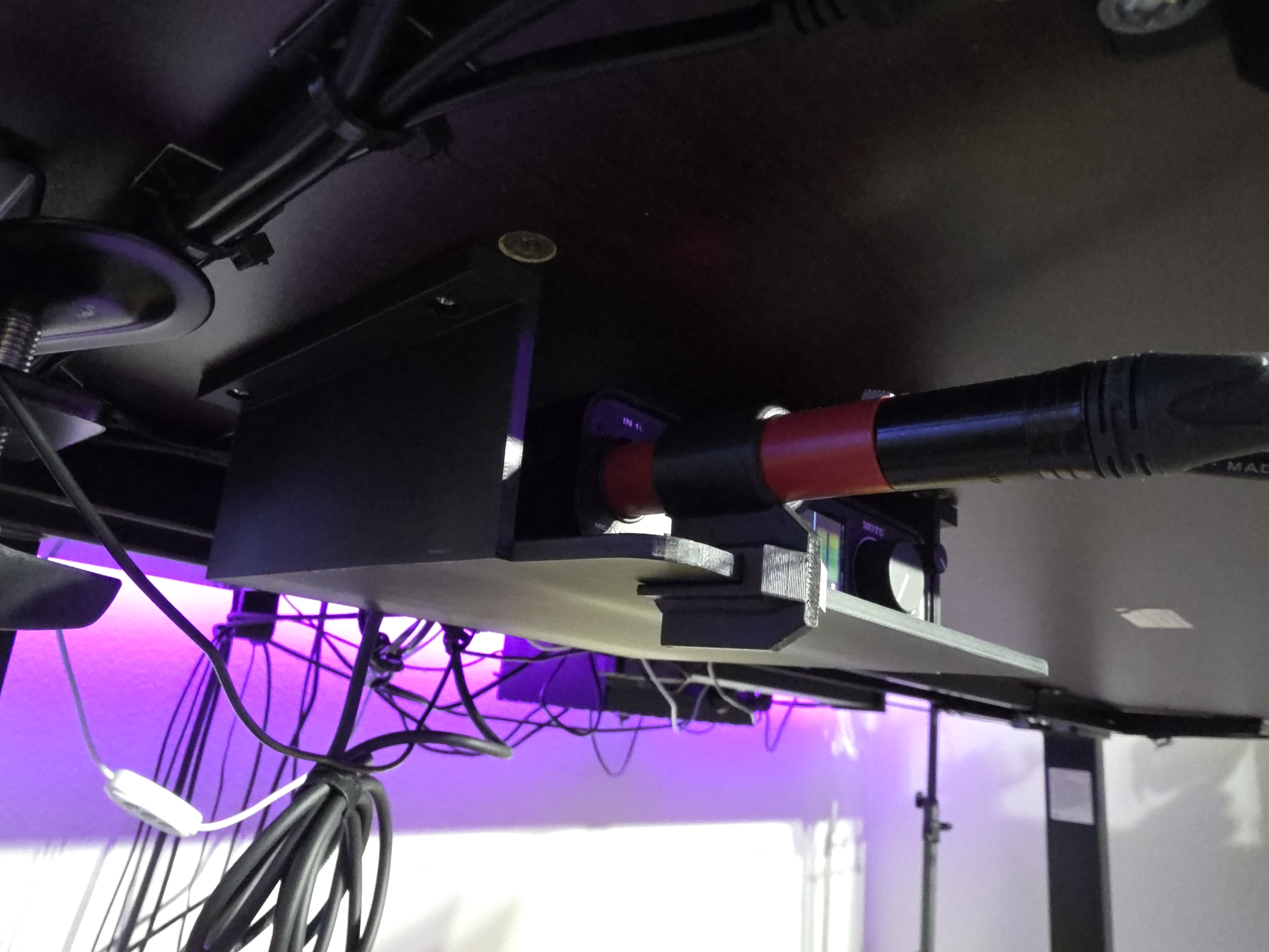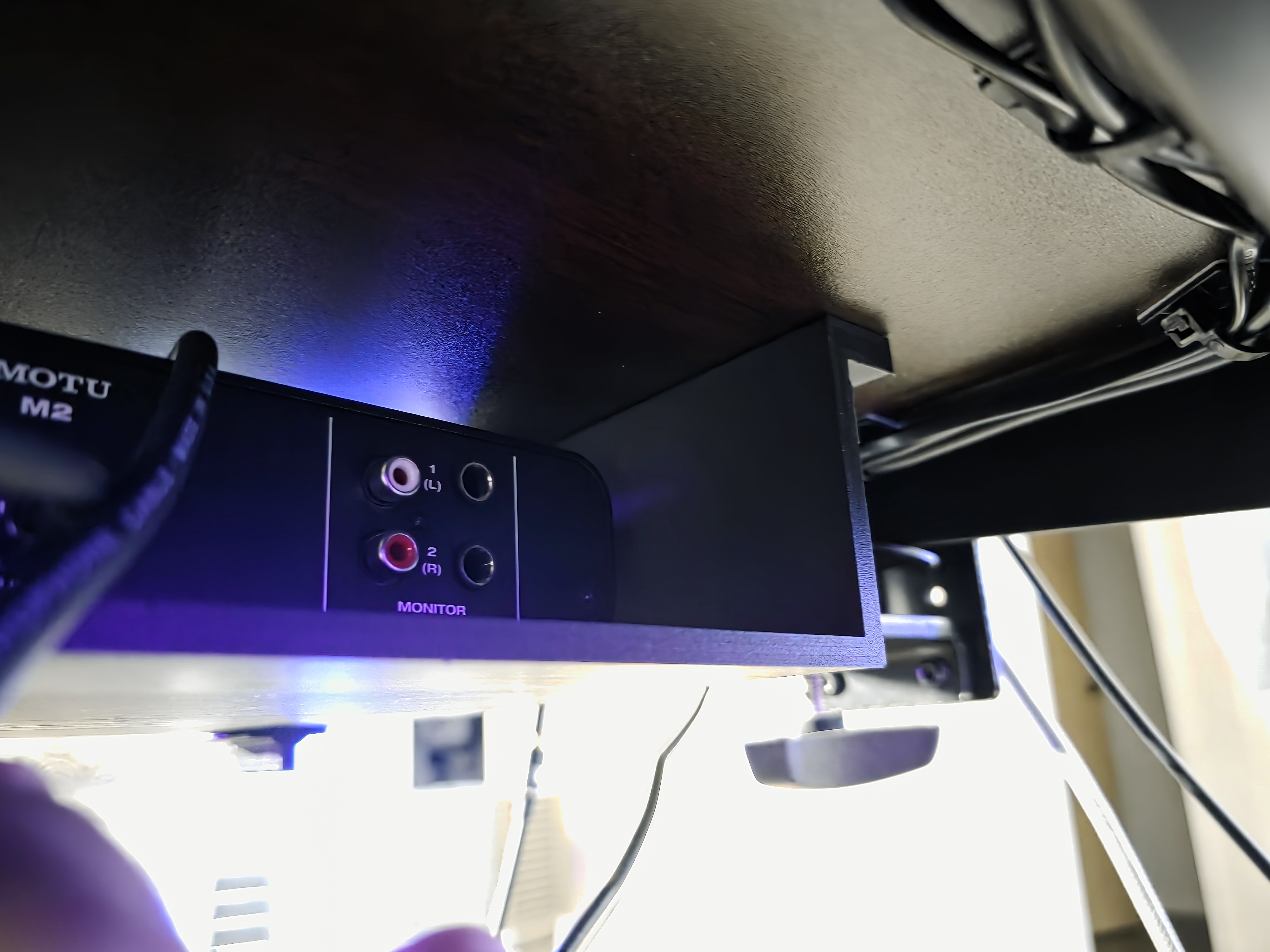 Khay mount gắn dưới bàn (under desk) cho MOTU M2. Thiết kế không kẹp chặt nên vẫn có chút khoảng trống để dịch chuyển; phía sau mở, phía trước cũng mở. Phần mép trước được kéo dài, kèm thêm một clip trượt (slide-on) để dùng với mic có gắn Dynamite Stick microphone lifter, giúp tránh bị võng ở cổng và dây cáp.