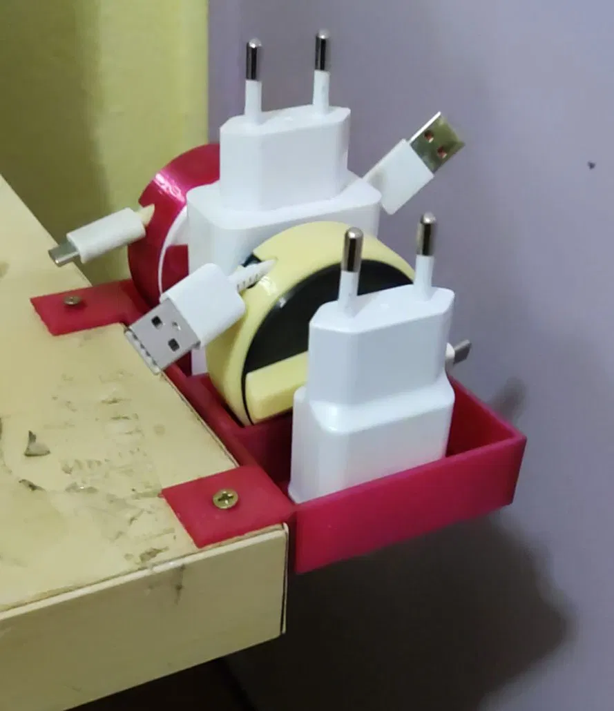Charger Holder là đế giữ sạc có các khe thiết kế riêng để gắn/đặt cuộn dây cáp. Mẫu được in trên Bambu Lab A1 với filament PETG màu đỏ của SUNSU; kèm link tham khảo cuộn dây cáp.