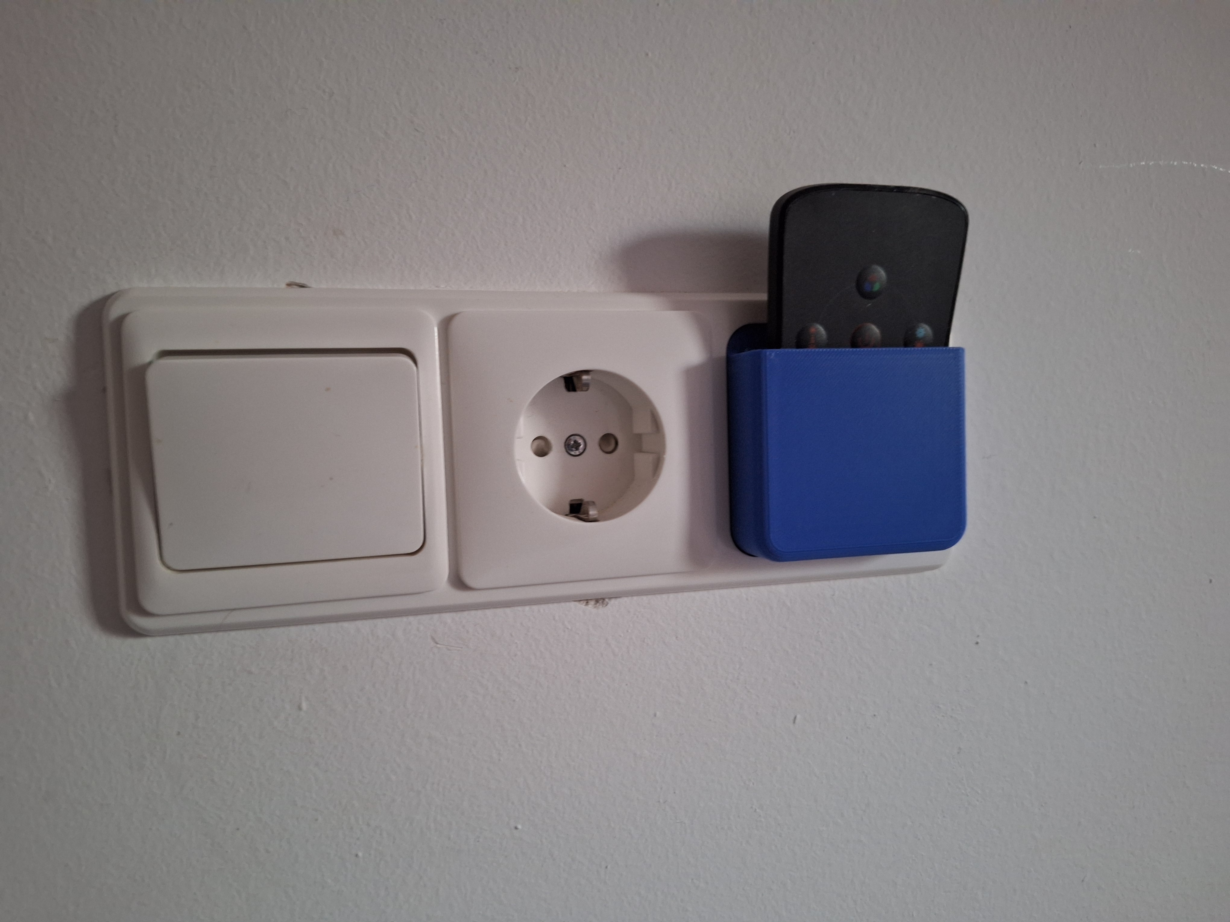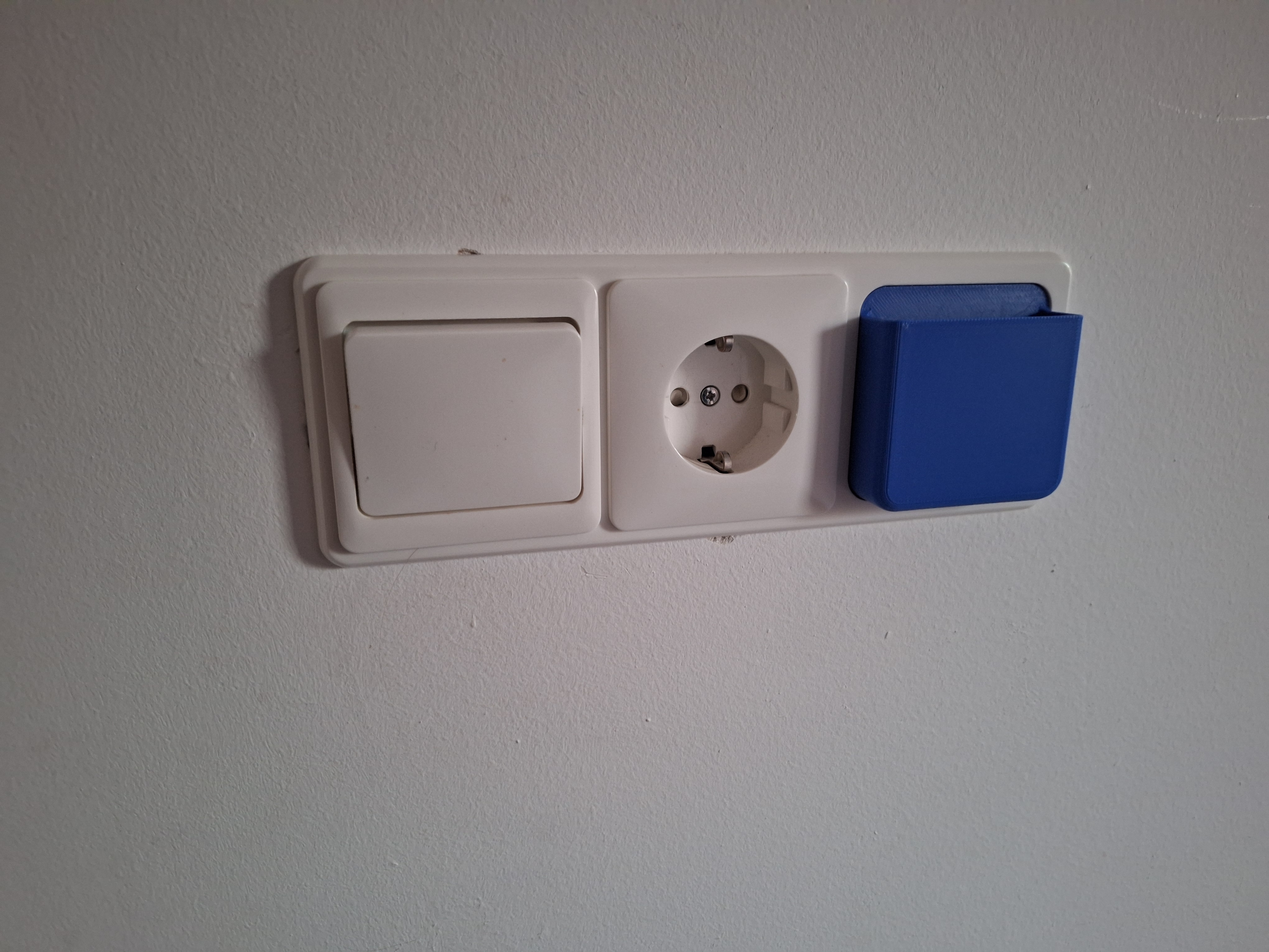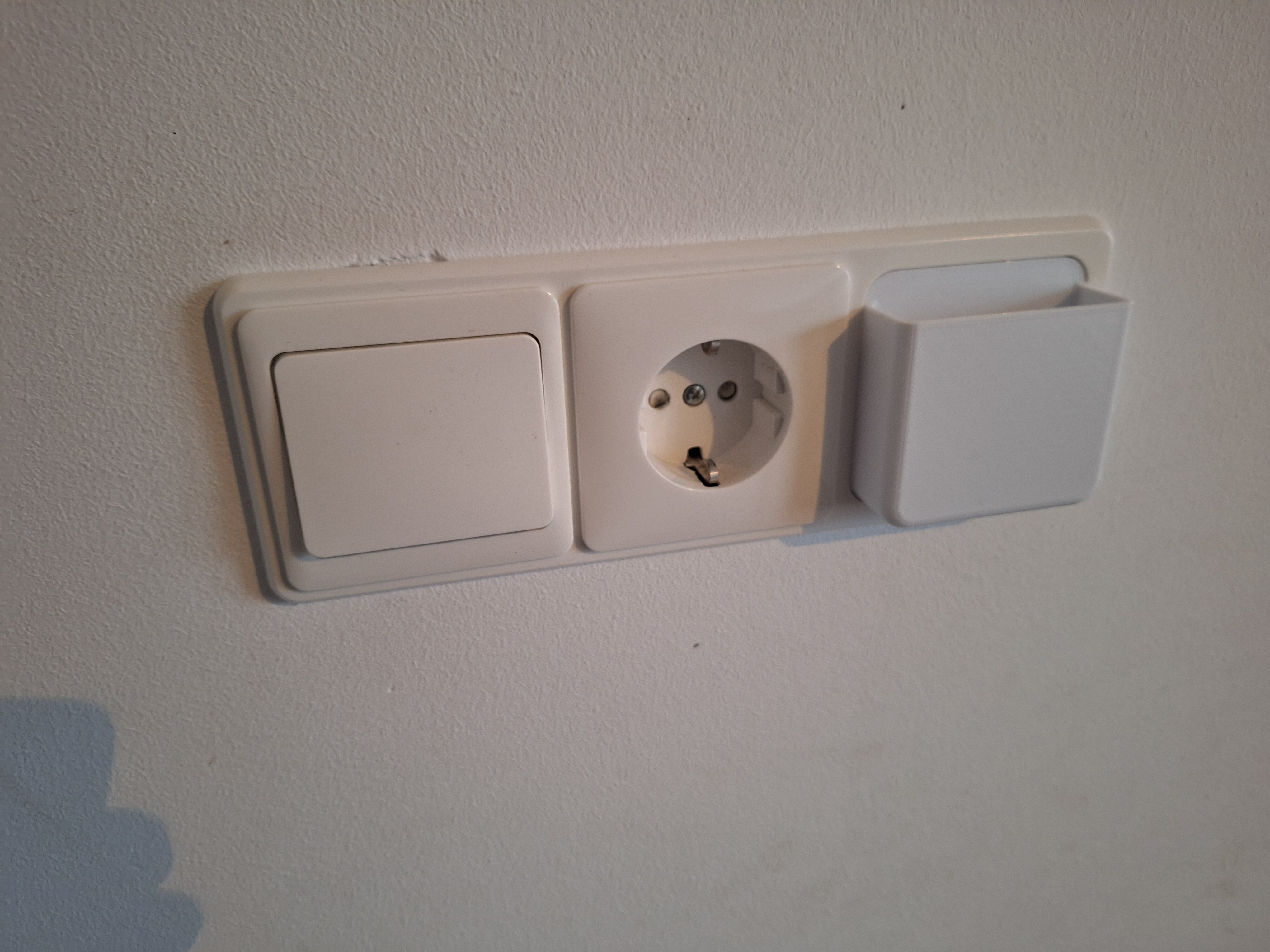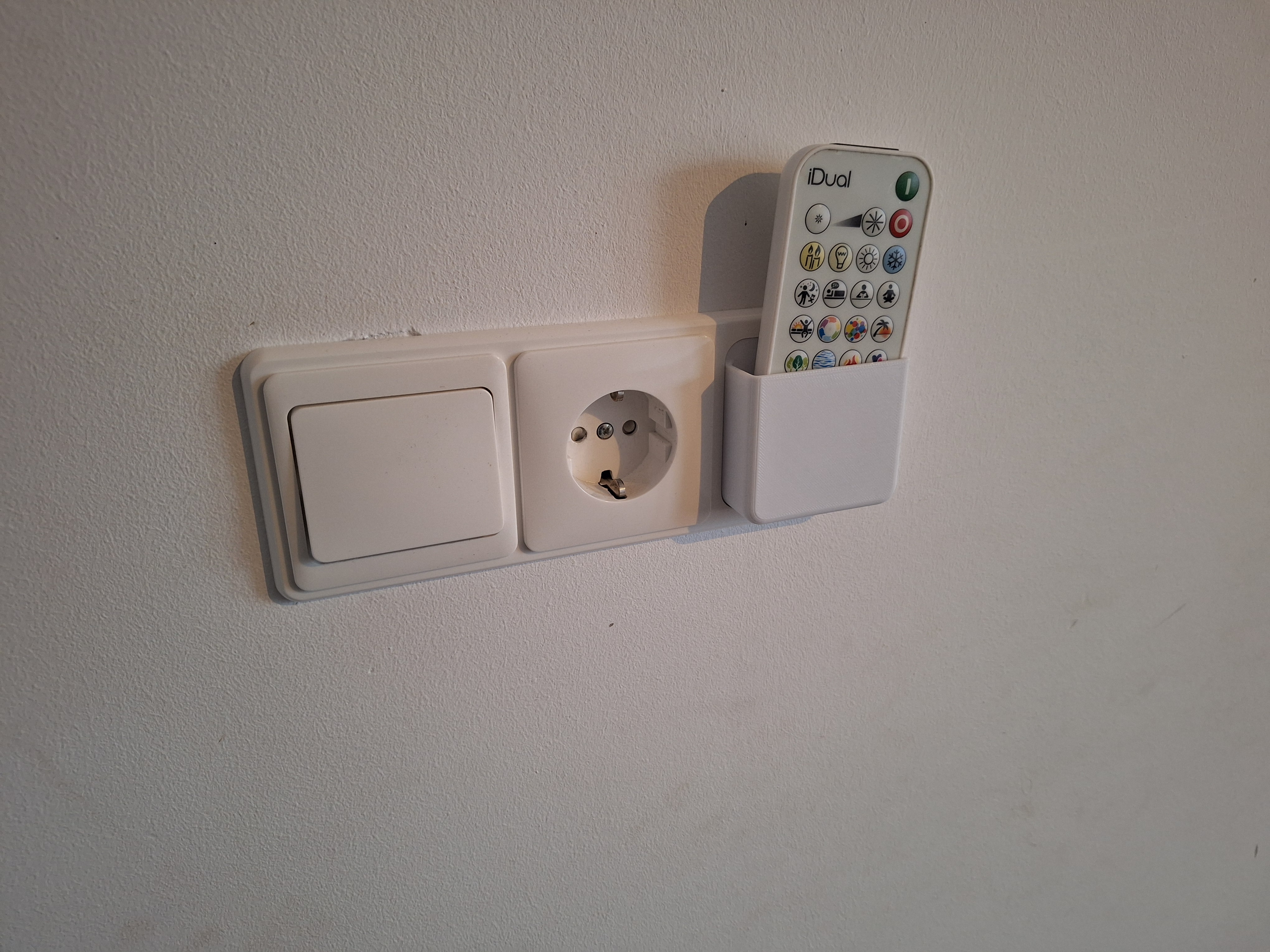 Một cái holder cho remote control, vừa khít hoàn hảo bên trong mountingplate PEHA loại basic dành cho công tắc đèn và ổ cắm. Khi lắp lên sẽ nằm phẳng sát tường. Mountingplate được cố định nhờ ổ cắm và công tắc.