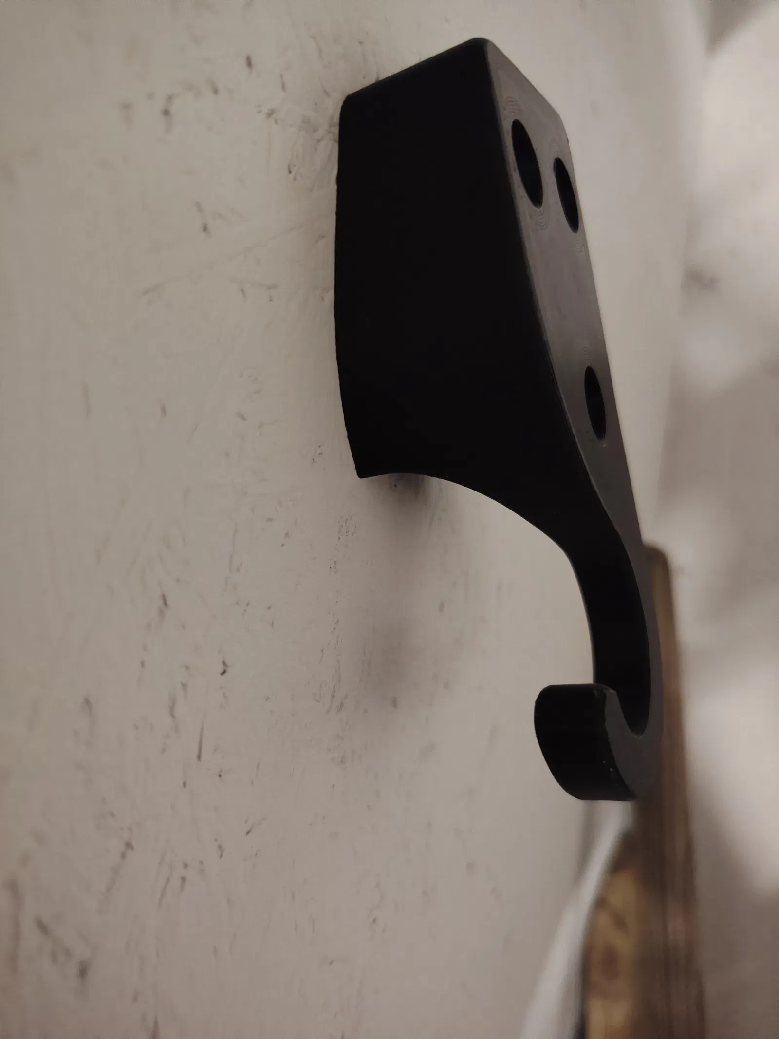 Móc treo cưa xích gắn tường, in nhanh và dễ. Thiết kế chắc chắn, đặt phần móc úp xuống build plate và tăng walls/top/bottom để móc đặc. Lỗ bắt vít 6 mm, có kèm file STEP để chỉnh.