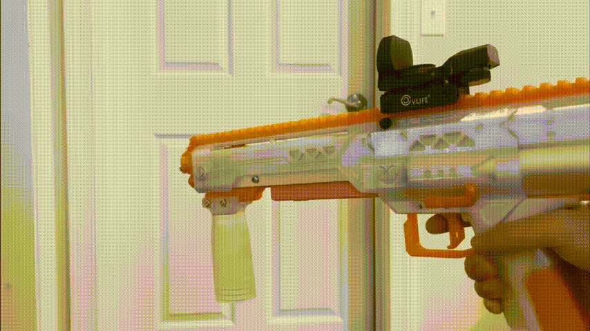 Dòng Lynx mặc định có slam fire do cơ chế hoạt động, nhưng vì vậy việc deprime (xả cò/nhả catch để trả về trạng thái chưa lên đạn) lại khá lủng củng. Nhiều lúc bạn phải nạp một viên dart, hoặc cứ để nó dry fire, vì các chiều dài barrel “chuẩn” thường bị chặn lại trong phần shroud. Cái block này trượt vào giữa pump grip và catch block để bật chức năng deprime bằng trigger trong khi vẫn giữ pump kéo về sau.