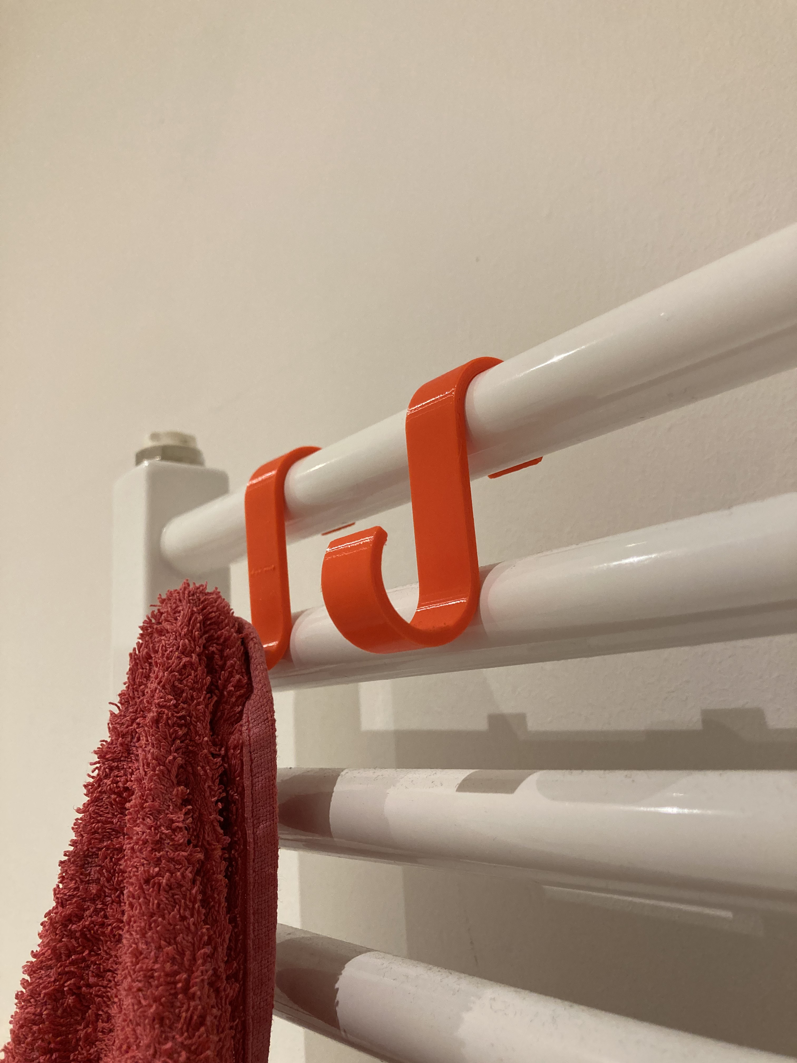 Móc treo khăn đơn giản để treo và sắp xếp khăn trên thanh sưởi (radiator) trong phòng tắm. In nhanh, dễ. Khuyến nghị dùng PETG/ASA/ABS vì PLA có thể bị biến dạng khi radiator nóng lên.