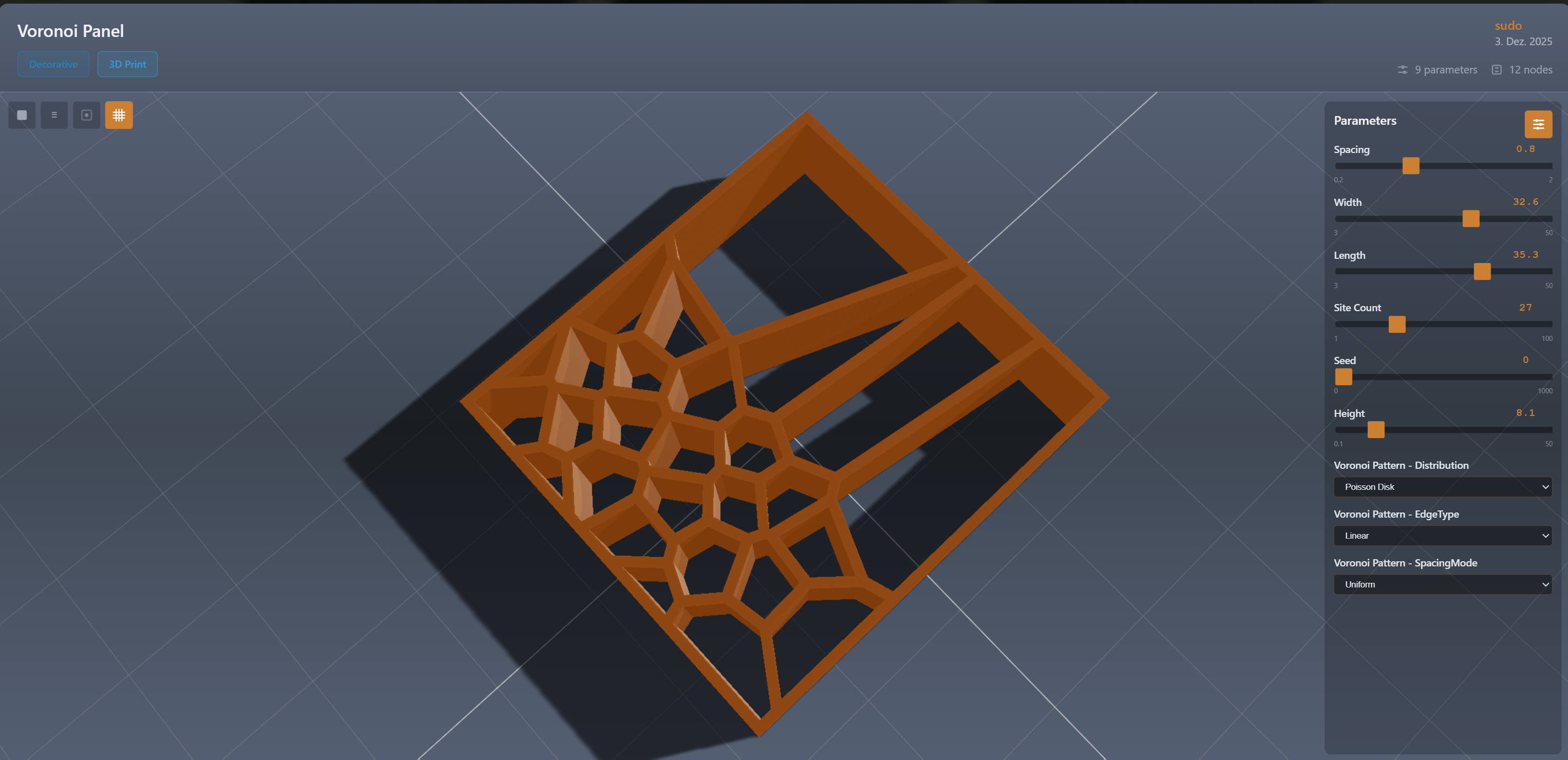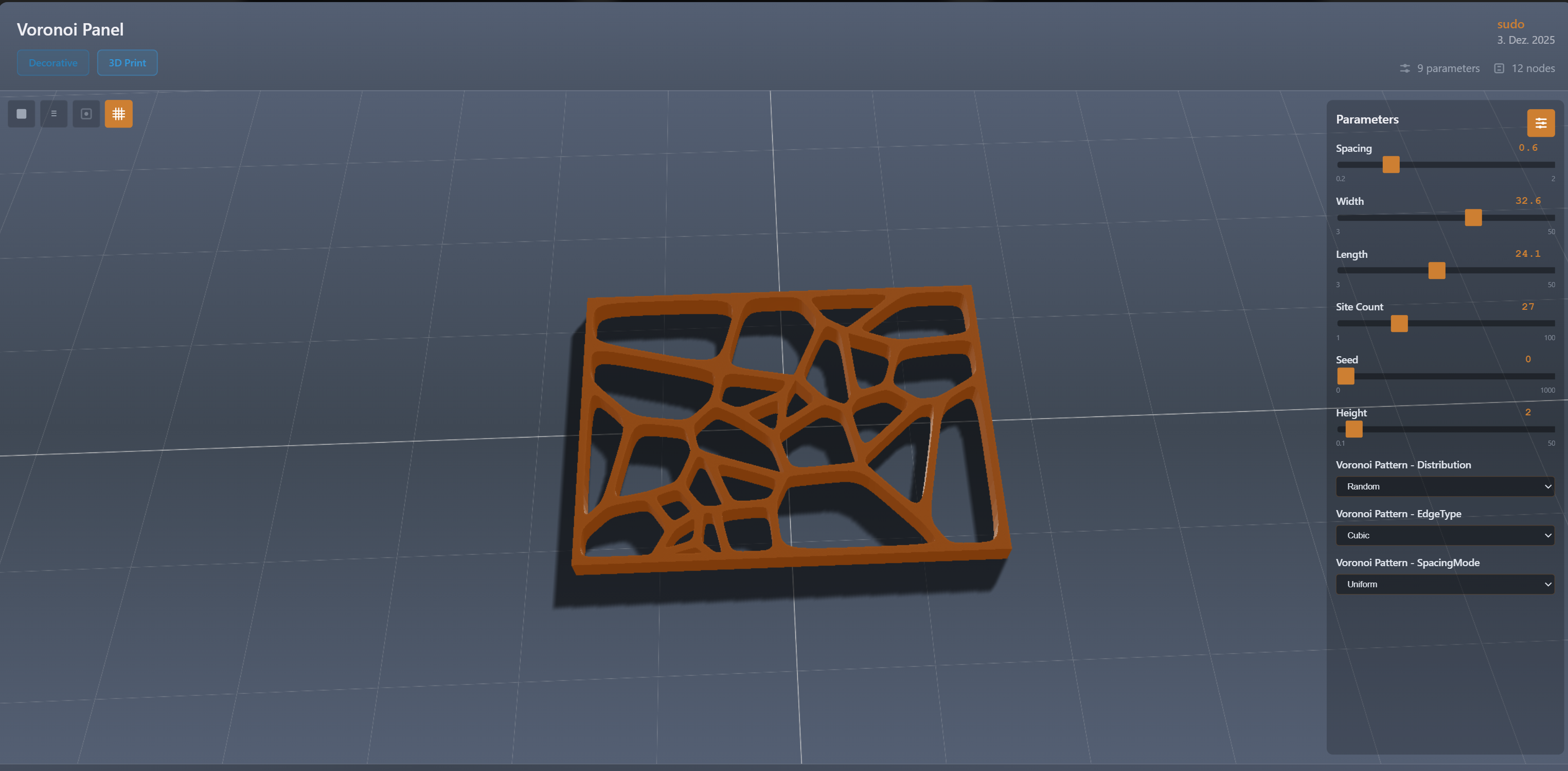 Parametric Voronoi Panel là tấm panel Voronoi dạng parametric, cho phép bạn tùy chỉnh linh hoạt theo nhu cầu rồi tải về trực tiếp từ liên kết. Phù hợp để tạo vách trang trí, ốp tường hoặc bề mặt thông gió.