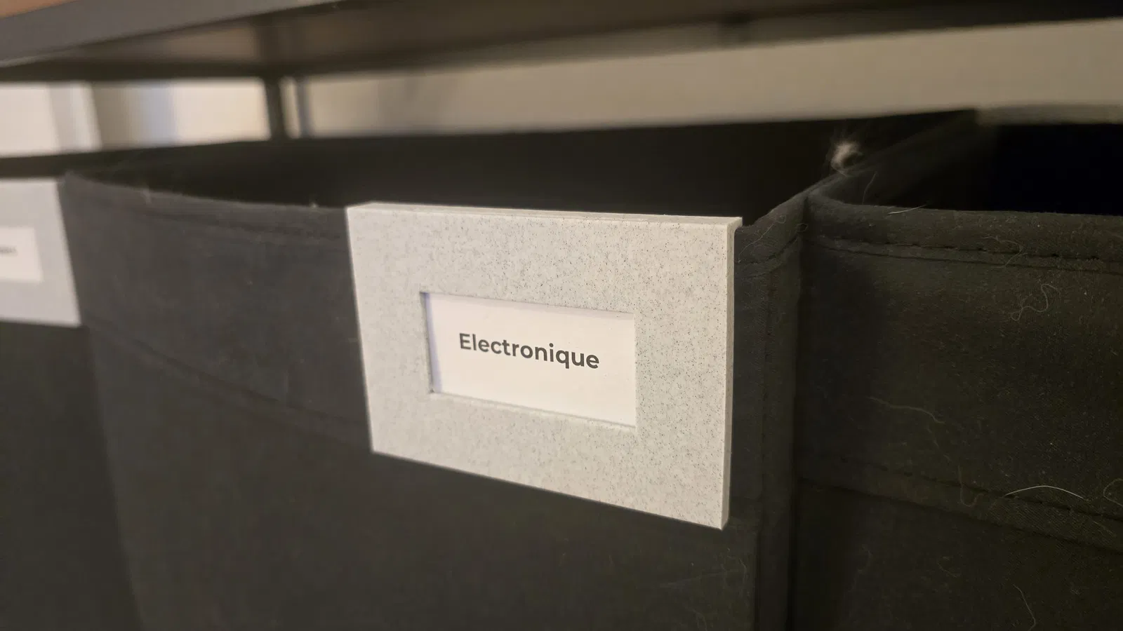 Khung giữ nhãn cho hộp Ikea DRÖNA, giúp dán/đút nhãn để dễ phân loại đồ bên trong. Khe nhãn 6x3cm, nên làm nhãn rộng 5.9mm để trượt vào mượt hơn. In đứng trên cạnh nhỏ, không cần support.