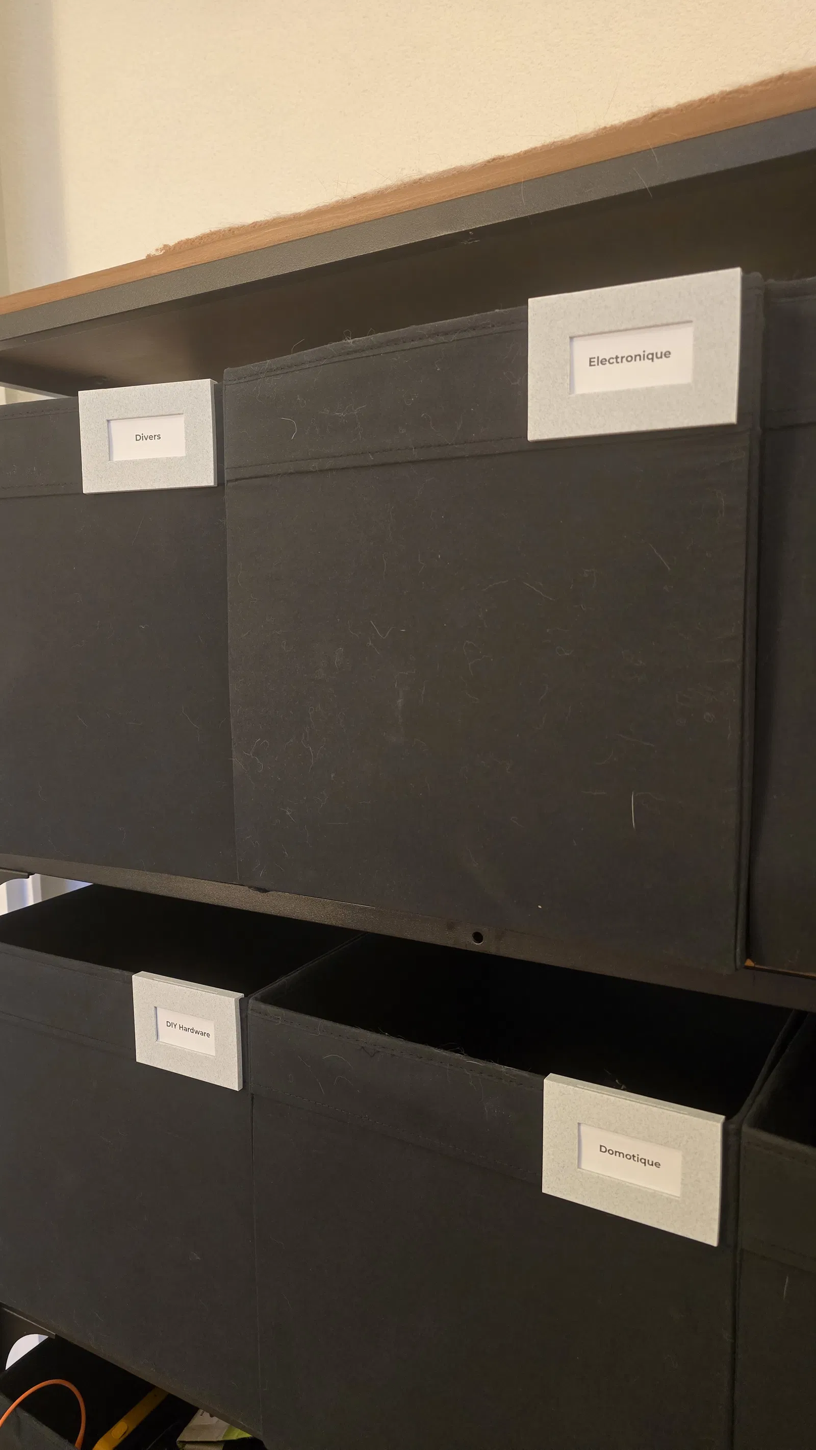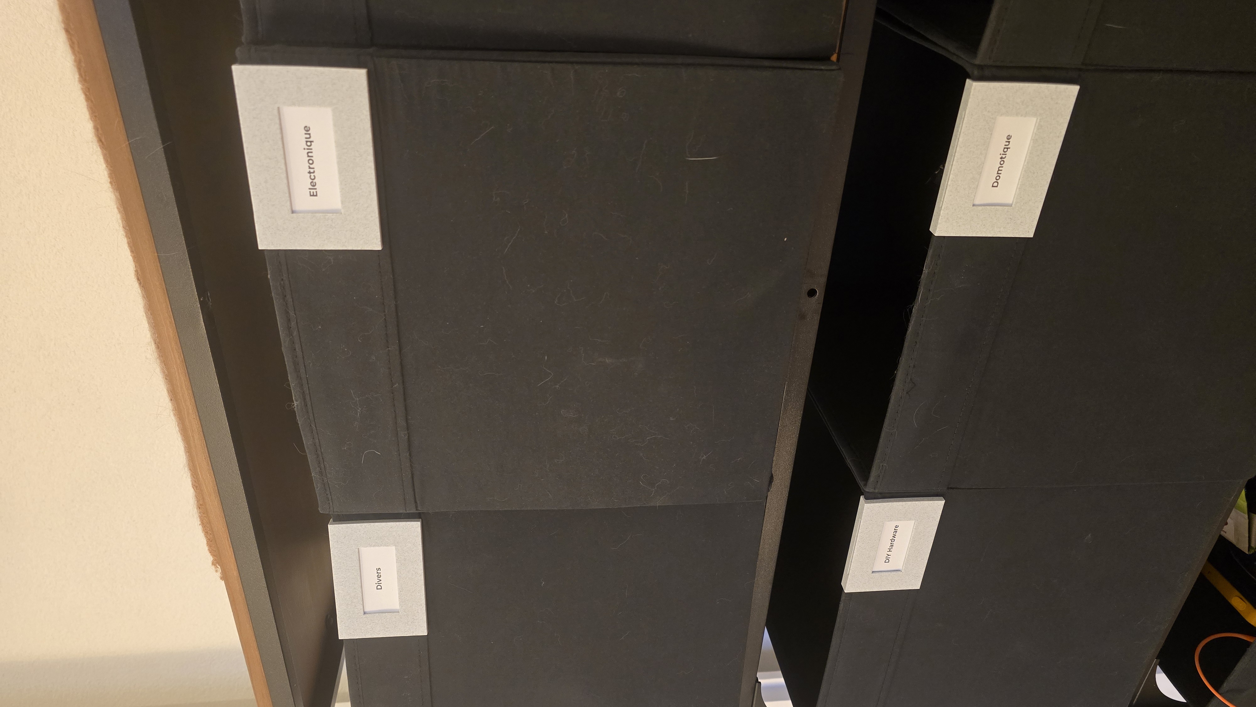 Mình mua khá nhiều hộp Ikea DRÖNA, và muốn có nhãn để nhìn vô là biết trong từng hộp đang đựng gì. Cái giá/khung giữ nhãn này hơi cao, nhưng mình muốn nó cao bằng với dải ruy-băng (ribbon) của DRÖNA.