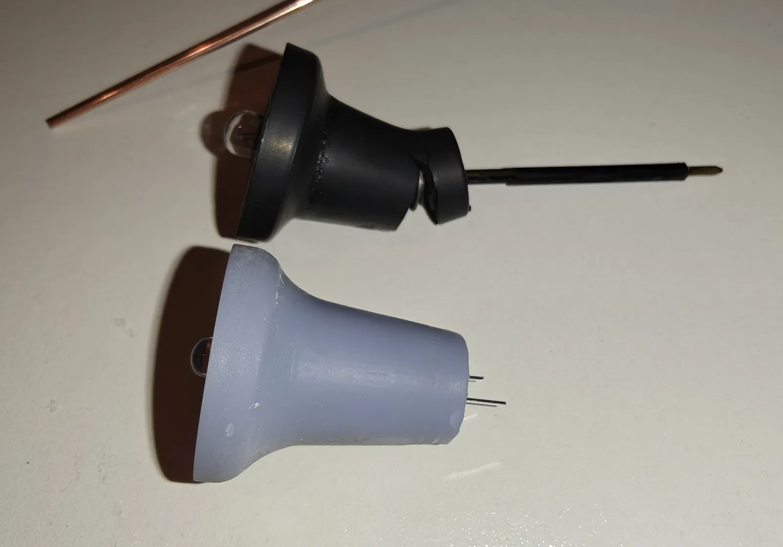 Thay vì dùng hai lò xo bên trong để cố định và tiếp xúc với cái bóng đèn nhỏ xấu xí và lỗi thời, tôi thiết kế nó để chứa một bóng LED 5mm 12V không cần thêm điện trở nào cả (chúng đã được tích hợp sẵn cho 12V).