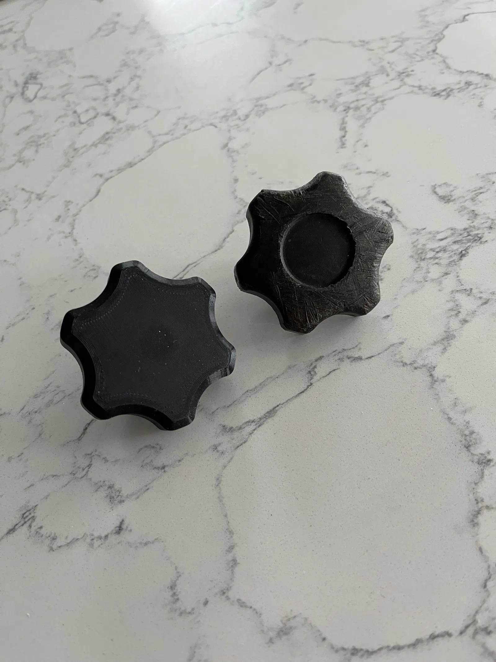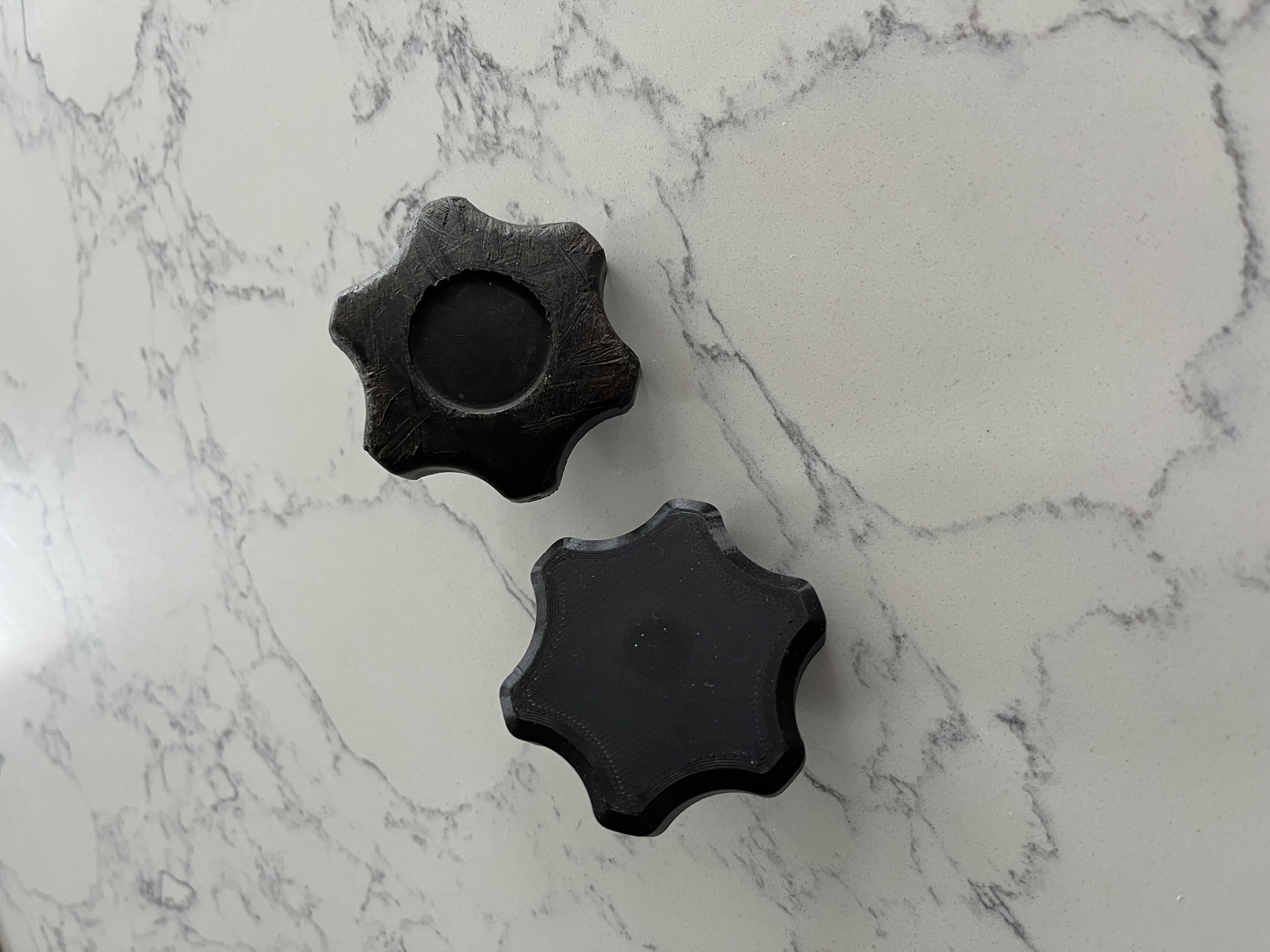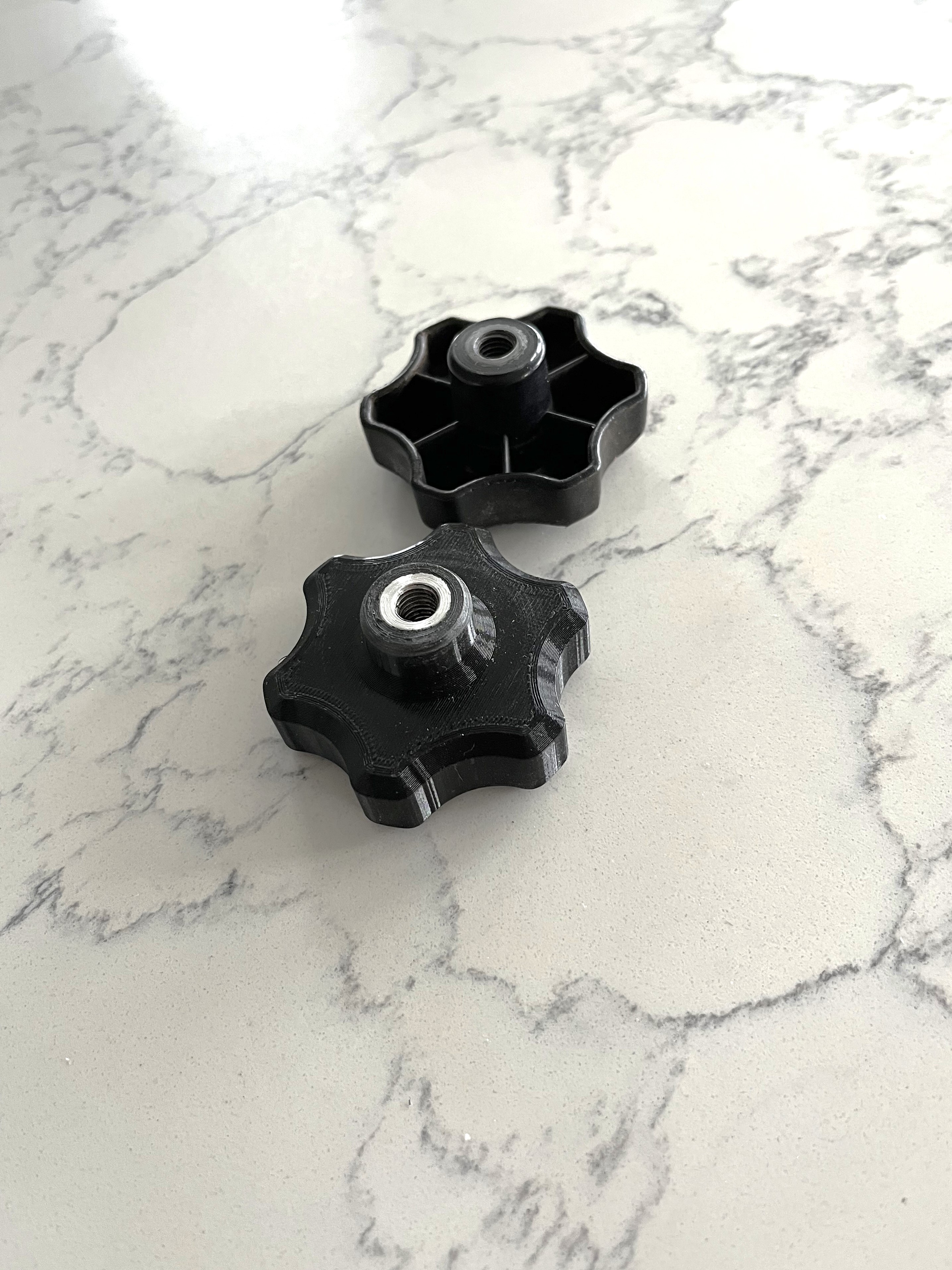 Cái wheel/nut này dùng để khóa phần tay cầm máy cắt cỏ dạng gập. Bản zin (cái còn nguyên trong cặp đôi, được chụp chung với bản in thay thế) có một ống ren nhôm knurled đường kính 12.5mm x dài 27mm, ren M8x1.25. Mình thiết kế chi tiết này để tái sử dụng lại ống ren zin đó.