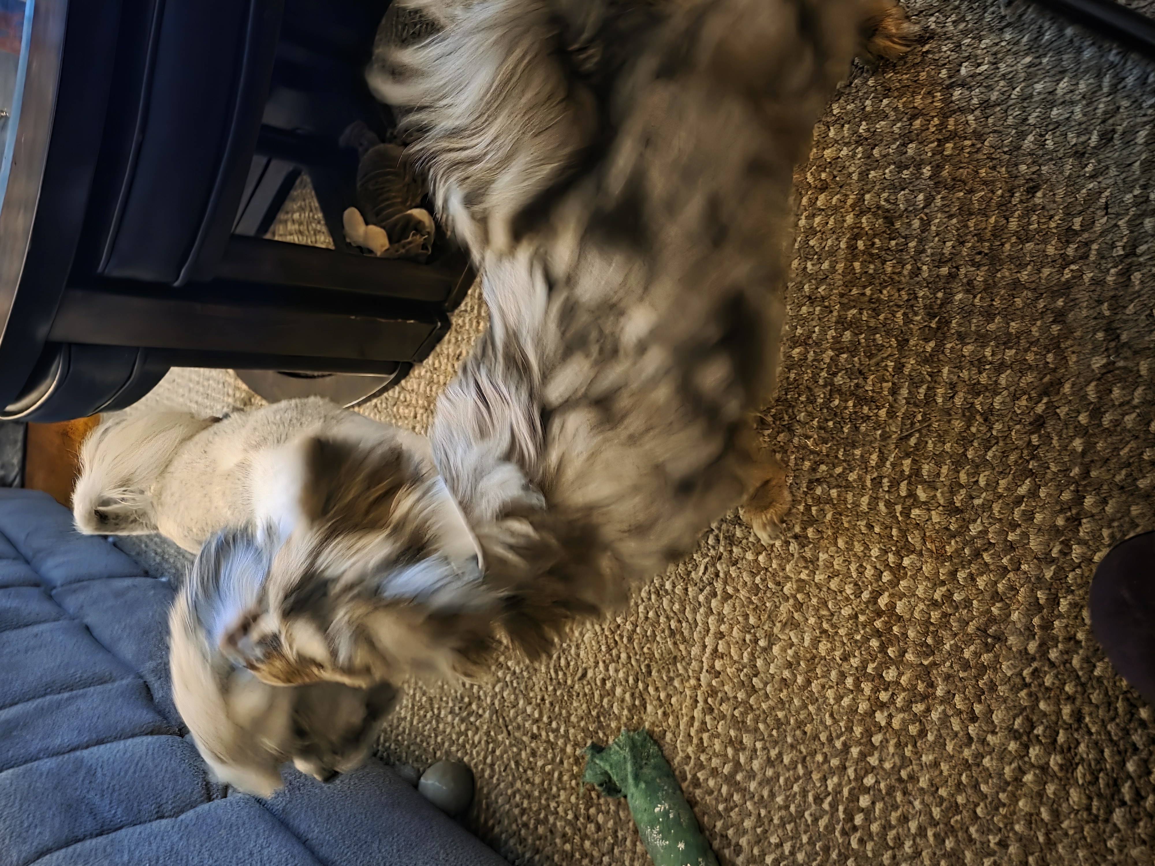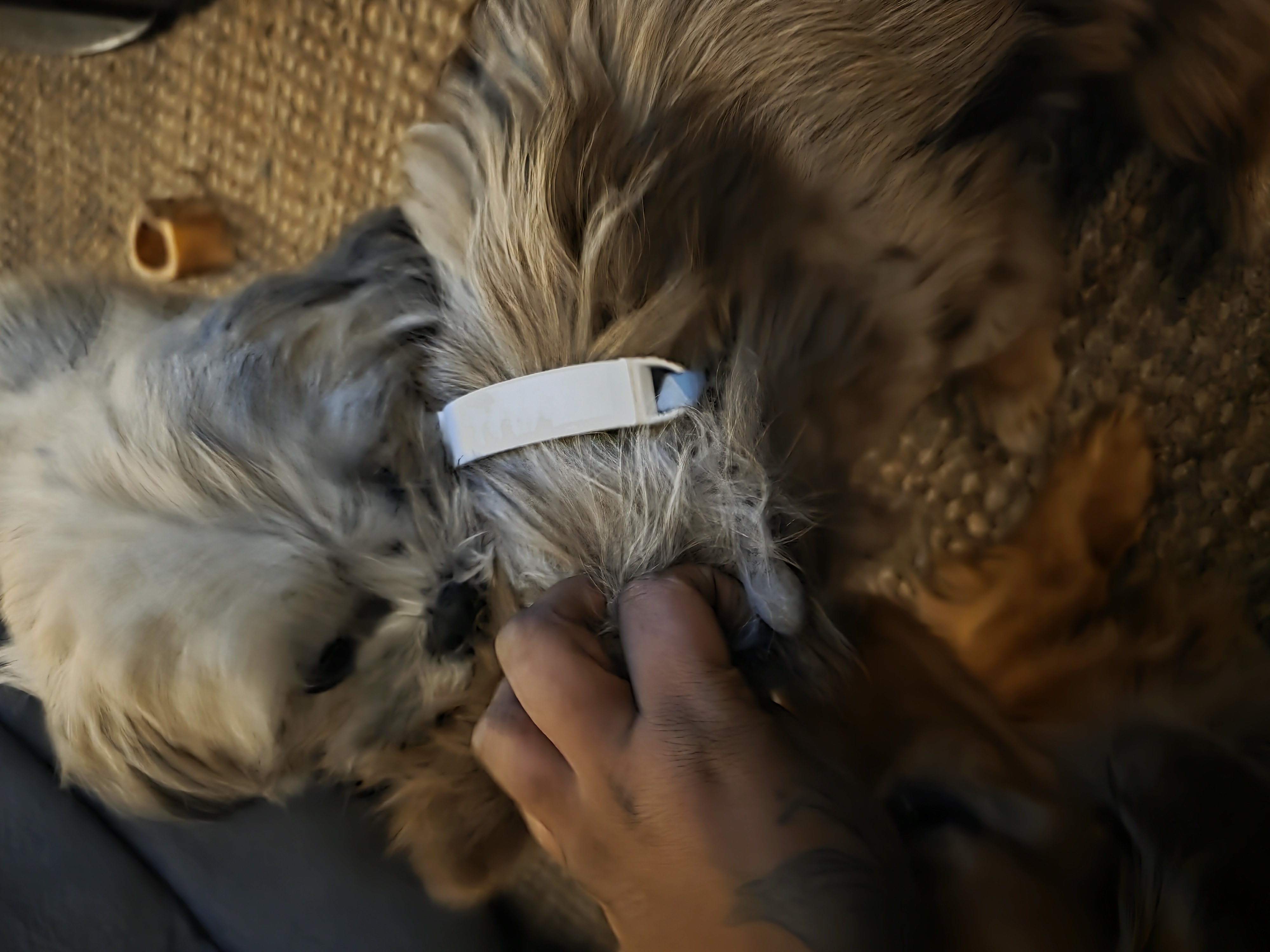 Cách gắn lên vòng cổ: luồn khóa (buckle) xuống qua một lỗ, để mặt trước của tag hướng về phía bạn, rồi luồn ngược lên qua lỗ thứ hai. Mong thông cảm cho mấy tấm hình chụp với chó nha, bé này không chịu đứng yên lâu.