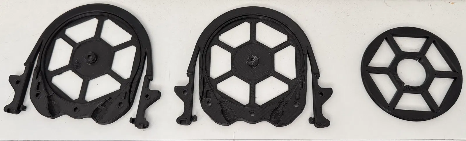 • Bánh xe được thiết kế lại thành một khối liền → Một mặt có phần phình ra nhỏ, mặt kia thì phẳng. Khi lắp ráp, mặt có phình ra đặt xuống dưới, tạo khoảng cách cần thiết, còn mặt phẳng giúp bộ phận trượt vào dễ dàng.