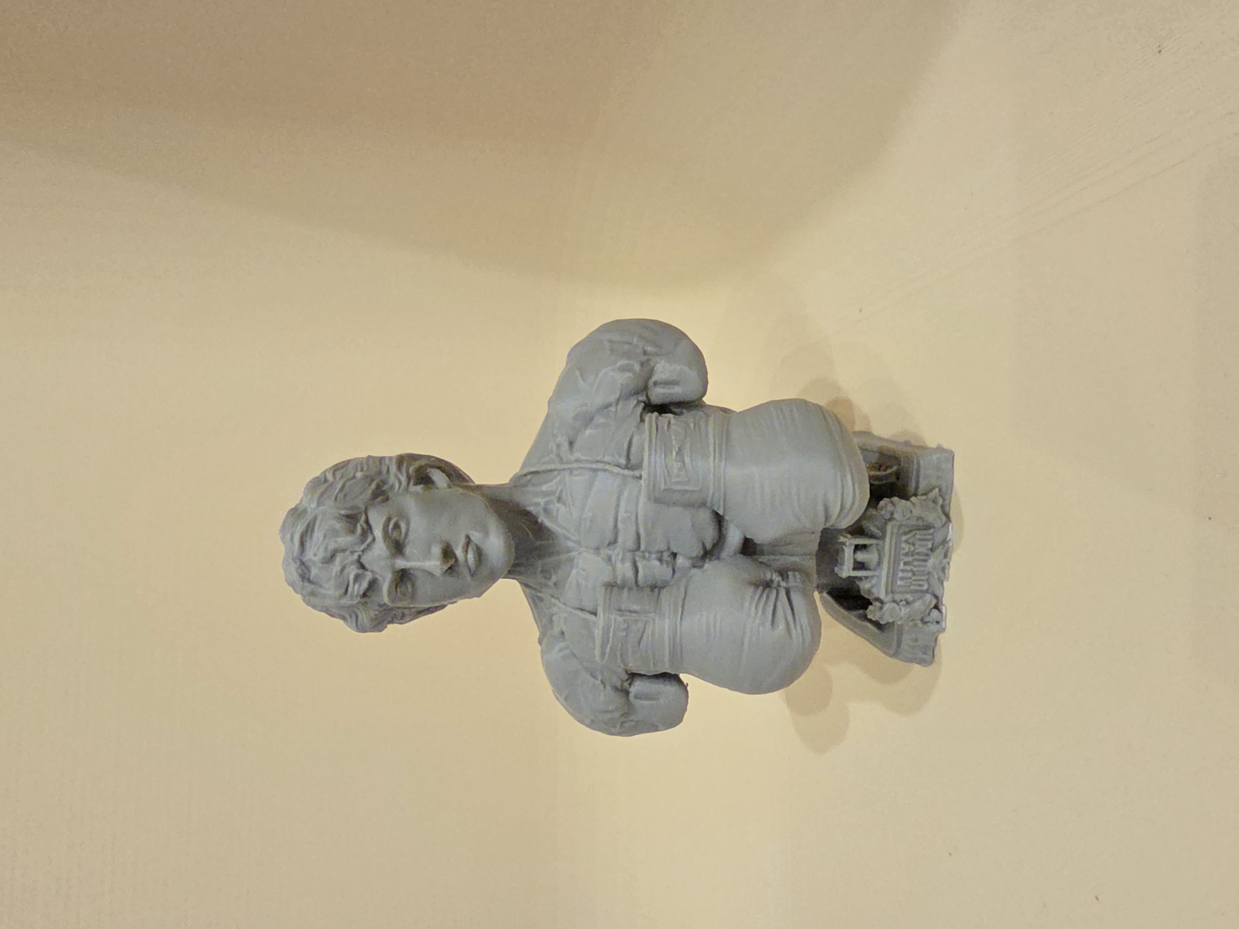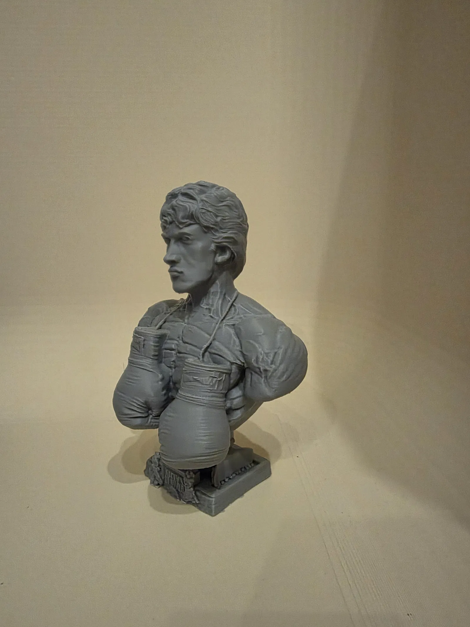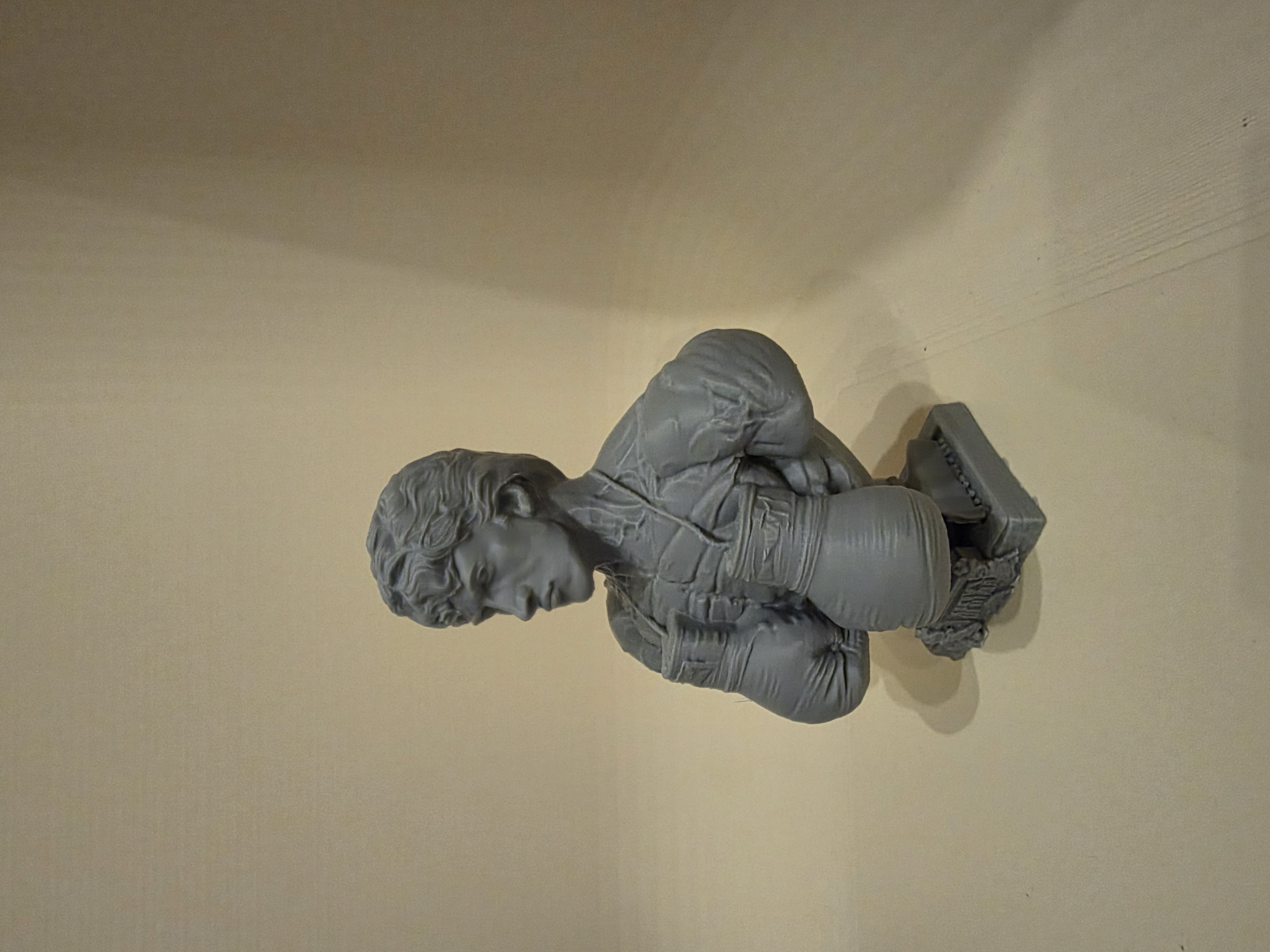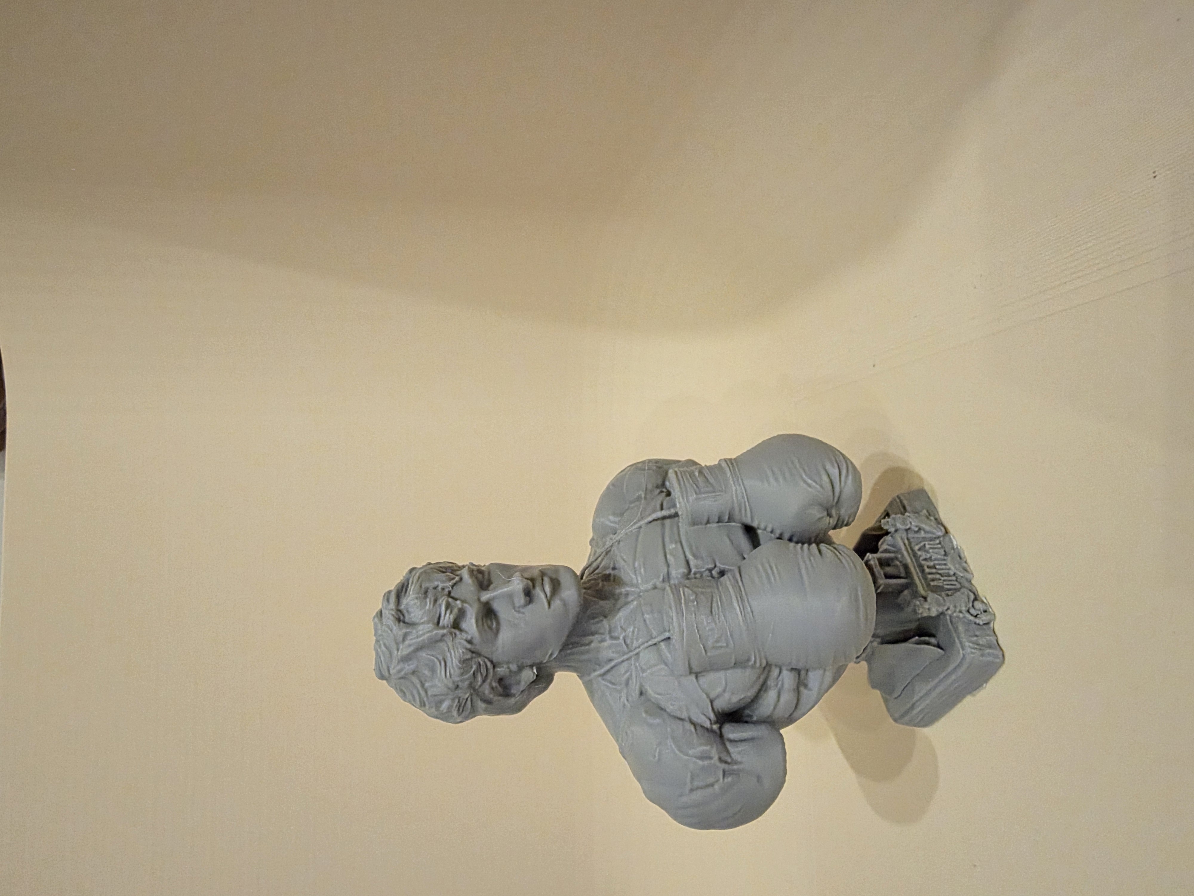 Phần trên của nhân vật gợi cảm giác như một tượng bust cổ điển — biểu cảm điềm tĩnh, đường nét rõ, tóc được điêu khắc kỹ — trong khi phần dưới chuyển dần sang đôi găng boxing phóng đại và phần bệ nổi bật với chữ WIN. Sự tương phản này nhấn mạnh hành trình của Rocky từ một tay đấm bình thường trở thành biểu tượng của sự bền gan và chiến thắng. Texture chi tiết cùng tỉ lệ dáng năng động khiến mẫu này rất bắt mắt để trưng bày.